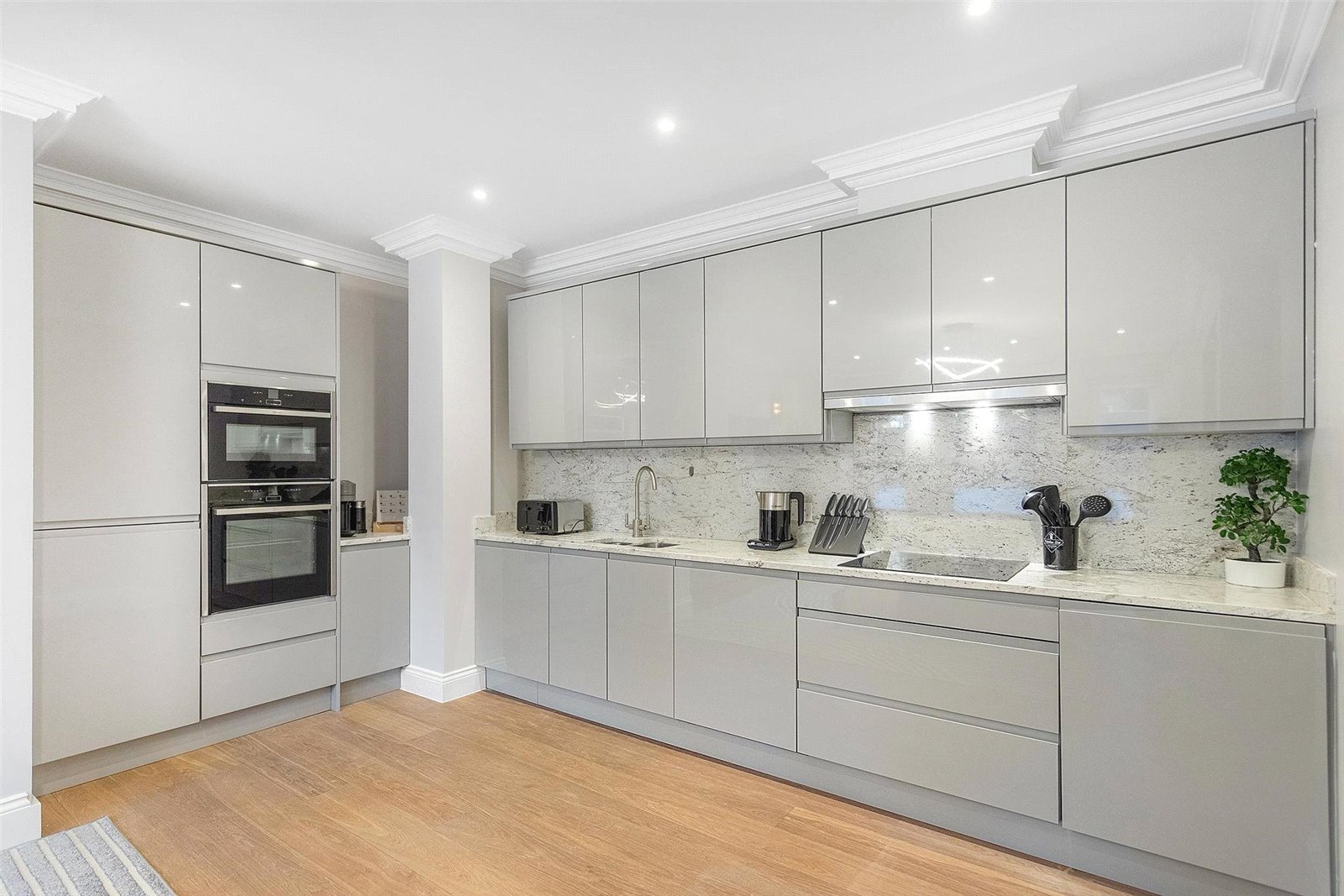 Boasting close to 1000 square feet, this ground floor duplex is a period conversion that exudes luxury and sophistication. Enter the lateral plan and be greeted by a spacious reception area and an open plan kitchen and dining space that provides access to the carefully manicured communal garden. Perfect for cooking, entertaining and relaxing, the bespoke kitchen design features soft closing doors and storage units, marble worktop and splashback, as well as integrated appliances including washing machine and tumble dryer. Additionally, the ground floor benefits from a guest WC and a storage room, embodying every aspect of modern living.