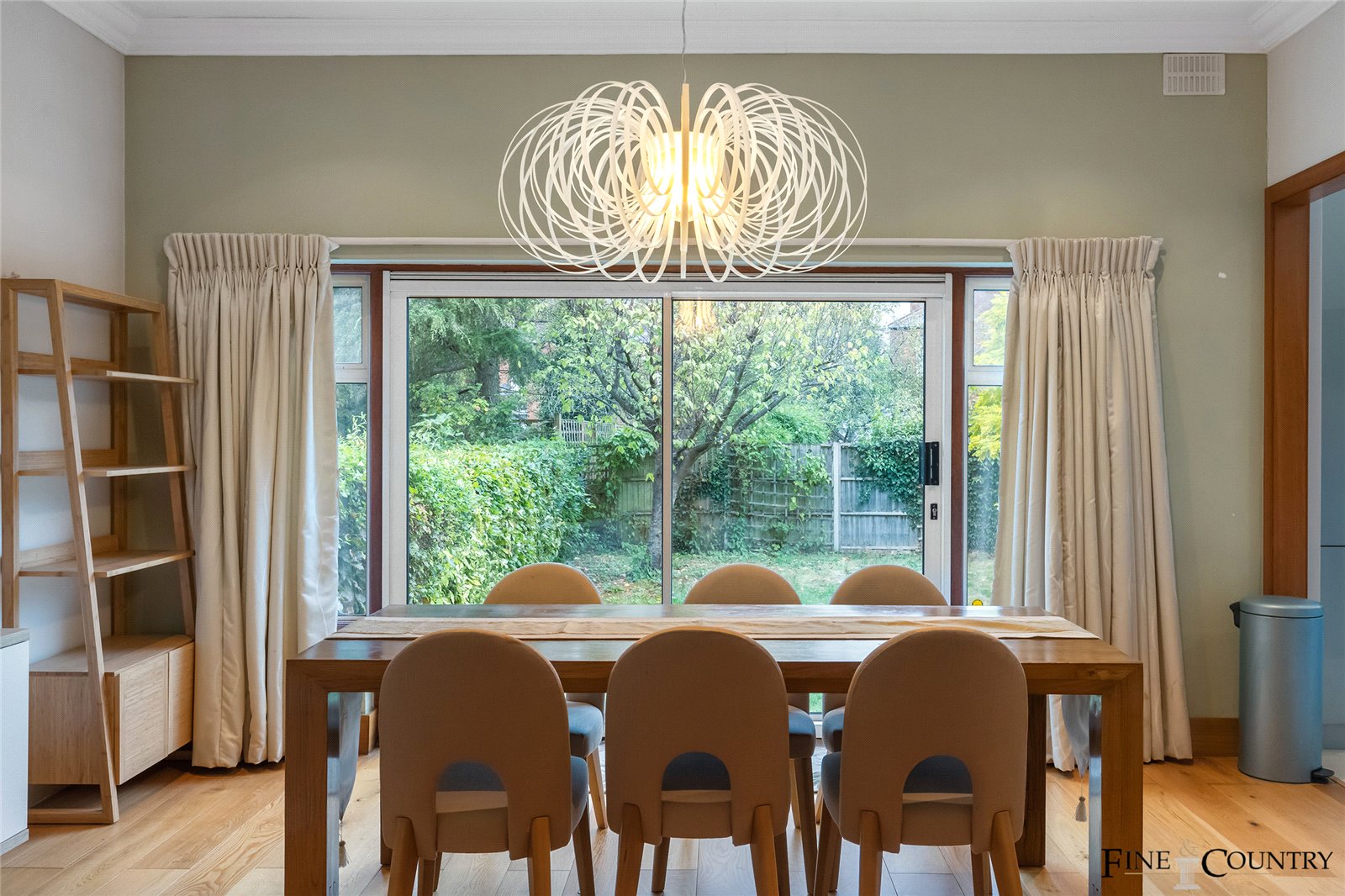 The spacious living room welcomes you with its high ceilings that accentuate the feeling of openness and grandeur. A beautifully mantled fireplace adds a touch of traditional charm, making it the perfect focal point for family gatherings or tranquil evenings. Natural light floods in through large windows, casting a warm glow across the well-appointed space. Adjacent to the living room, the dining area offers a sophisticated space for entertaining and family meals. Elegant doors open out to the expansive garden, allowing for an effortless indoor-outdoor flow that is ideal for hosting guests or enjoying peaceful afternoons amidst nature.