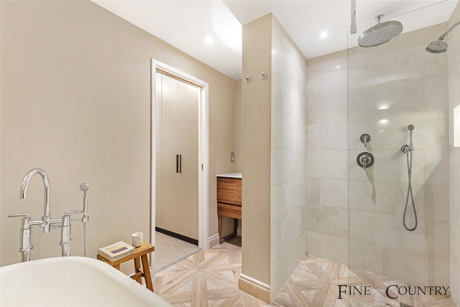 The main bathroom boasts opulent marble herringbone flooring, underfloor heating, a walk-in shower embellished with Waterworks fixtures, and an elegant black vanity crowned with Carrara marble. Throughout the apartment, Corston handles and switches add a touch of refined detailing.