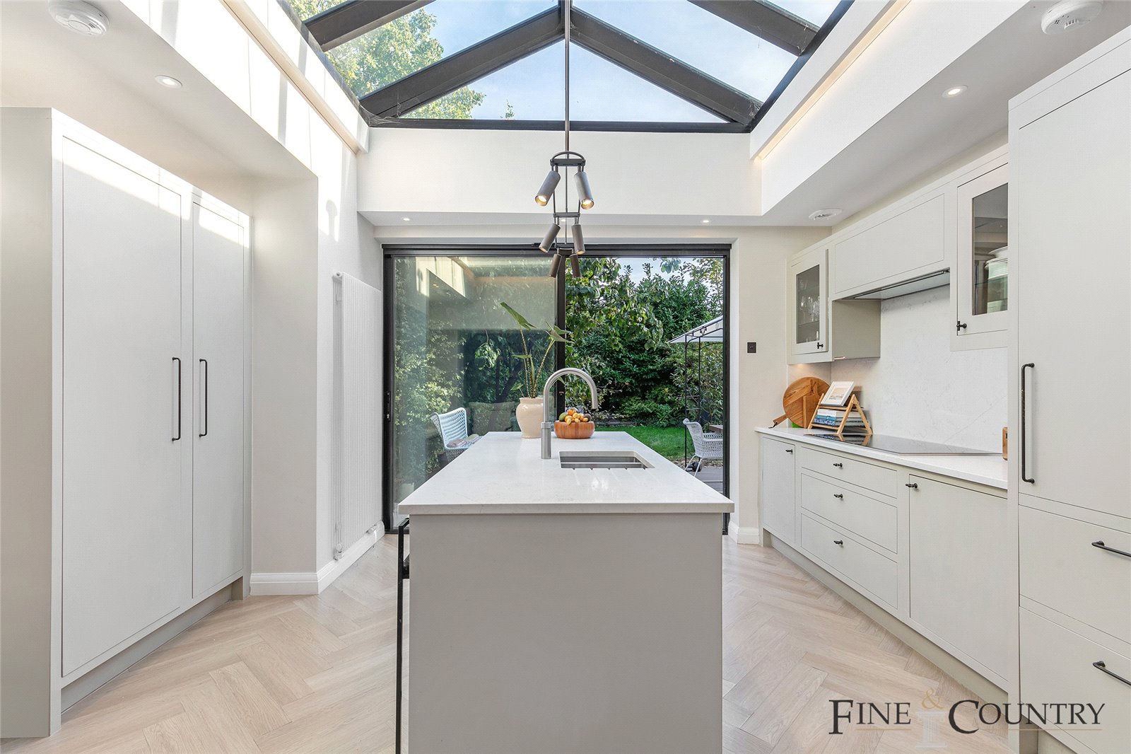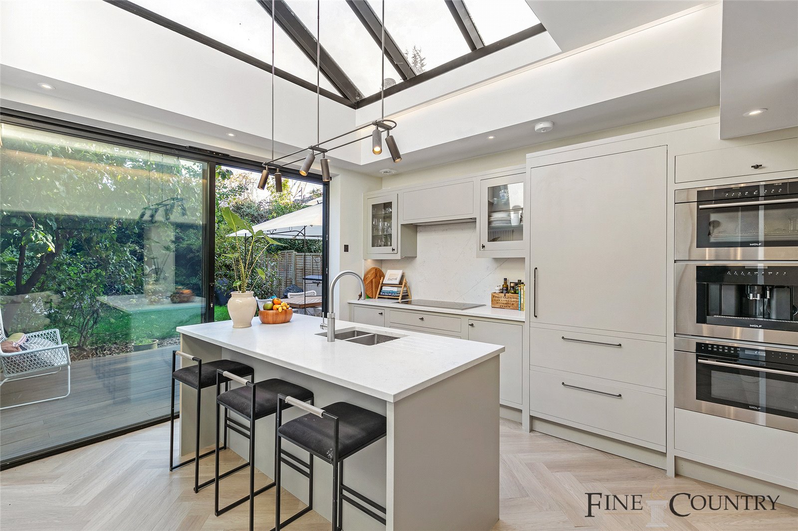 The luminous kitchen effortlessly extends into the garden, its charm unveiled through expansive floor-to-ceiling sliding doors. A magnificently crafted roof lantern adorned with bespoke light fixtures by J. Adams and Co serves as the centrepiece, flooding the room with an abundance of natural light. Mowlem and Co's warm neutral cabinetry conceals handcrafted oak dovetail drawers and top-of-the-line Wolf and Subzero appliances, while sleek quartz countertops and a matching plumbed-in kitchen island create a sociable and inviting atmosphere.