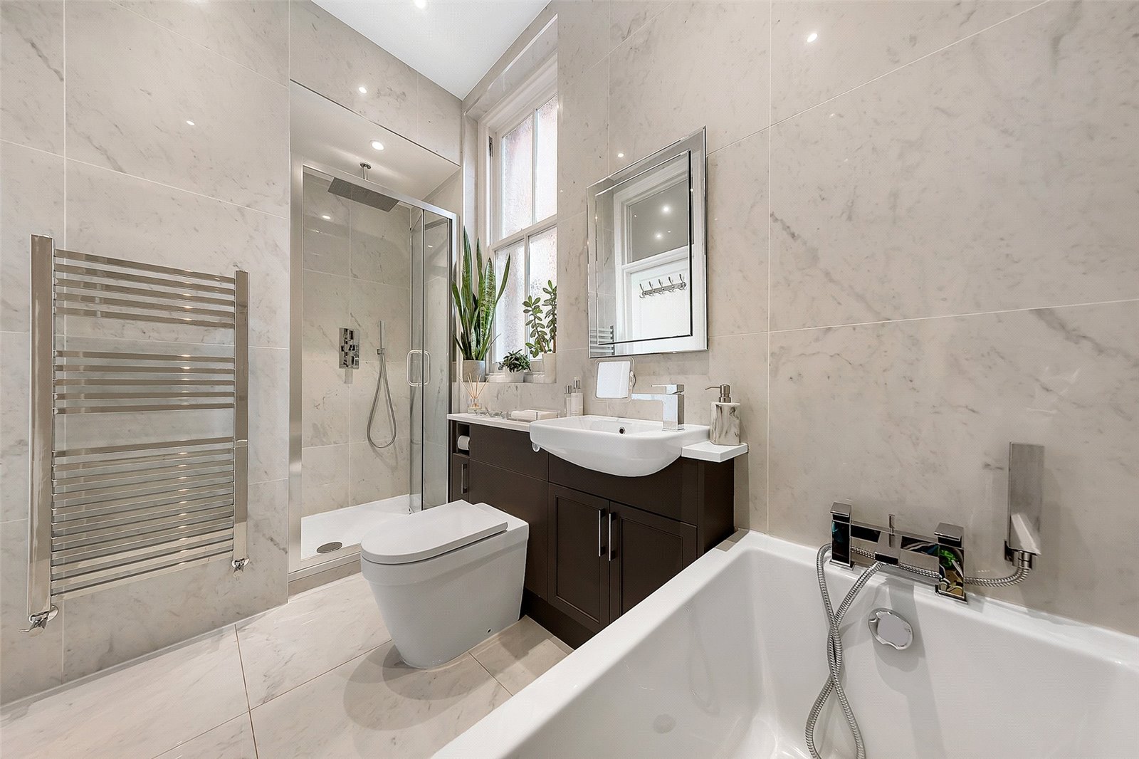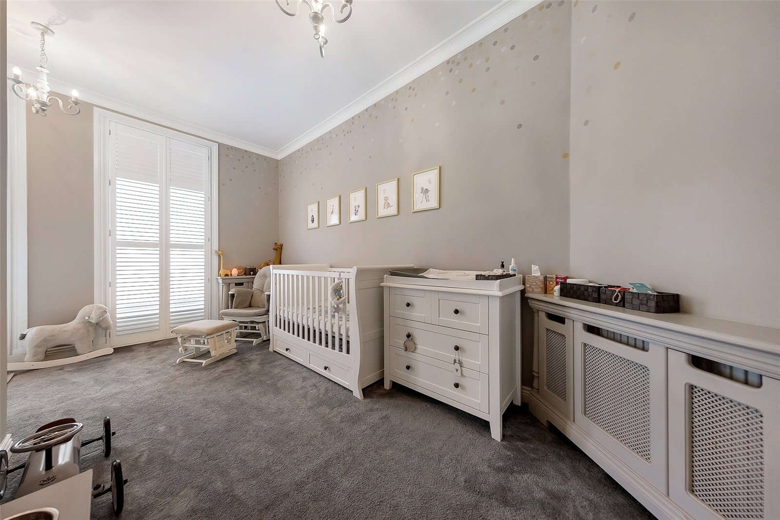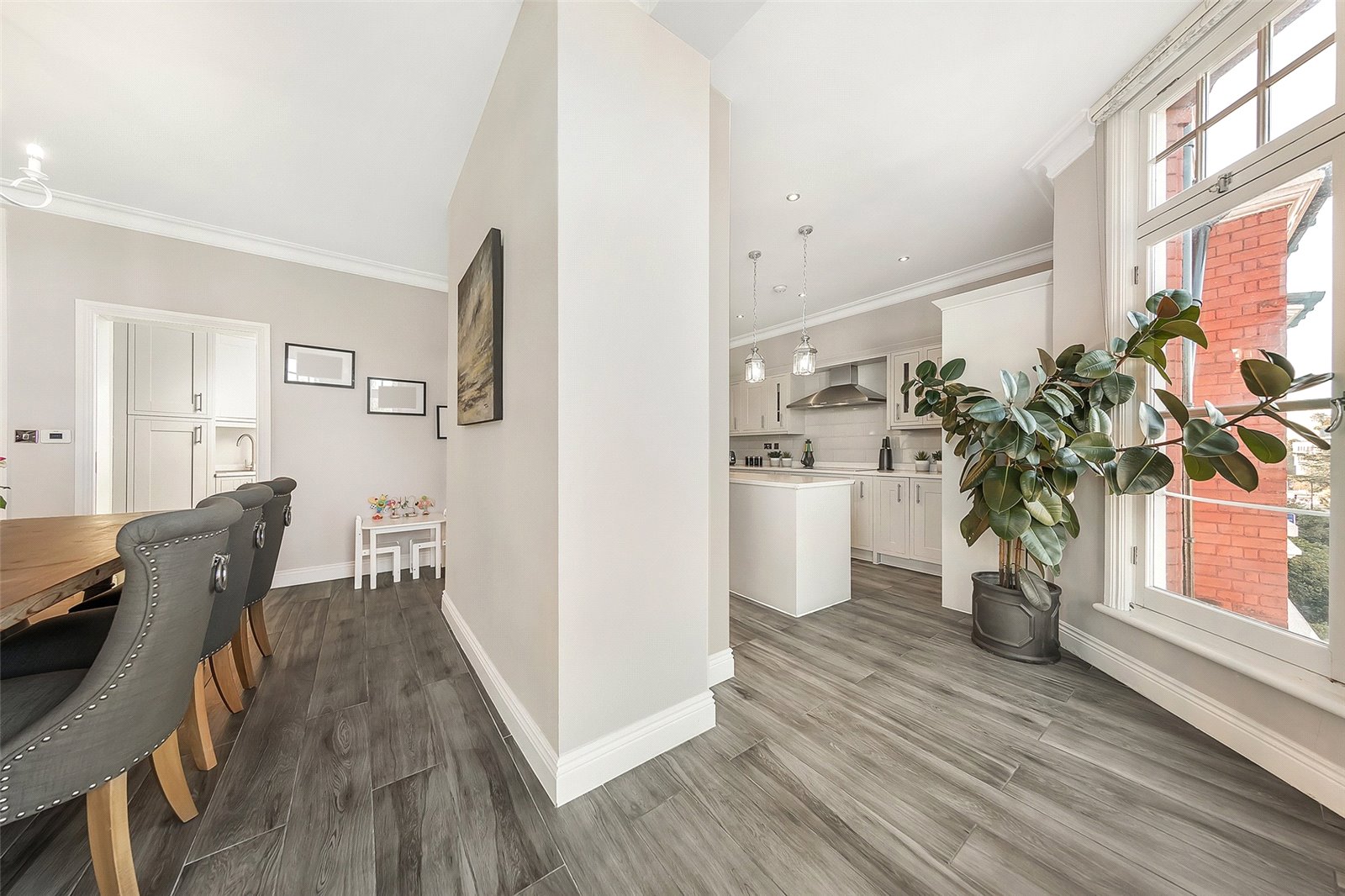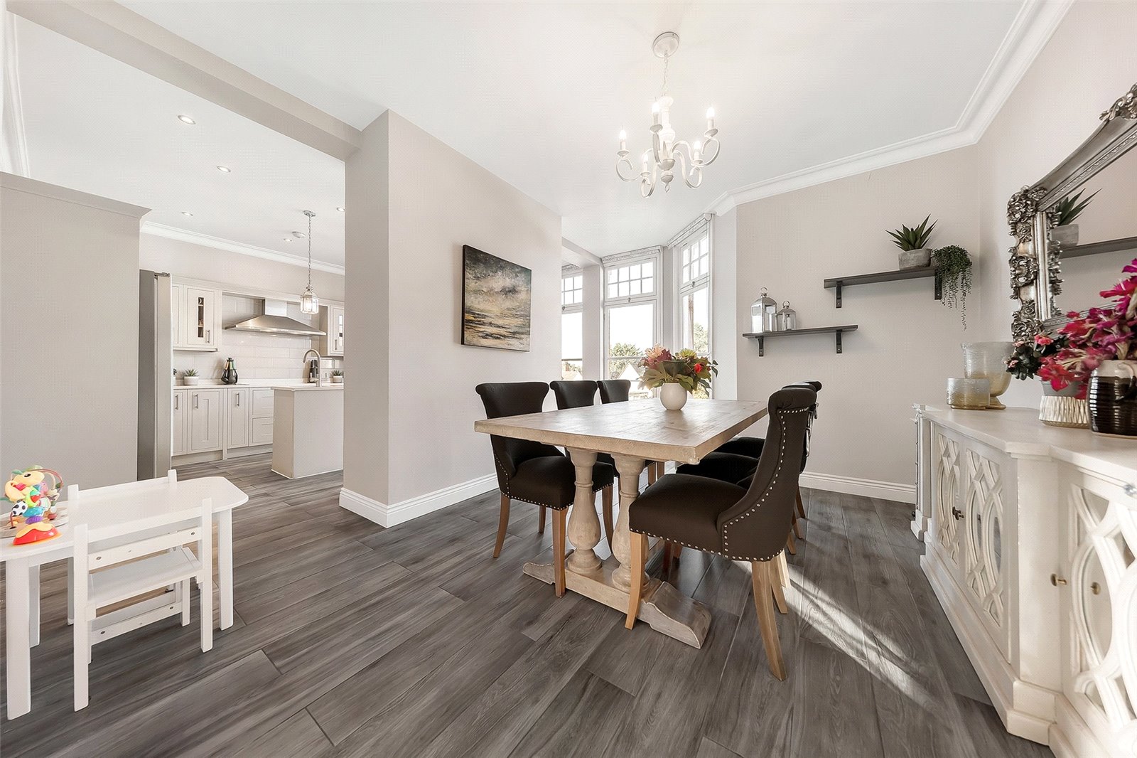 The apartment measures over 1800 sq. ft internally and is accessed via a wide communal stairwell. Entry is to an expansive lateral living comprising of three double bedrooms, a large reception room, two bathrooms and a separate study. The stunning and imposing stained-glass details have been extended into the front door frame creating an elegant entrance. You are immediately immersed into the characteristic period architectural style with high ceilings and wooden flooring which add a sense of cohesion and seamless transition. The plethora of high storage cupboards throughout are thoughtfully recessed, reducing shadows and highlighting the impressive volume and ceiling heights. The almost floor to ceiling bay windows reflect and enhance the abundance of light throughout. Additionally, for better heat efficiency and virtually no maintenance, the apartment benefits from underfloor heating throughout the hallway, kitchen, diner, bathrooms and the study room.