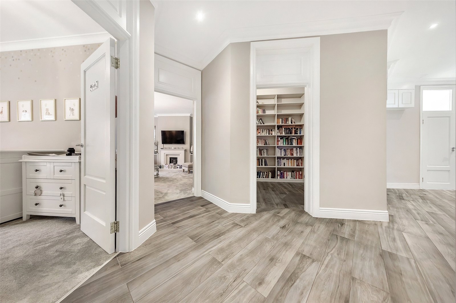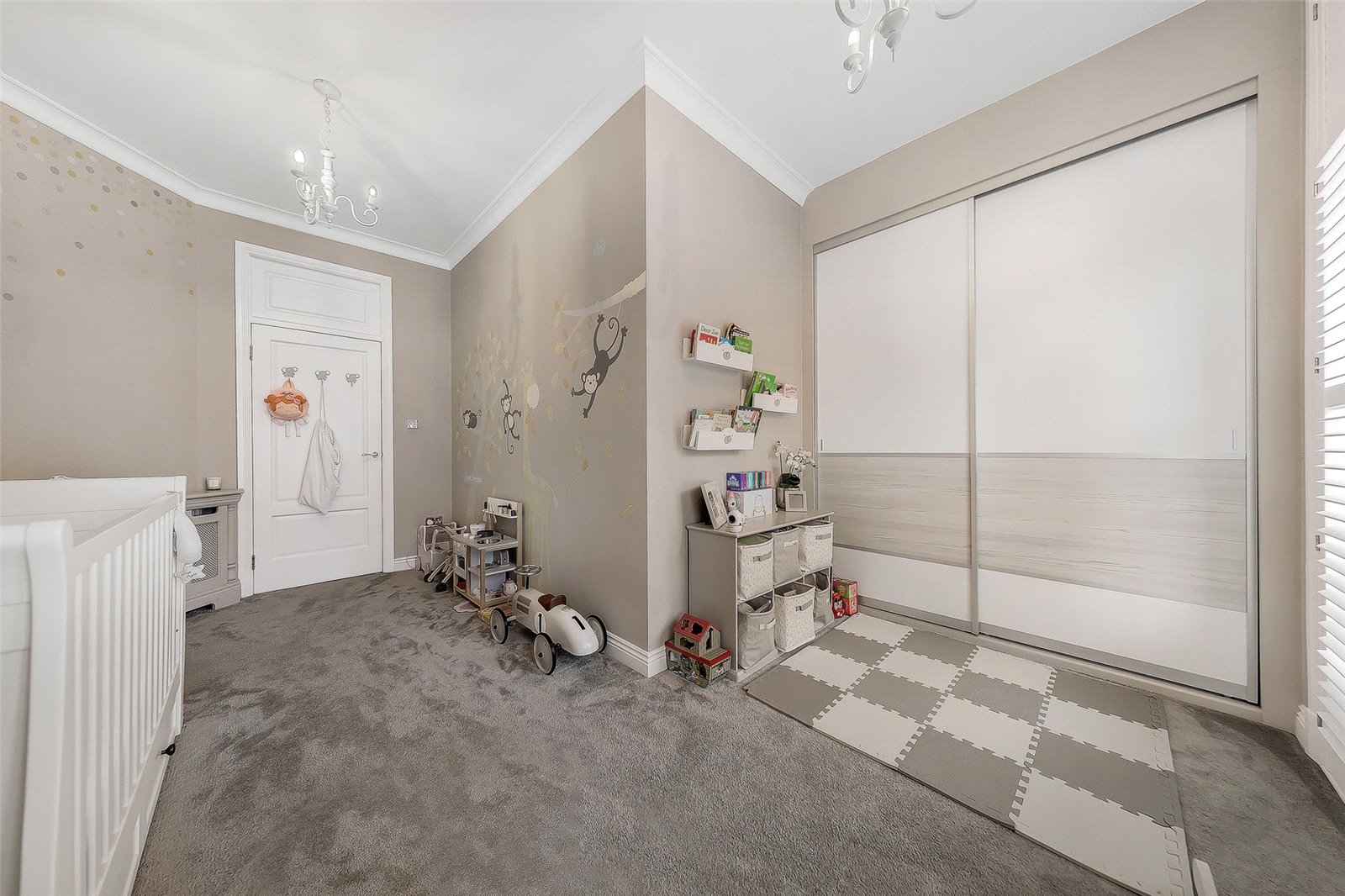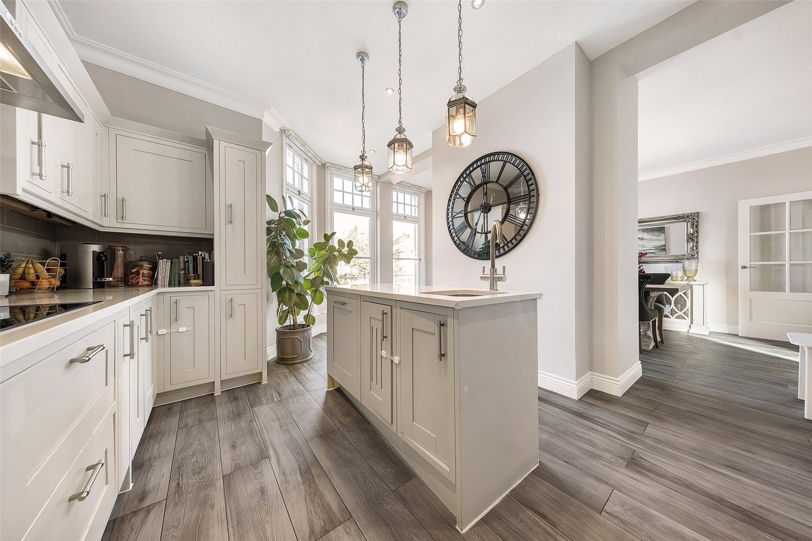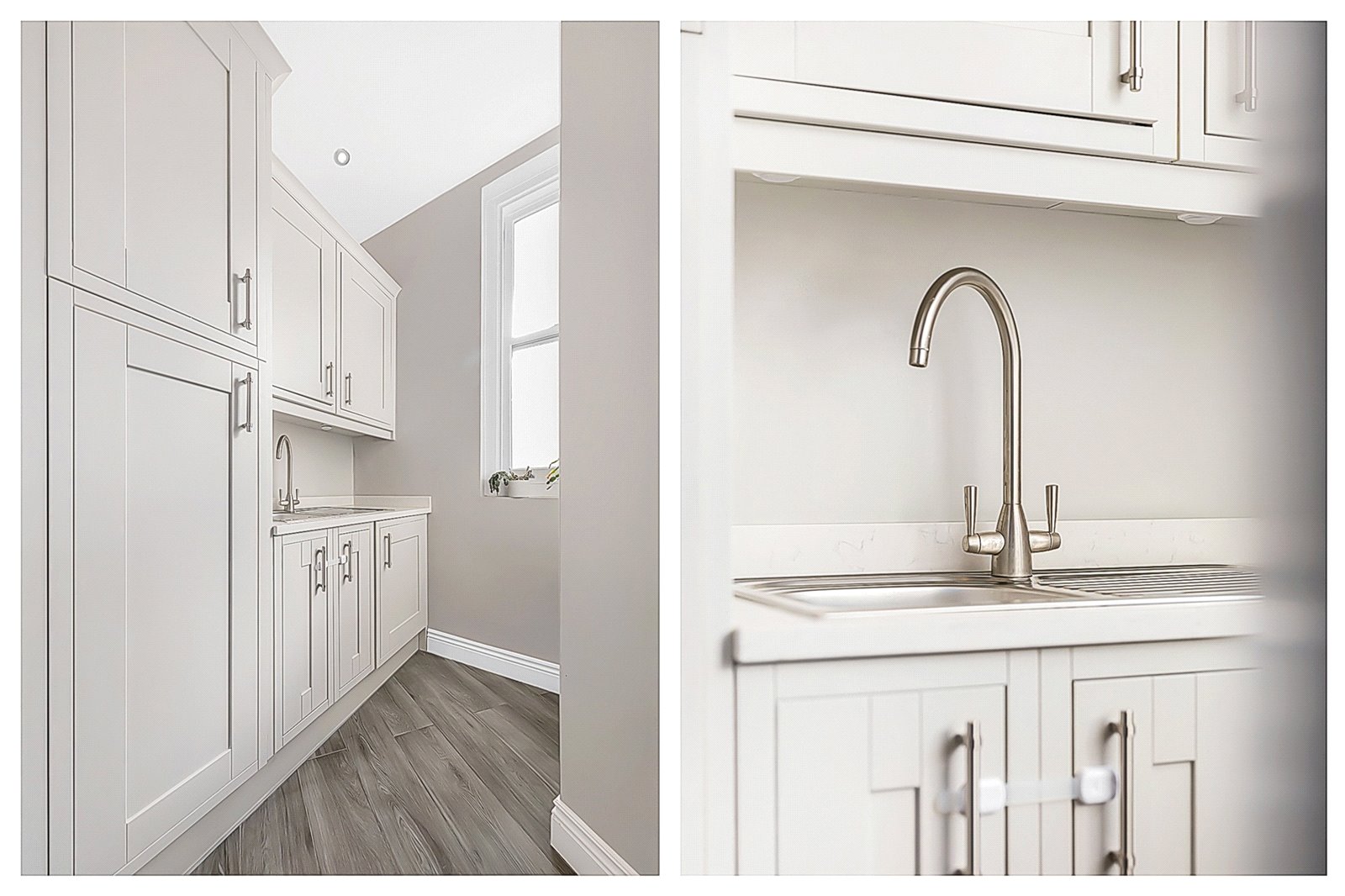 With wooden flooring continuing underfoot and across the hallway are the family bathroom and the open plan kitchen/dining equipped with a separate utility room. The shaker kitchen cabinets complement the quartz countertops and provide an elegant and modern design whilst maintaining a sense of traditionalism. The kitchen is completed with integrated appliances befitting of any modern home. The large bay windows allow the natural light to flood through, making the open-plan scheme perfect for family dinners and convivial gatherings.