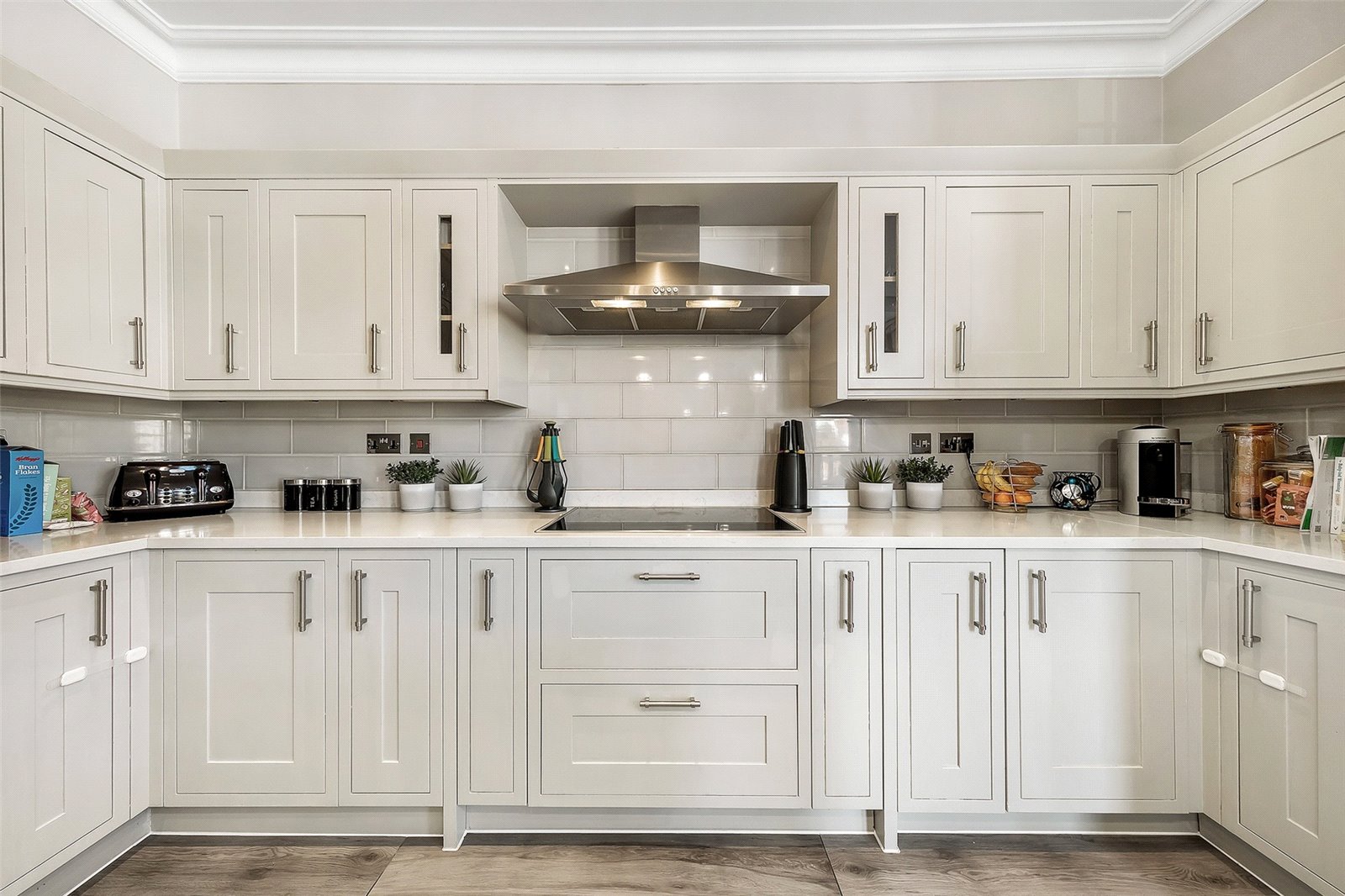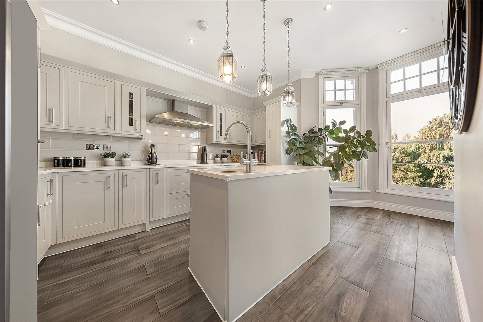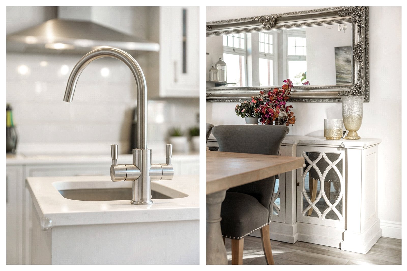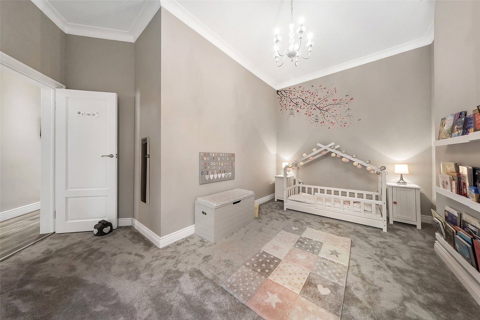 With wooden flooring continuing underfoot and across the hallway are the family bathroom and the open plan kitchen/dining equipped with a separate utility room. The shaker kitchen cabinets complement the quartz countertops and provide an elegant and modern design whilst maintaining a sense of traditionalism. The kitchen is completed with integrated appliances befitting of any modern home. The large bay windows allow the natural light to flood through, making the open-plan scheme perfect for family dinners and convivial gatherings.