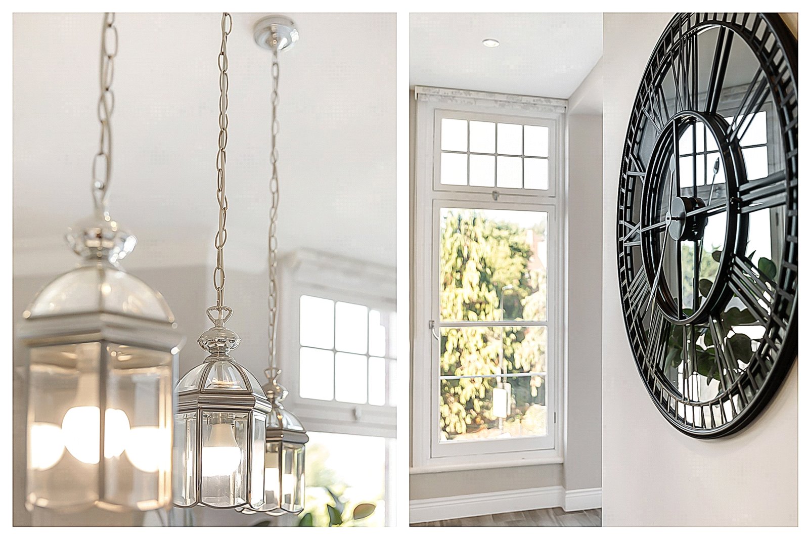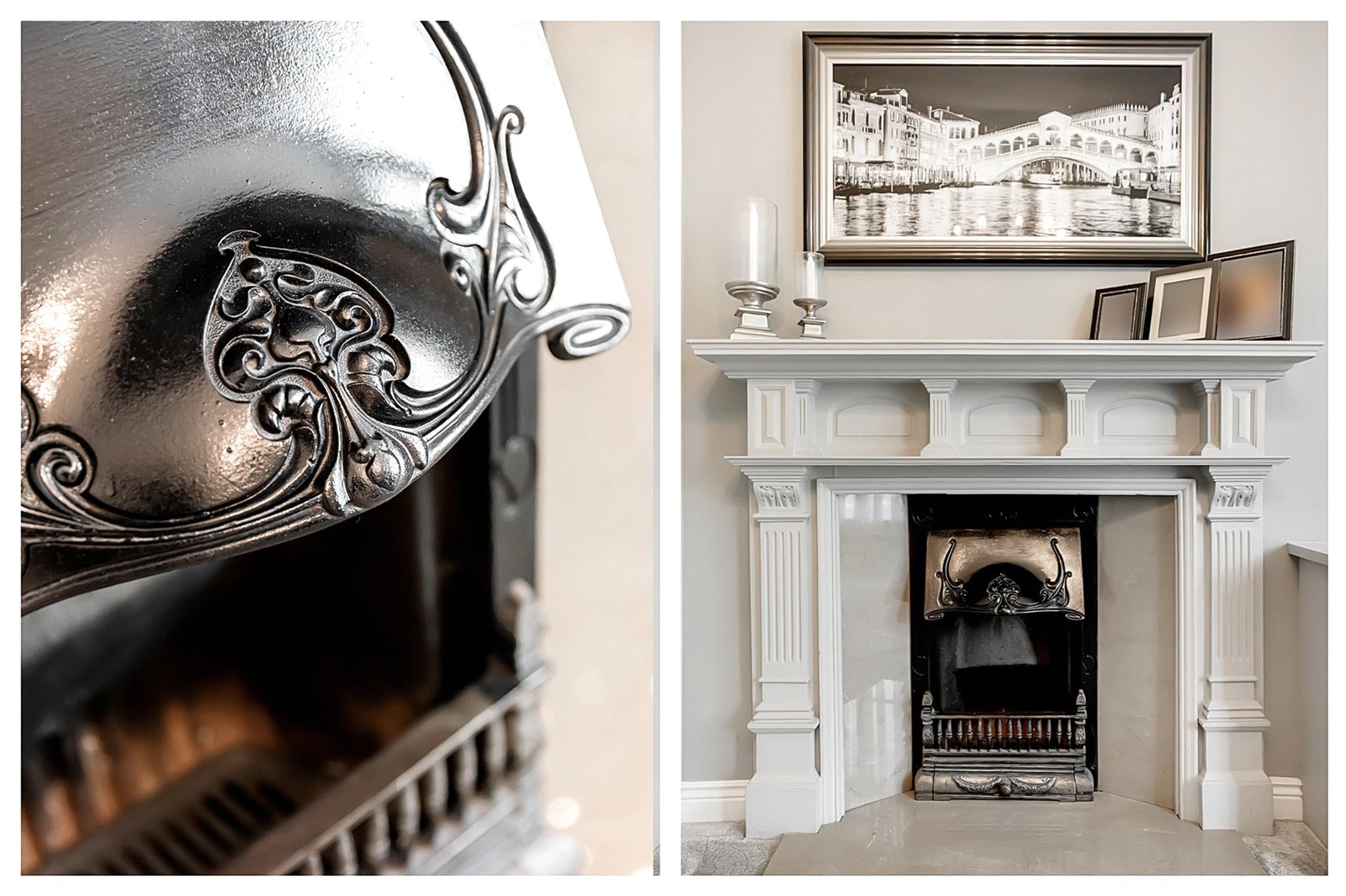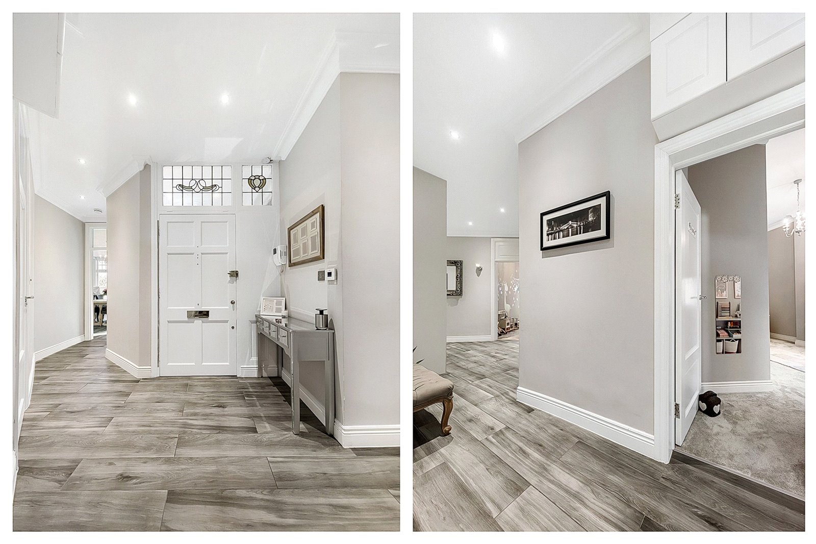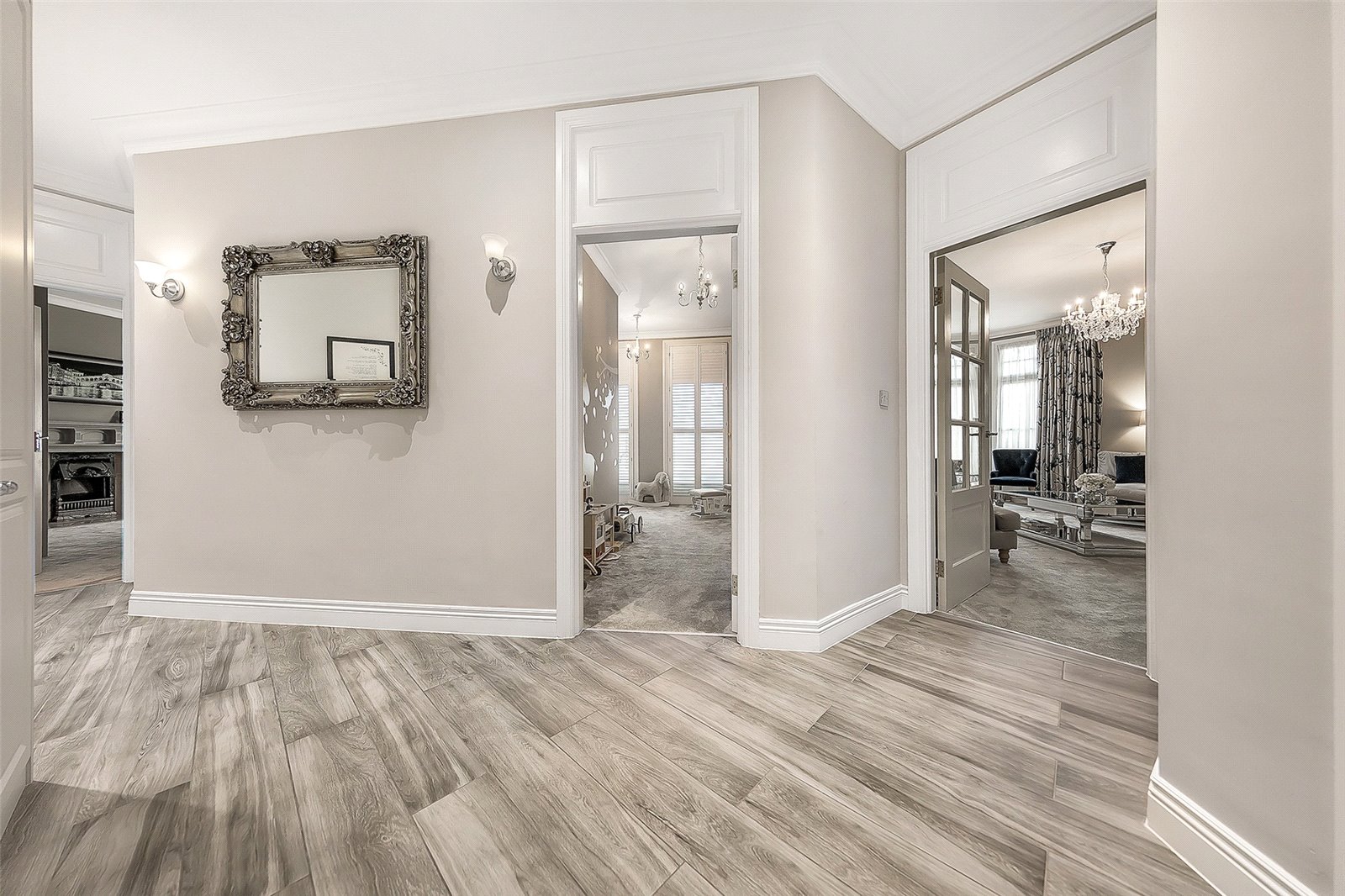 With wooden flooring continuing underfoot and across the hallway are the family bathroom and the open plan kitchen/dining equipped with a separate utility room. The shaker kitchen cabinets complement the quartz countertops and provide an elegant and modern design whilst maintaining a sense of traditionalism. The kitchen is completed with integrated appliances befitting of any modern home. The large bay windows allow the natural light to flood through, making the open-plan scheme perfect for family dinners and convivial gatherings.