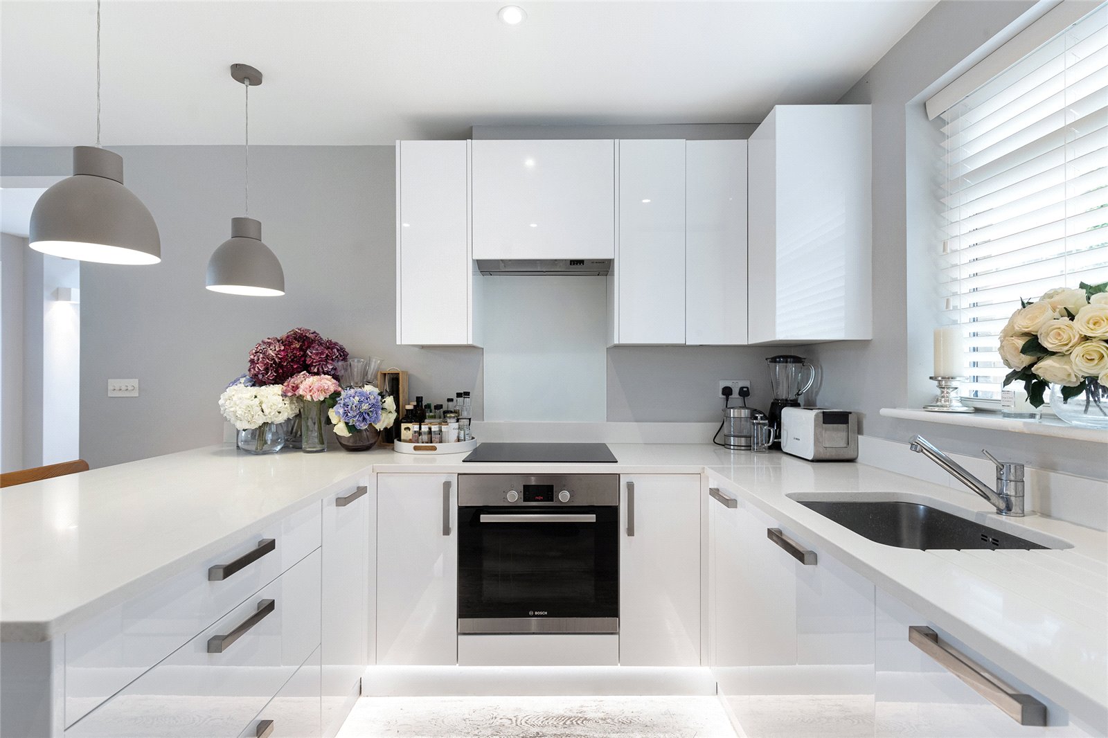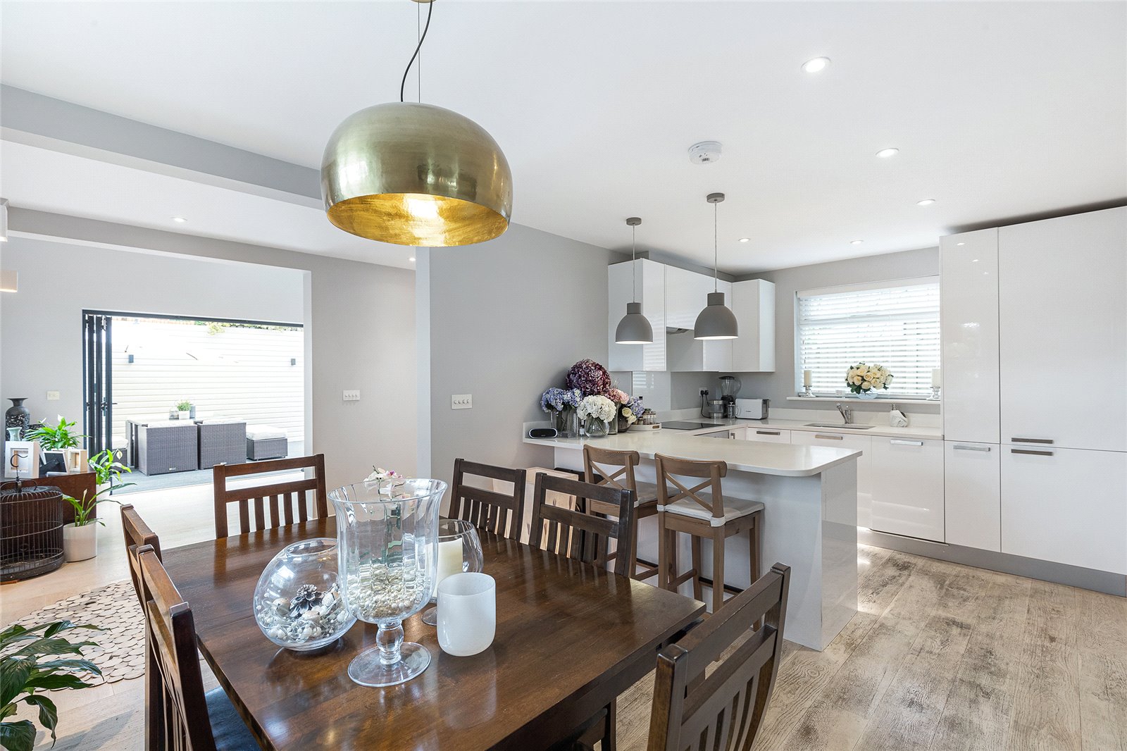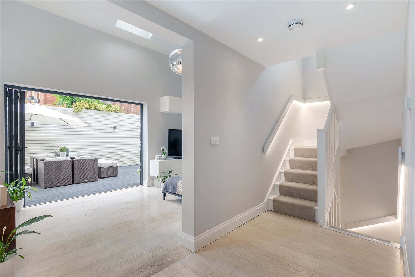 The ground floor sets the stage with a reception room and separate open plan kitchen and dining area. Enveloped in the warmth of wood flooring and tastefully adorned in a calming neutral colour palette, the reception room transforms into a sanctuary of natural light. Sunbeams gracefully filter through the expansive bifold sliding glass doors, unveiling uninterrupted views of the charming, decked garden. This seamless interplay of light effortlessly bathes the room, forging an unbroken connection with the idyllic outdoor surroundings, blurring the boundaries between interior and exterior spaces. A testament to both style and functionality, this space is complemented by a ceiling lightwell that further amplifies the luminosity, thanks to its impressive height exceeding 4.8 meters. This sense of spaciousness is effortlessly combined with exquisite feature lighting, creating an atmosphere of elegance. The separate kitchen and dining area, spanning over 17 feet, generously accommodates gatherings and family meals, while exuding a contemporary linear design and a timeless minimalist aesthetic. Equipped with integrated Bosch appliances, this culinary haven exemplifies modernity.