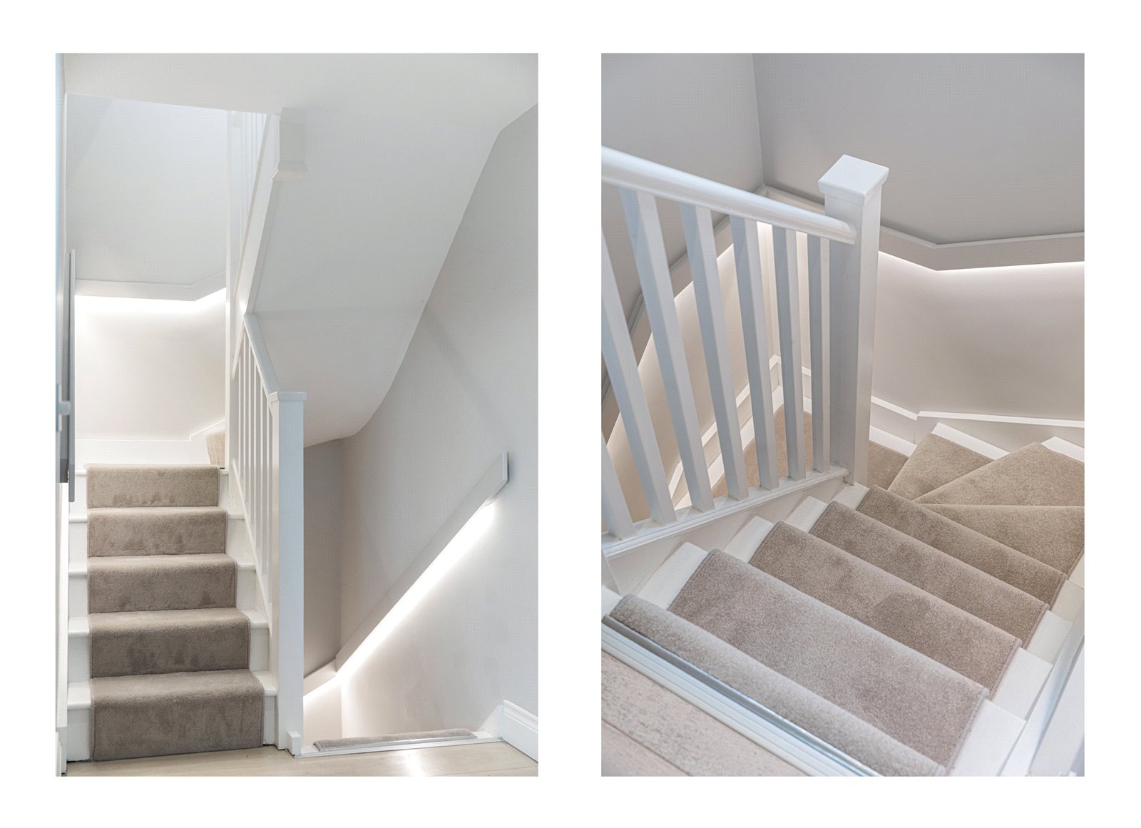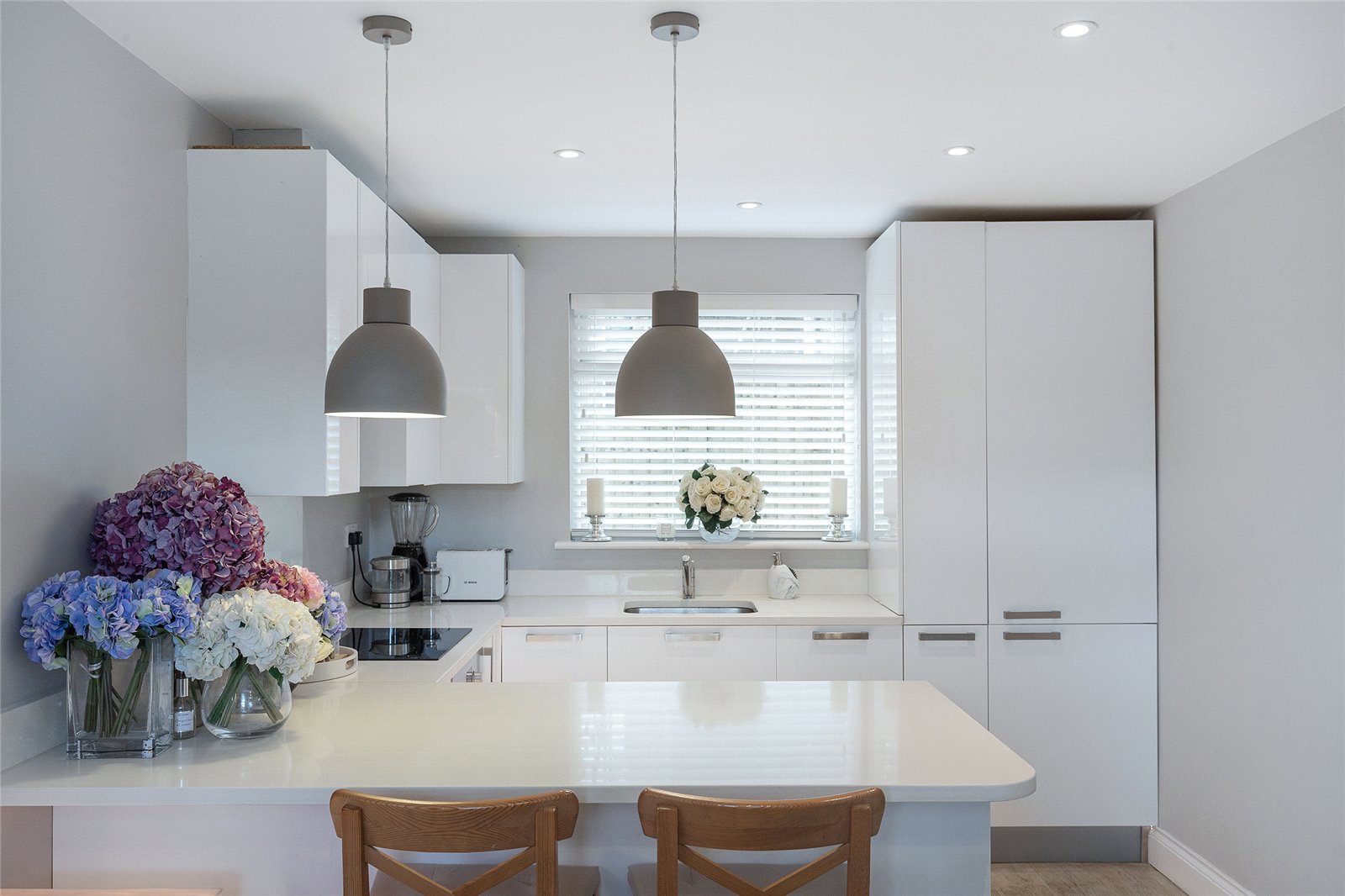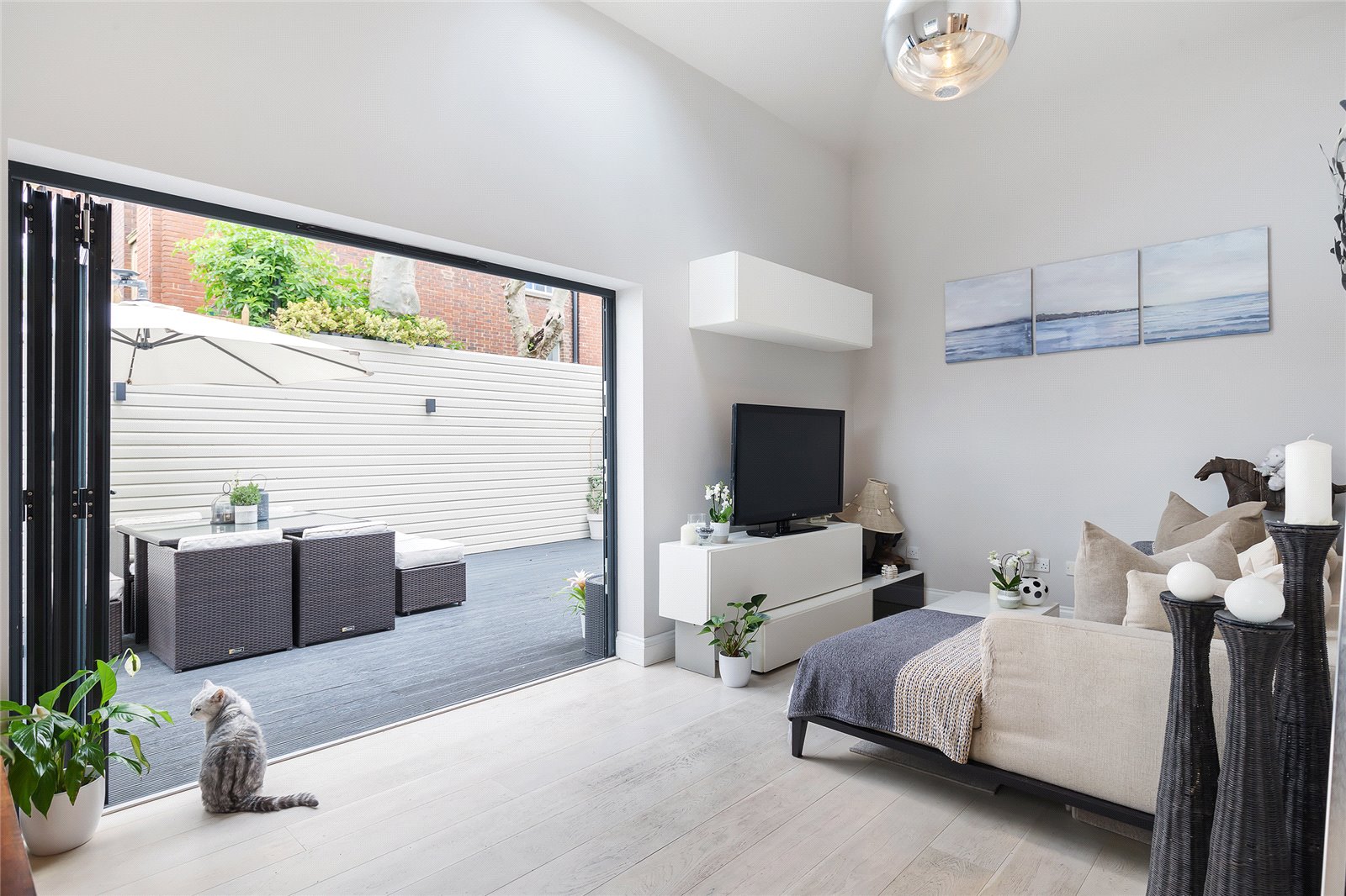 The ground floor sets the stage with a reception room and separate open plan kitchen and dining area. Enveloped in the warmth of wood flooring and tastefully adorned in a calming neutral colour palette, the reception room transforms into a sanctuary of natural light. Sunbeams gracefully filter through the expansive bifold sliding glass doors, unveiling uninterrupted views of the charming, decked garden. This seamless interplay of light effortlessly bathes the room, forging an unbroken connection with the idyllic outdoor surroundings, blurring the boundaries between interior and exterior spaces. A testament to both style and functionality, this space is complemented by a ceiling lightwell that further amplifies the luminosity, thanks to its impressive height exceeding 4.8 meters. This sense of spaciousness is effortlessly combined with exquisite feature lighting, creating an atmosphere of elegance. The separate kitchen and dining area, spanning over 17 feet, generously accommodates gatherings and family meals, while exuding a contemporary linear design and a timeless minimalist aesthetic. Equipped with integrated Bosch appliances, this culinary haven exemplifies modernity.