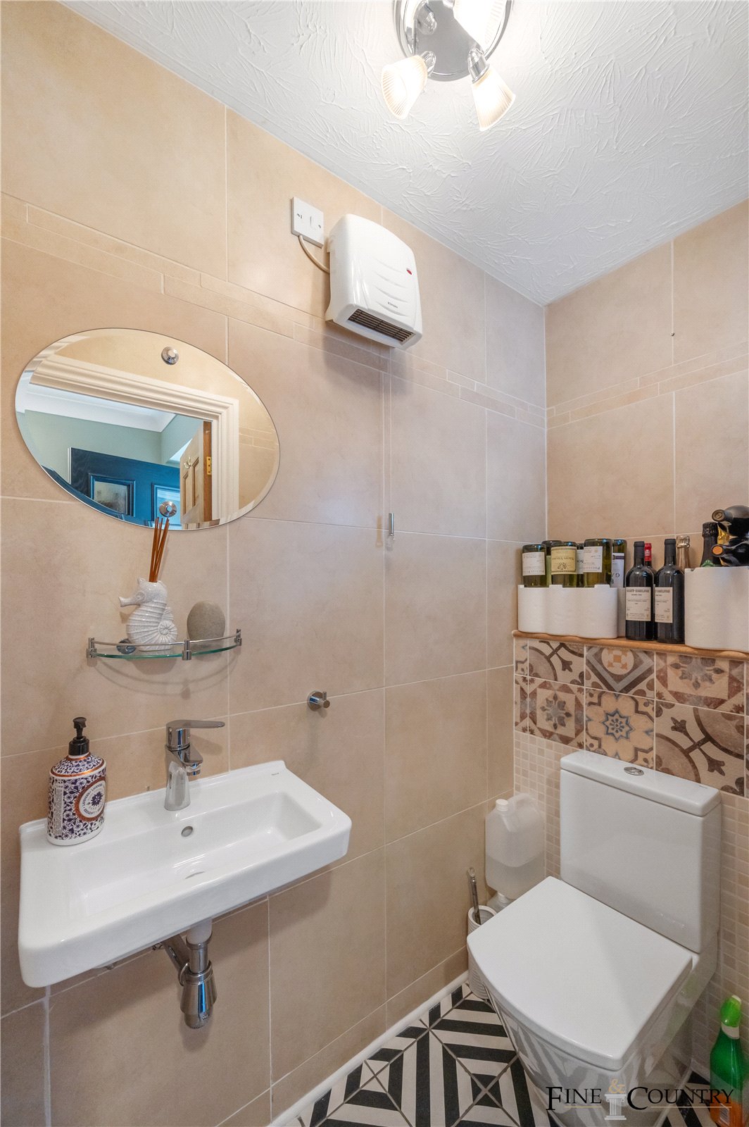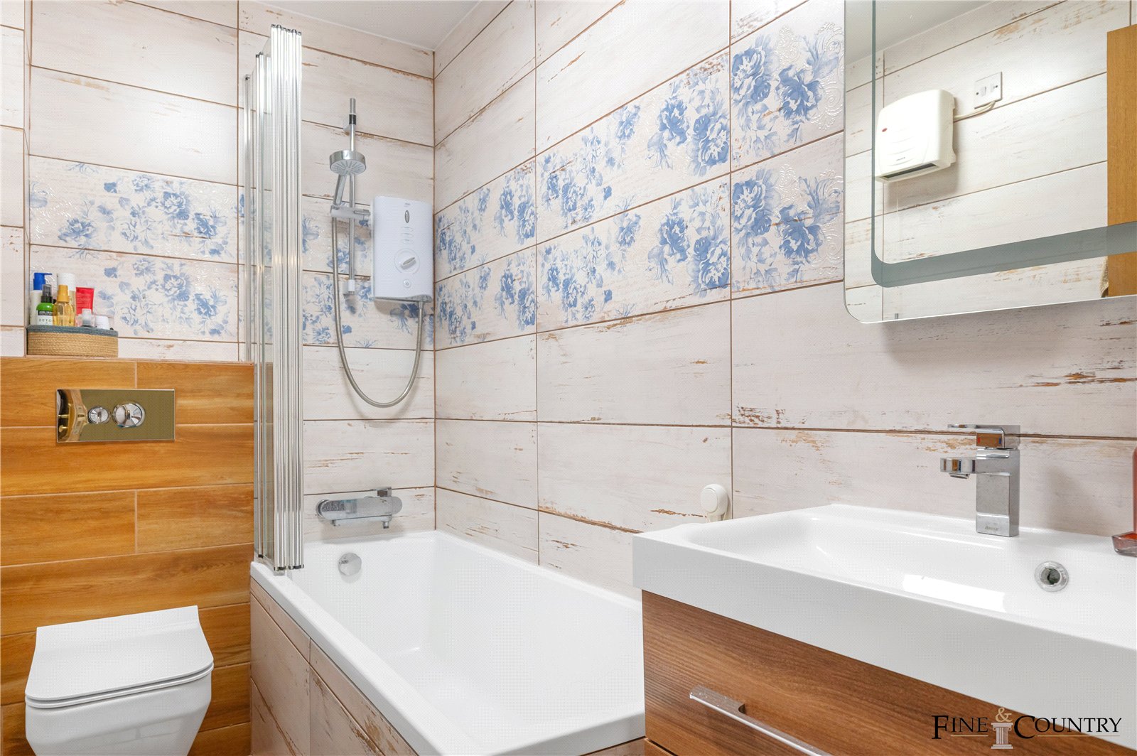 Completing the upper floor, the family bathroom is a masterclass in blending practical design with aesthetic charm. It boasts rustic yet refined wall tiles decorated with a classic blue floral pattern that strikingly contrasts against the smooth, wood-like floor tiles. The pristine white bathroom fixtures, including a deep bathtub and a sleek, modern washbasin, are enhanced by contemporary fittings, creating an environment that is both serene and functional.