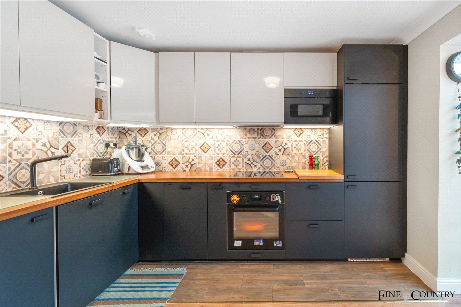 The kitchen is a showcase of modern design and functionality, featuring stylish IKEA cabinetry and durable walnut wood countertops. The working area is defined by tastefully tiled flooring, which transitions into laminate as it merges with the dining and living areas, maintaining a unified aesthetic throughout. Integrated appliances, including a high-efficiency RENLIG washing machine and an OTROLIG induction hob, are seamlessly incorporated, maximising space, style, and practicality. The layout fosters a sociable cooking and dining environment, with large glass doors opening out to the garden, further enhancing the rooms open and airy feel.