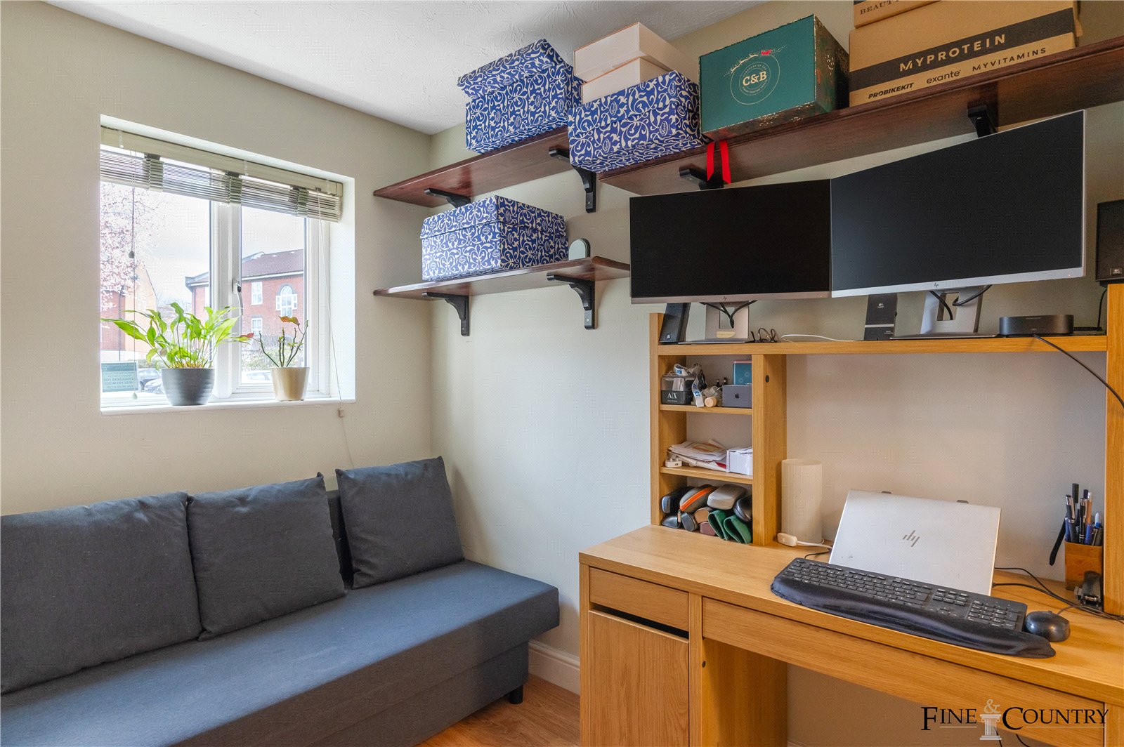 Adjacent to the bedrooms, the study functions as a dynamic home office. It is characterised by a large window that floods the space with natural light, underscoring the efficient use of space with built-in shelving and a desk setup. This room adapts flexibly to the residents needs, serving either as an office or a quiet retreat.