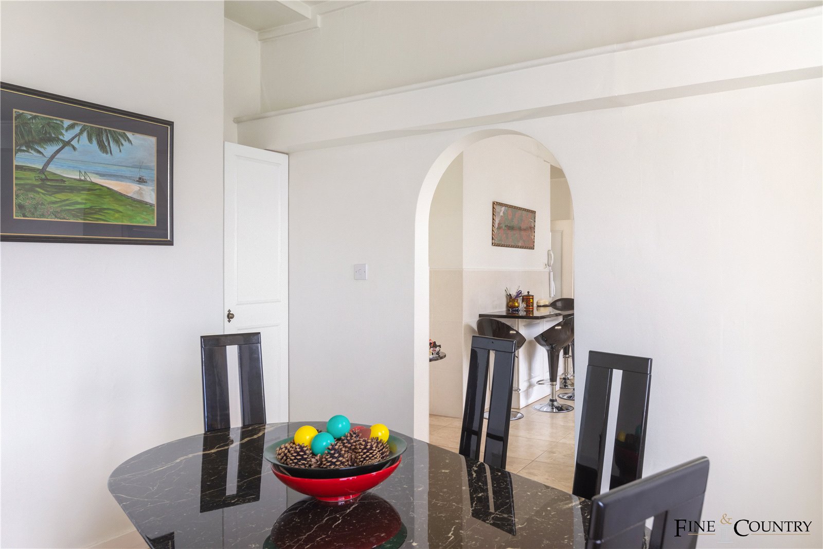 The flow into the kitchen is seamless, where functionality meets style. The kitchen is equipped with high-quality fixtures and integrated modern appliances, nestled within cabinetry that echoes the apartment's period charm. Adjoining the kitchen, the dining area provides a splendid view of the surroundings through its well-placed windows, offering a perfect backdrop for meals.