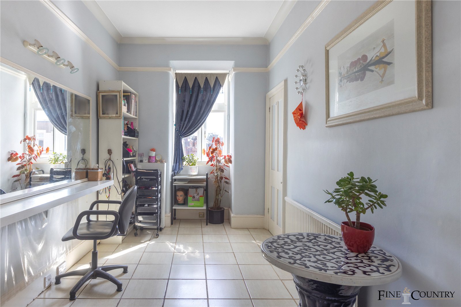 Entering the apartment, one is greeted by a spacious entrance hall that sets a tone of classic sophistication. As we move through the living spaces, the attention to detail in preserving the original features while ensuring they meet contemporary standards is evident. The reception room, characterized by its curved wall and detailed cornicing, showcases the apartment's distinctive charm, and serves as an adaptable space for both contemporary and classic styles of decor. The reception area itself is spacious and filled with natural light streaming in from large bay windows, providing a lavish living space that is both inviting and luxurious. The high ceilings, a hallmark of this architectural period, amplify the room's openness and grandeur, creating the perfect environment for both vibrant social gatherings and peaceful relaxation.