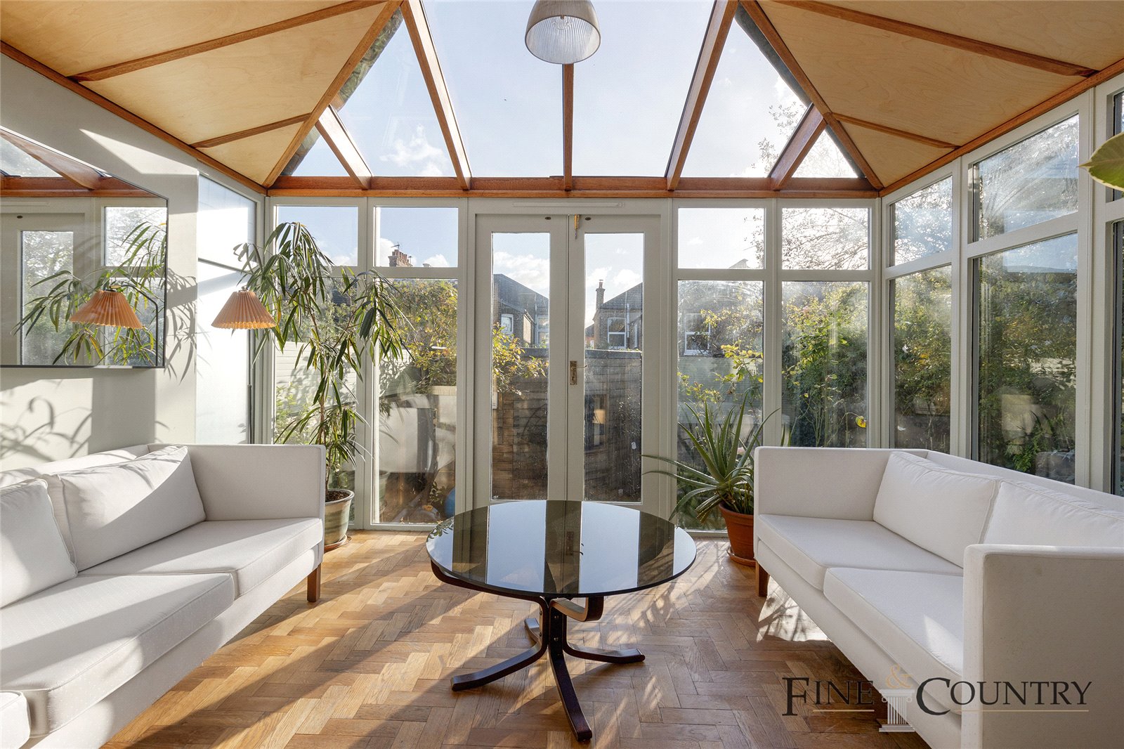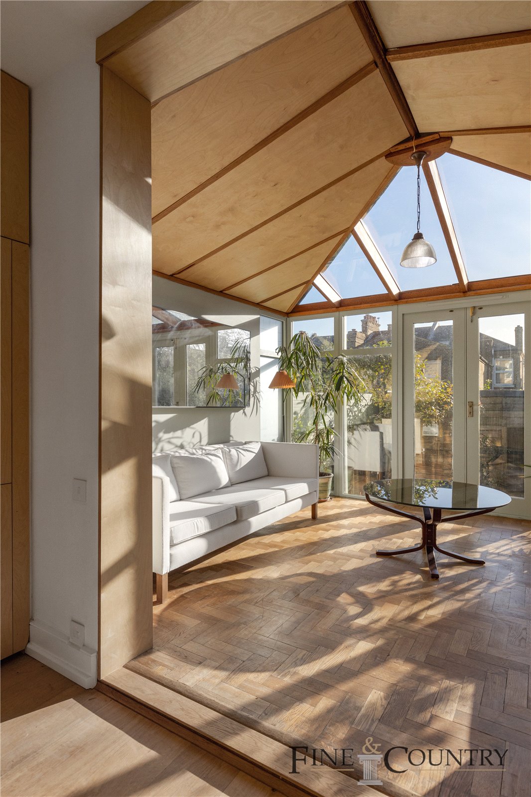 The conservatory features reclaimed parquet flooring from Cambridge University, with French doors that open directly into the garden. This thoughtful layout fosters a sense of continuity between indoor and outdoor spaces, creating a serene spot to enjoy the changing