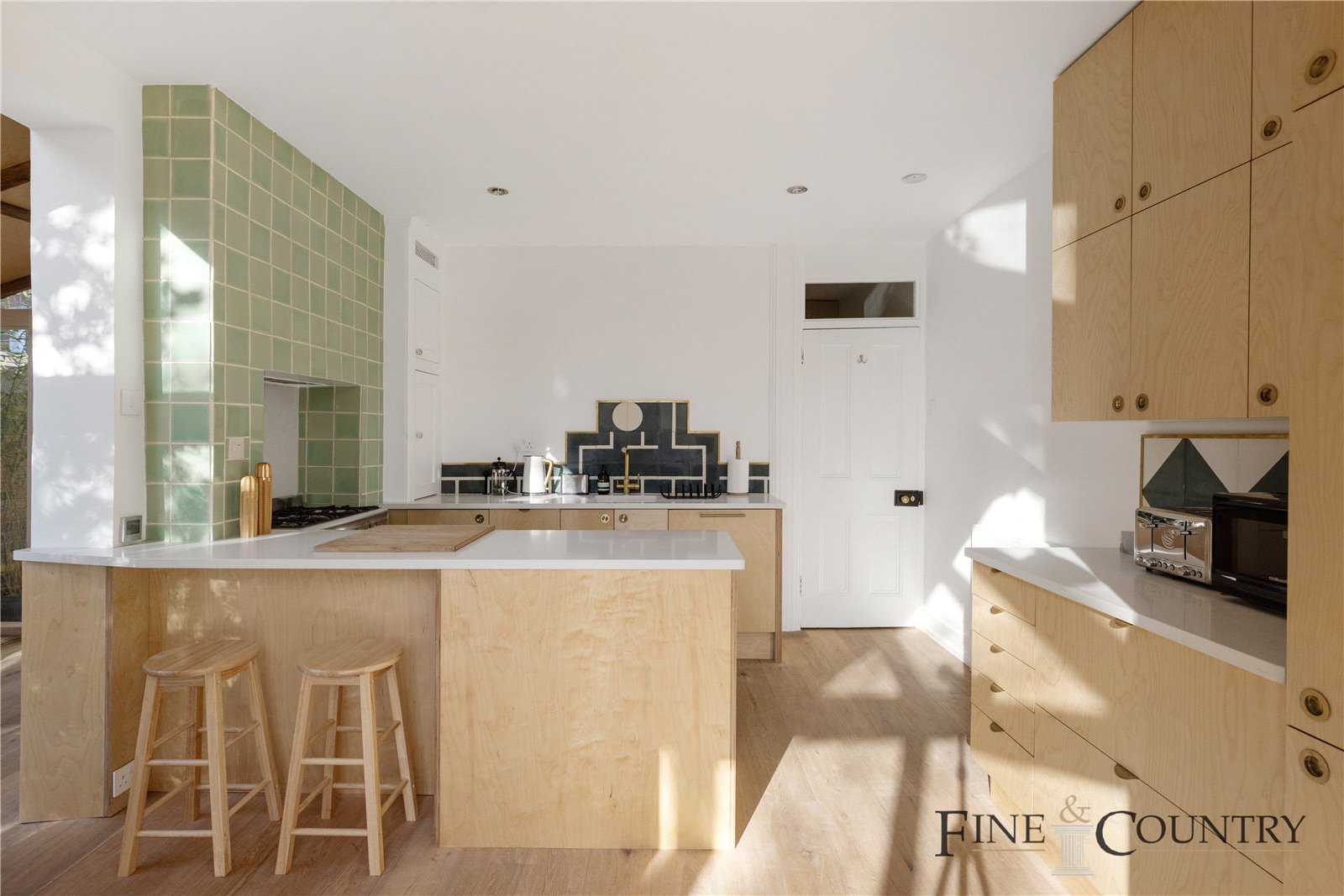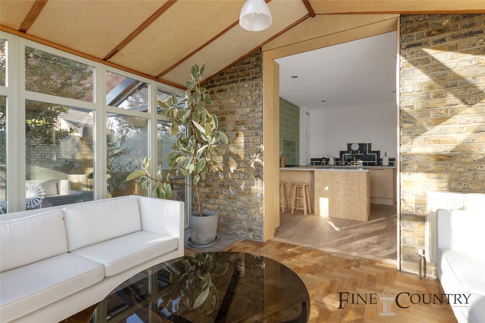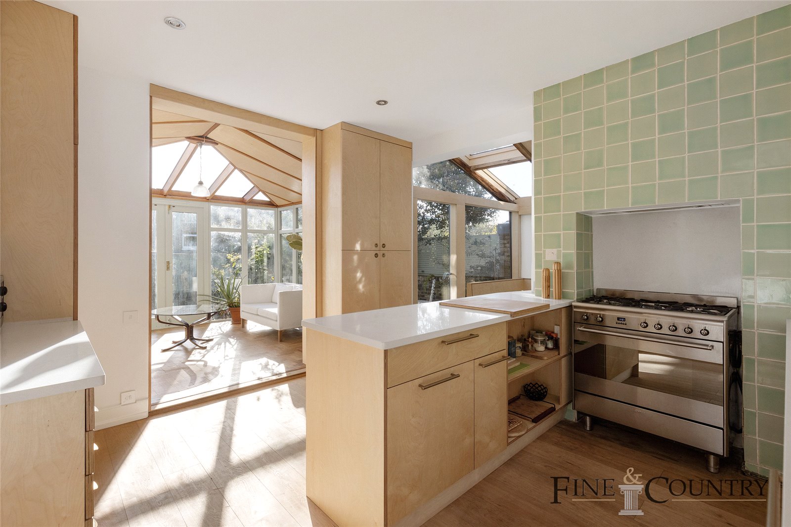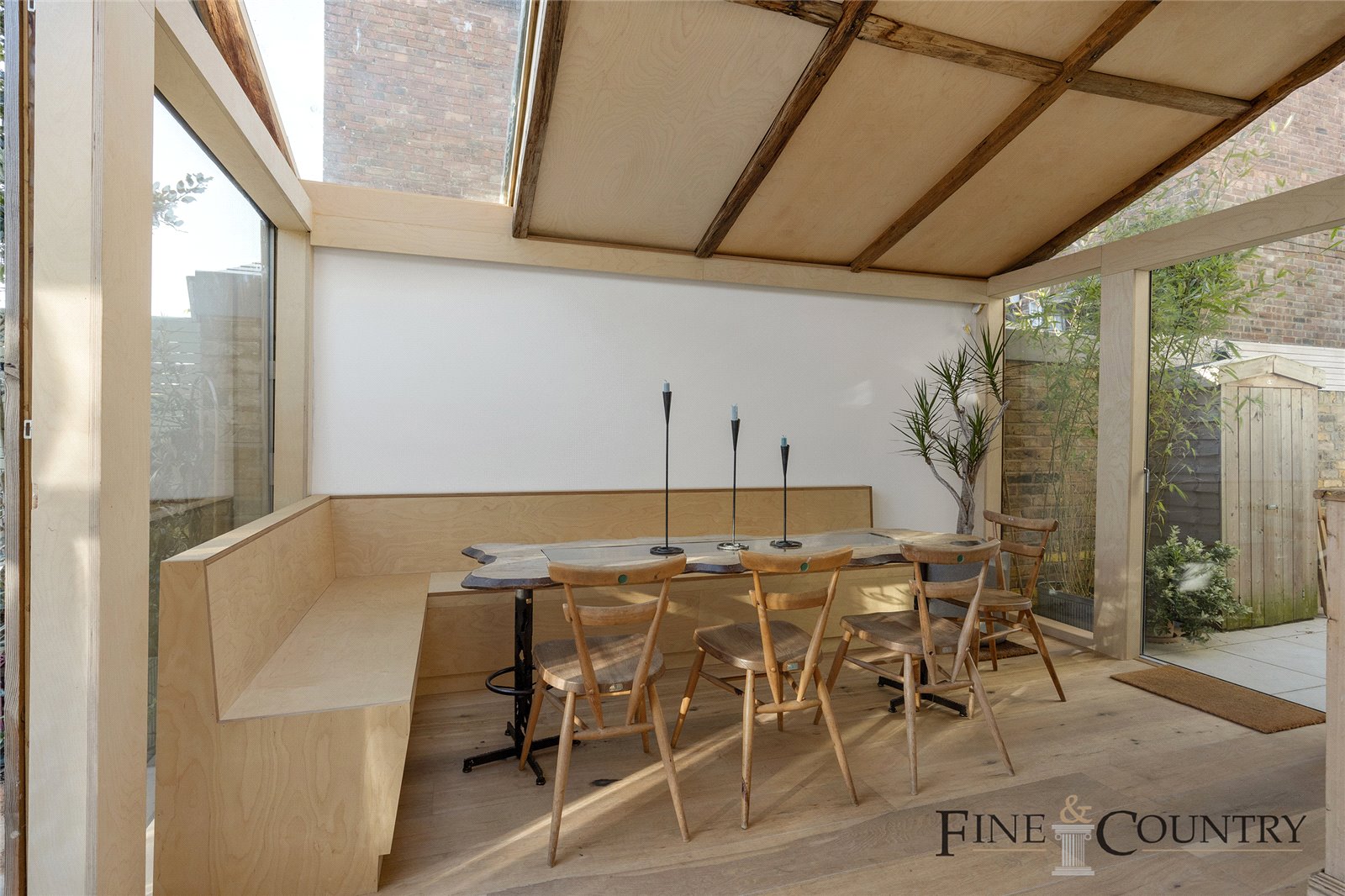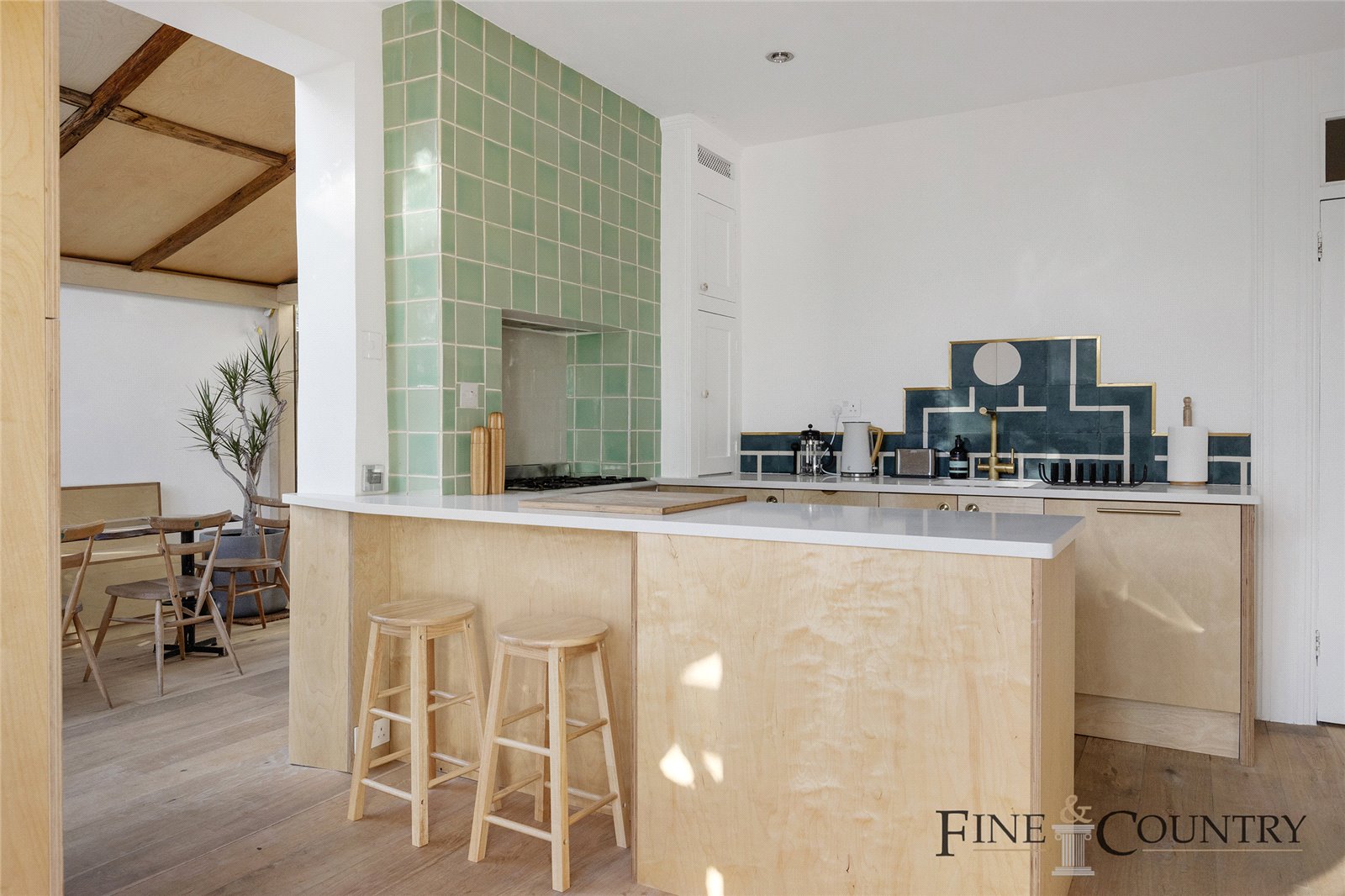 Towards the rear, the kitchen and dining area open into a charming conservatory that functions as a secondary living space. The kitchen retains its original pale green tiles around the stove, paired with modern ply cabinetry that includes a breakfast bar with seating. An additional dining nook is situated in the side return, where built-in bench seating overlooks the garden through large glass panes. Overhead, reclaimed oak beams from French chateaux add a rustic touch.