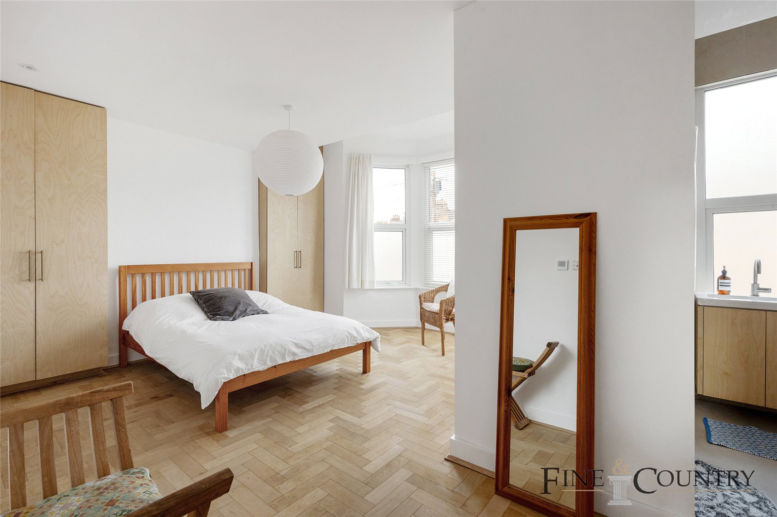 Sisal-carpeted stairs lead up to the first floor, home to three bedrooms. The rear and middle bedrooms feature the same sisal carpeting, while the front bedroom is finished with new herringbone parquet flooring, complete with underfloor heating. Lighting throughout is by Flos, and all paint is sourced from Farrow & Ball, except for the white accents.