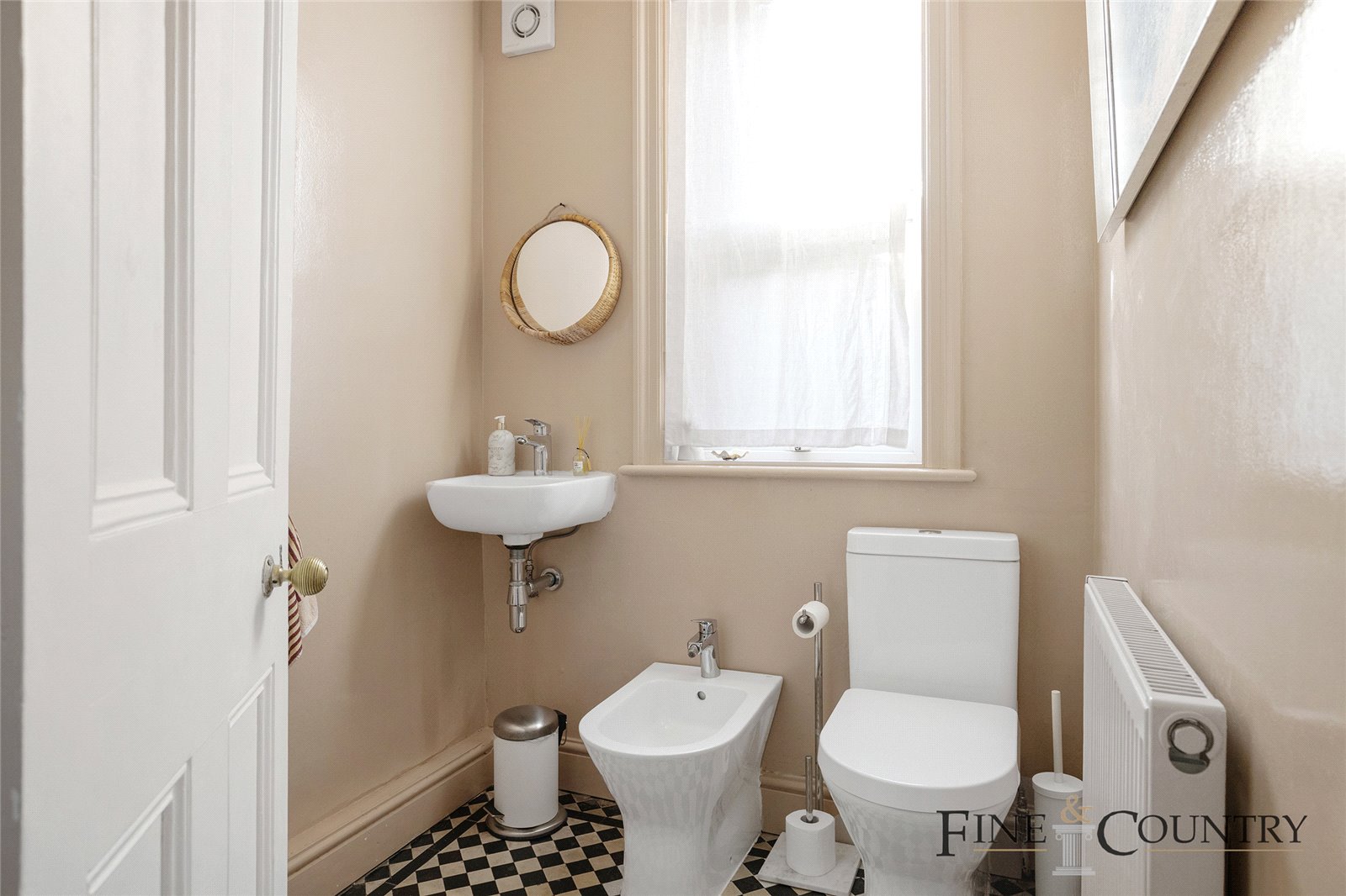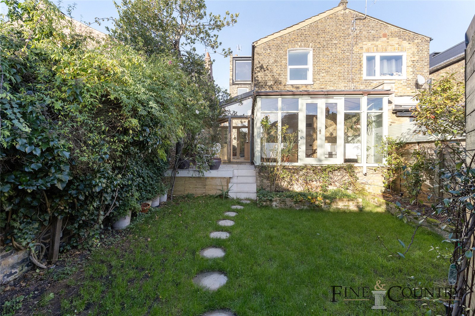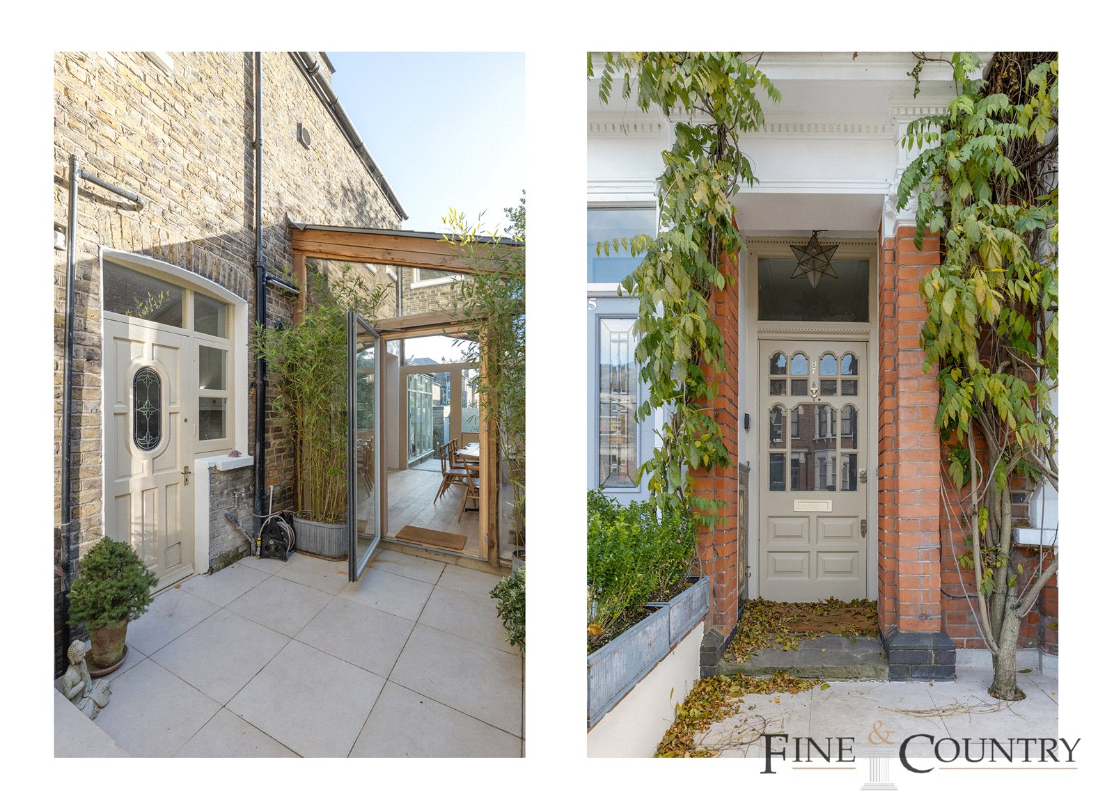 Approaching the house, the front garden offers a leafy and private entryway, with newly paved flooring that complements the lush planting. The front door opens into a spacious hallway, where original Victorian tiles bring warmth and colour, guiding the eye toward the main living areas. A utility room and a separate WC on this floor feature vintage tilework, with walls finished in Farrow & Balls Setting Plaster shade.