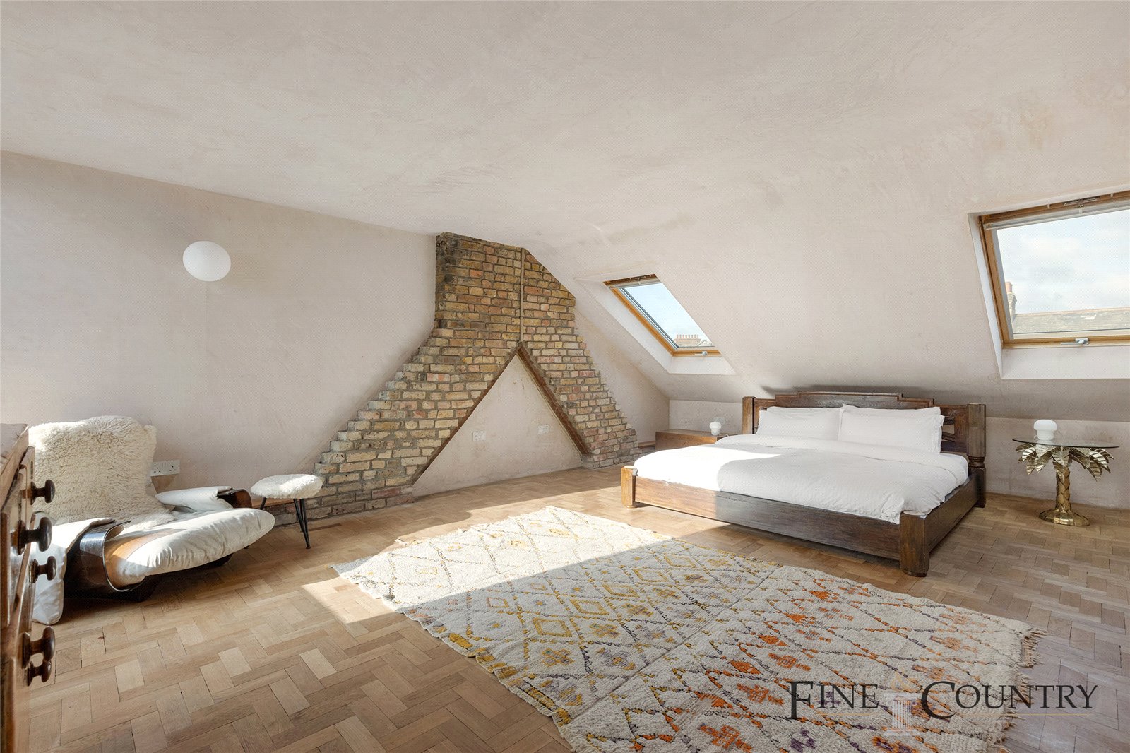 On the top floor, the main suite is a secluded retreat, featuring walls and ceilings finished in exposed plaster that beautifully complements the reclaimed parquet flooring. Two skylights and a large picture window allow natural light to flood in, with the picture window offering panoramic views extending to the Surrey Hills AONB. A built-in birch ply desk in the landing area provides a perfect office nook, and there is an en-suite wet room in the main bedroom.