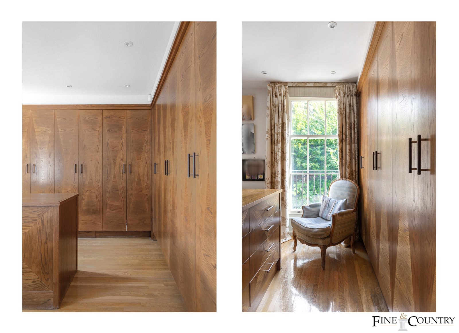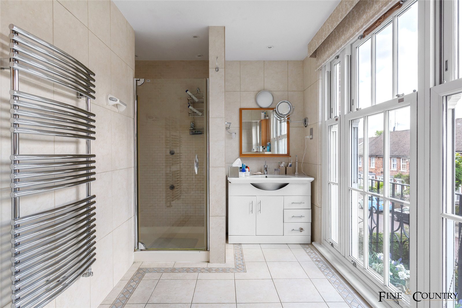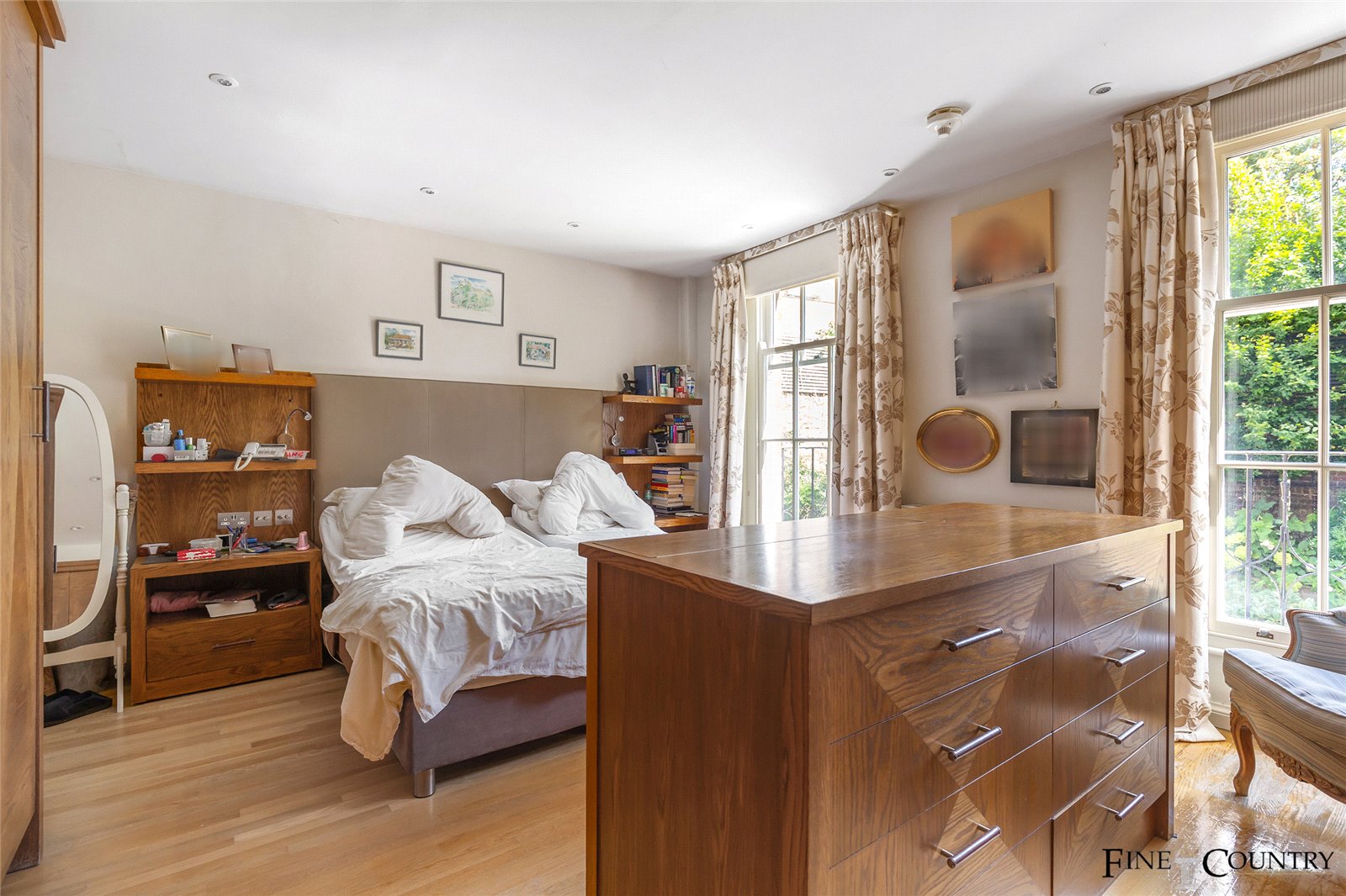 The principal bedroom, located on the first floor, is a highlight with its spacious en-suite, walk-in wardrobe, and garden views, complemented by extensive built-in storage that adds to the room's functionality and appeal. On the second floor, additional bedrooms offer ample storage and are served by a well-appointed family bathroom. The home's layout culminates on the third floor with a private bedroom featuring an en-suite and generous eaves storage, maximizing the space efficiently. Throughout the residence, hardwood flooring enhances the aesthetic and practicality, ensuring each room is both inviting and durable.