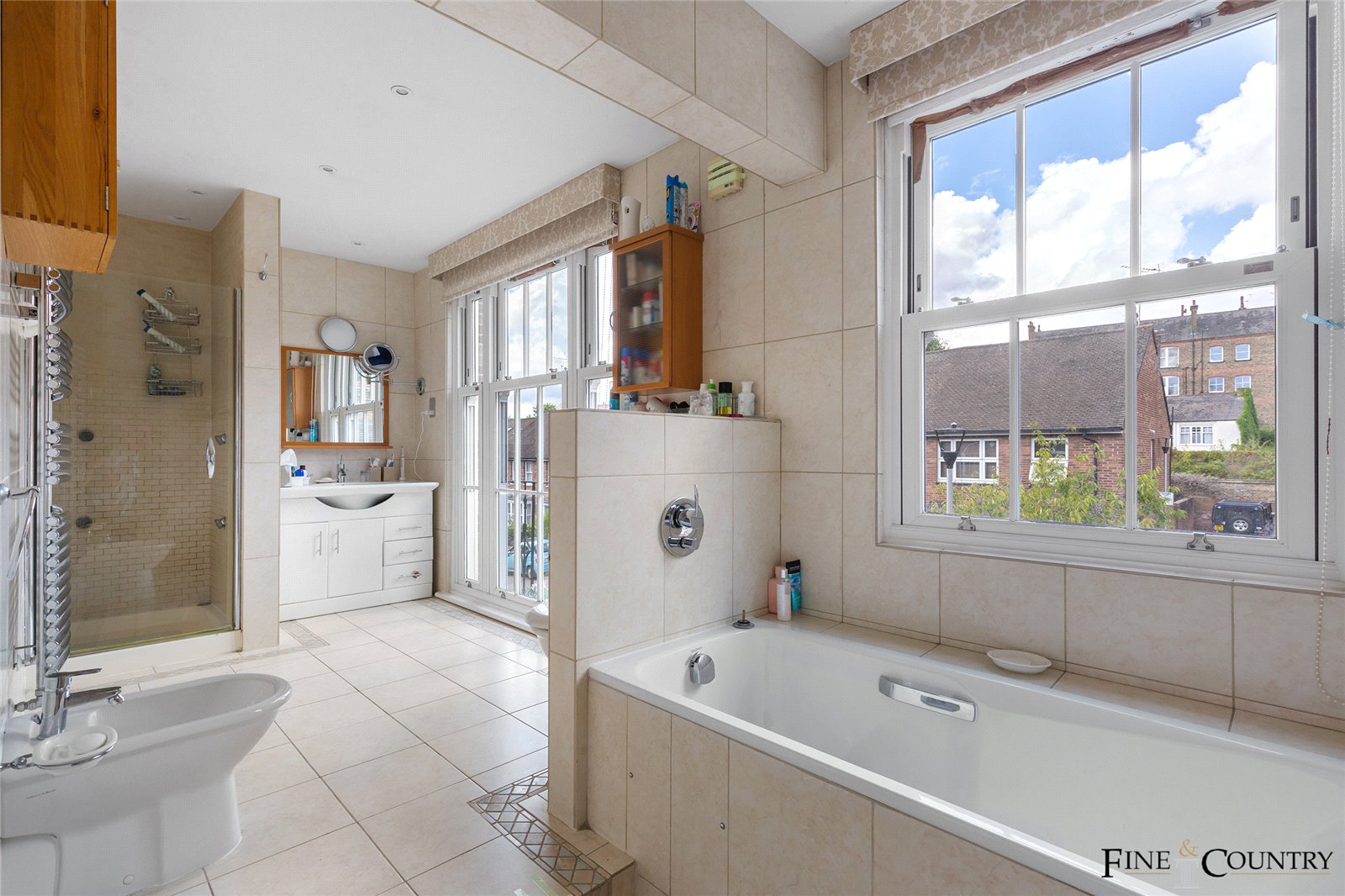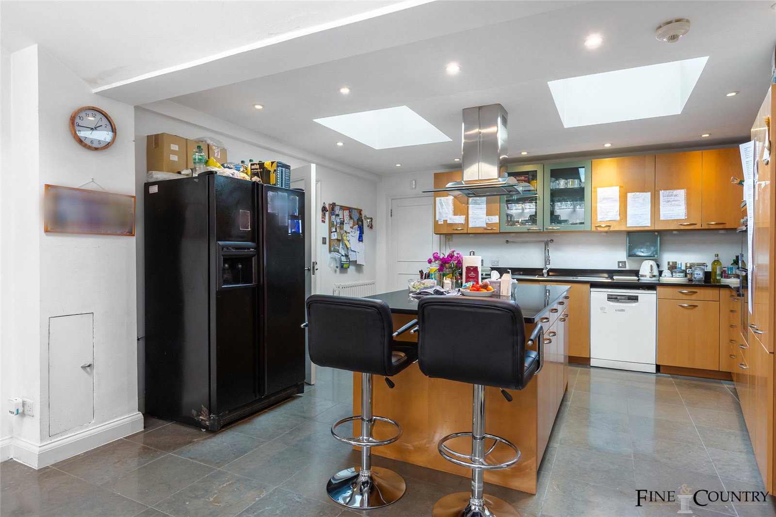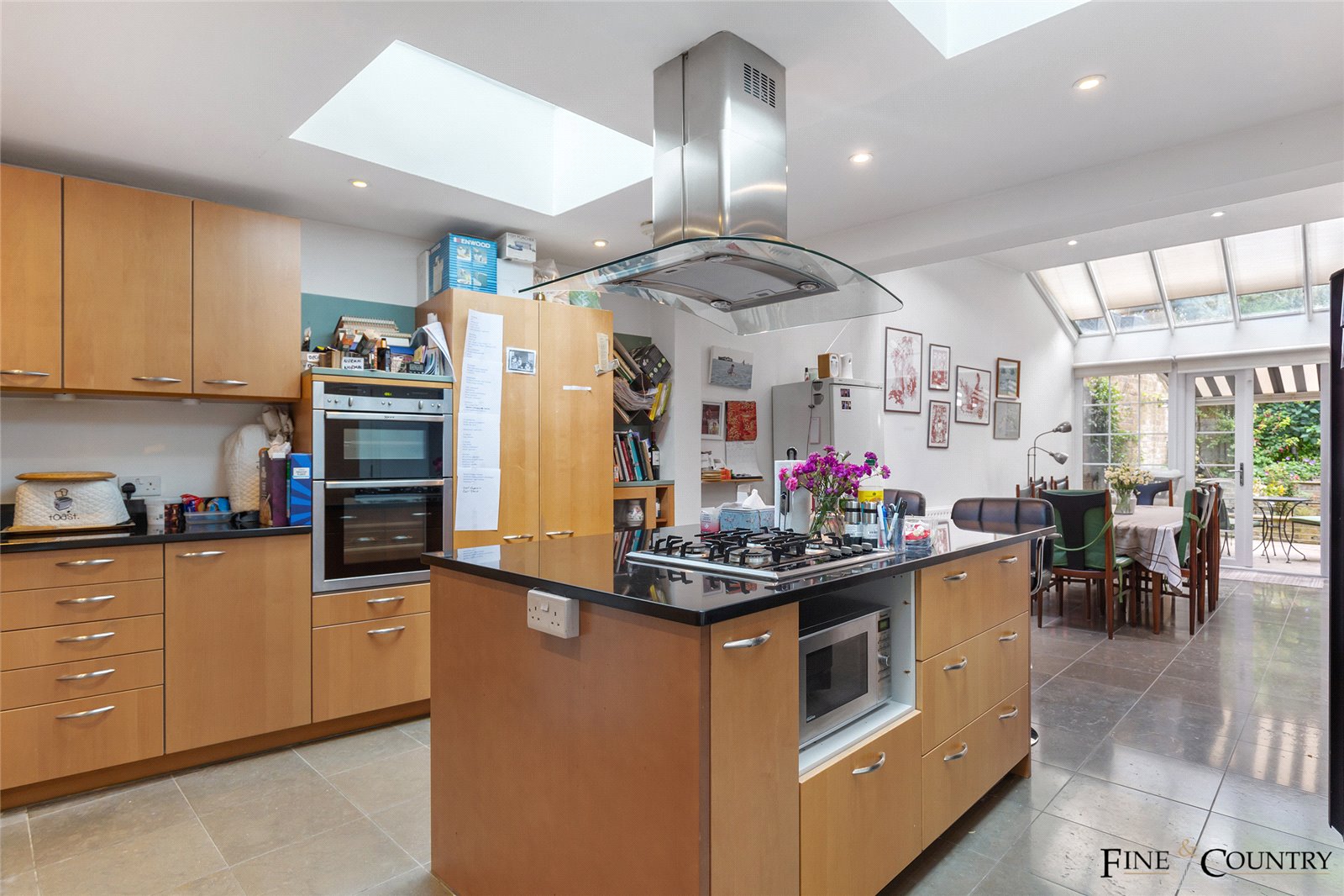 The principal bedroom, located on the first floor, is a highlight with its spacious en-suite, walk-in wardrobe, and garden views, complemented by extensive built-in storage that adds to the room's functionality and appeal. On the second floor, additional bedrooms offer ample storage and are served by a well-appointed family bathroom. The home's layout culminates on the third floor with a private bedroom featuring an en-suite and generous eaves storage, maximizing the space efficiently. Throughout the residence, hardwood flooring enhances the aesthetic and practicality, ensuring each room is both inviting and durable.
