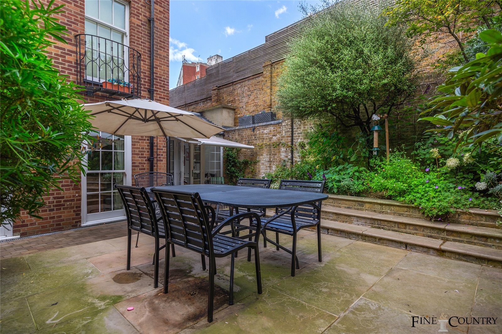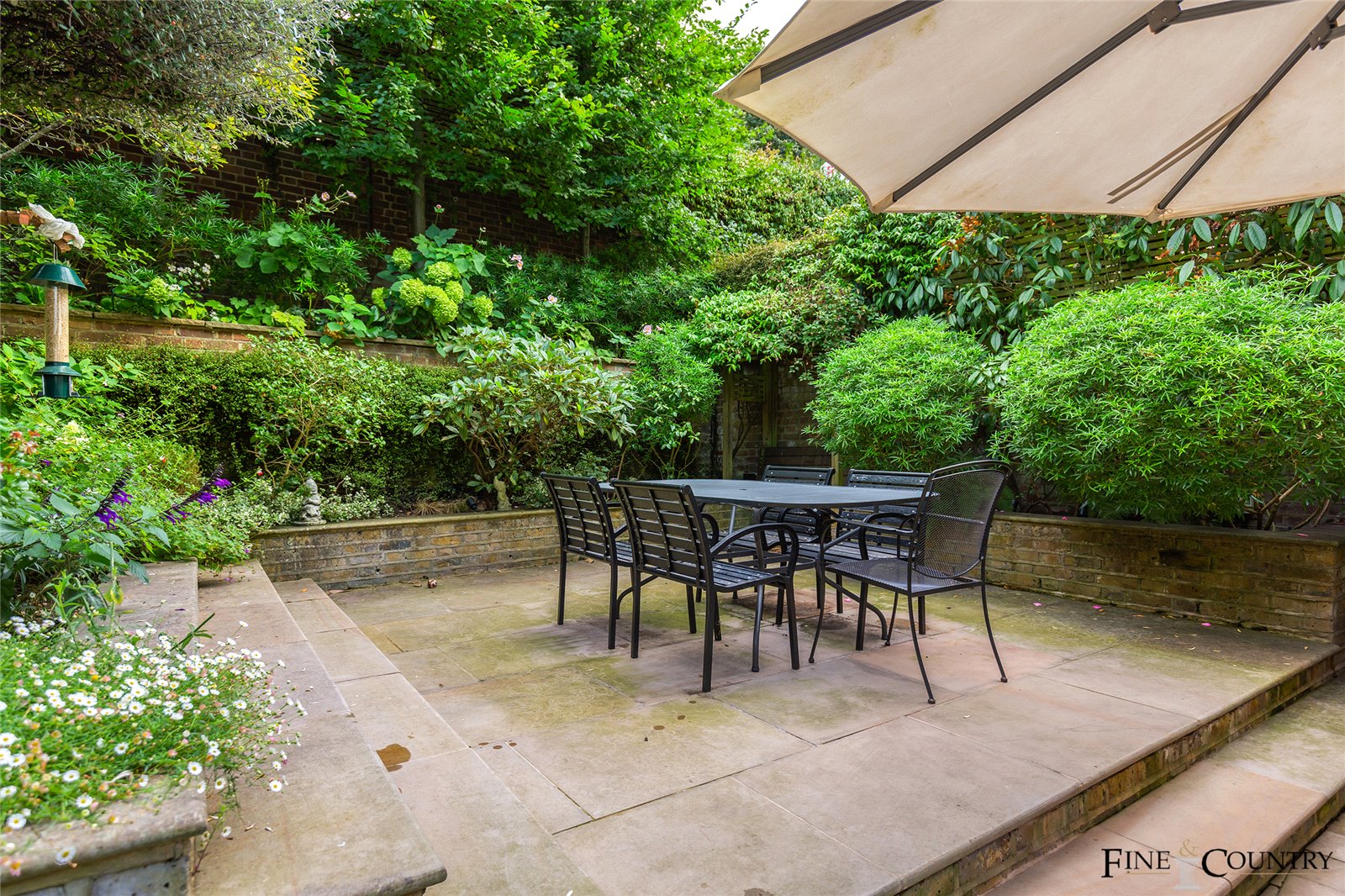 The serene garden offers a tranquil retreat with its mature and lush landscaping. Set against a backdrop of dense foliage and brick walls that provide both privacy and charm, this garden features a spacious paved patio area perfect for outdoor dining or relaxation. The garden is accessed directly from the house through stylish glass doors, making it an ideal space for entertaining or enjoying quiet moments outdoors.