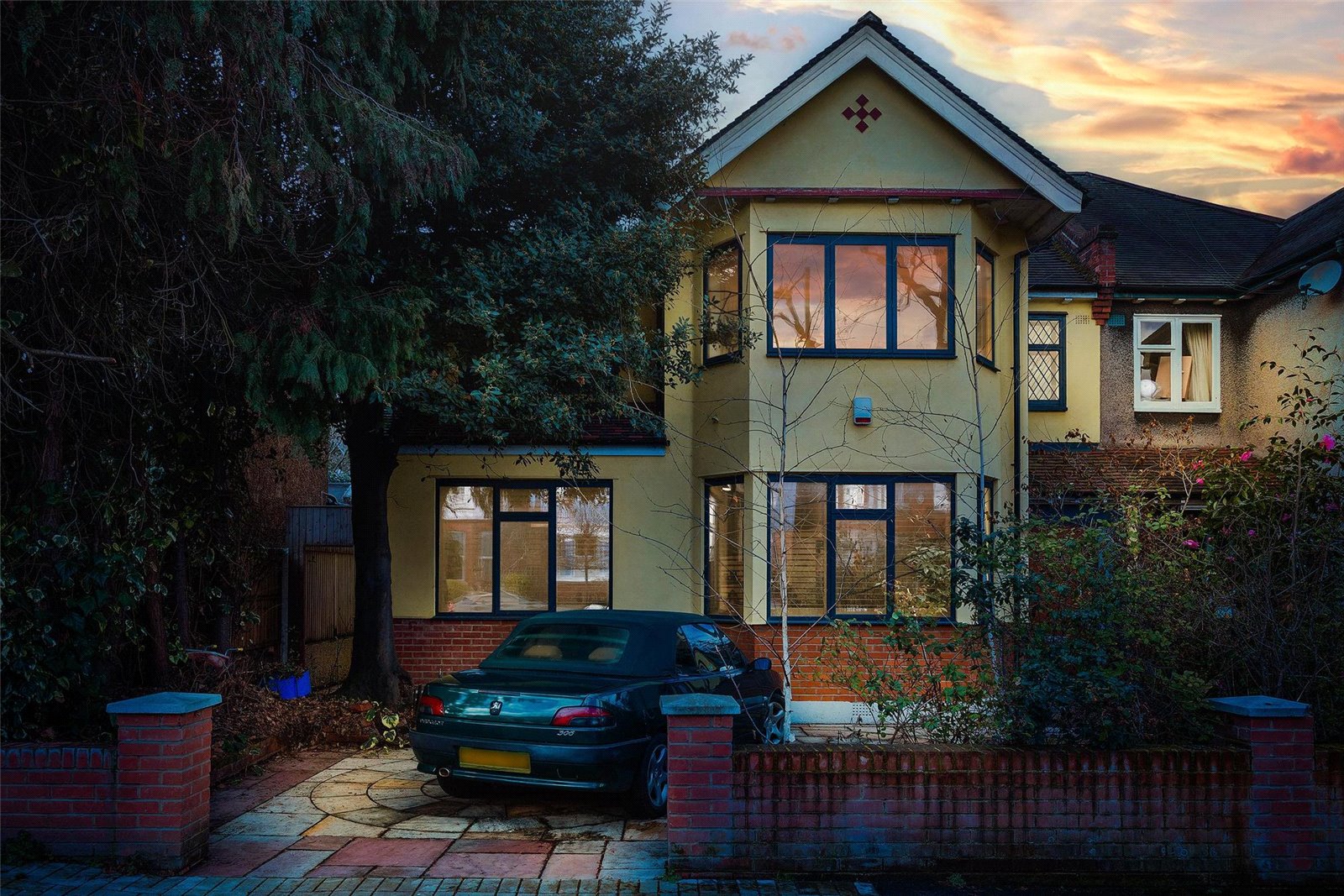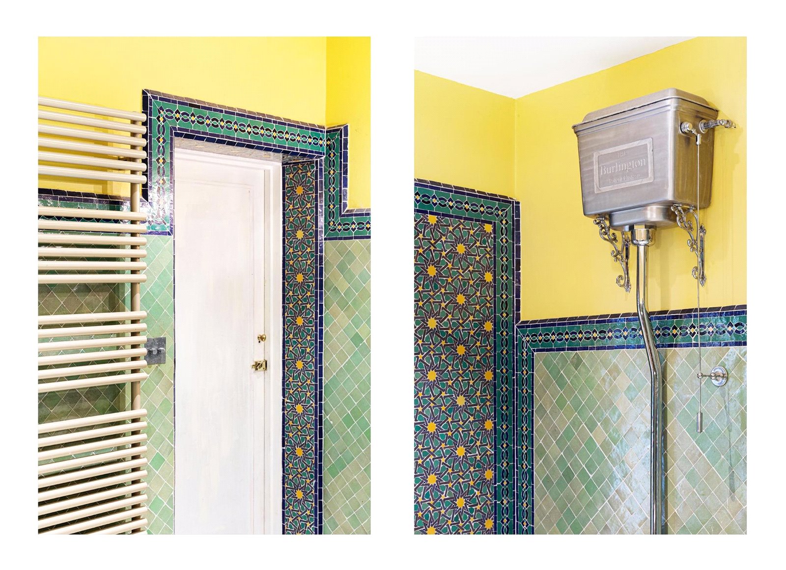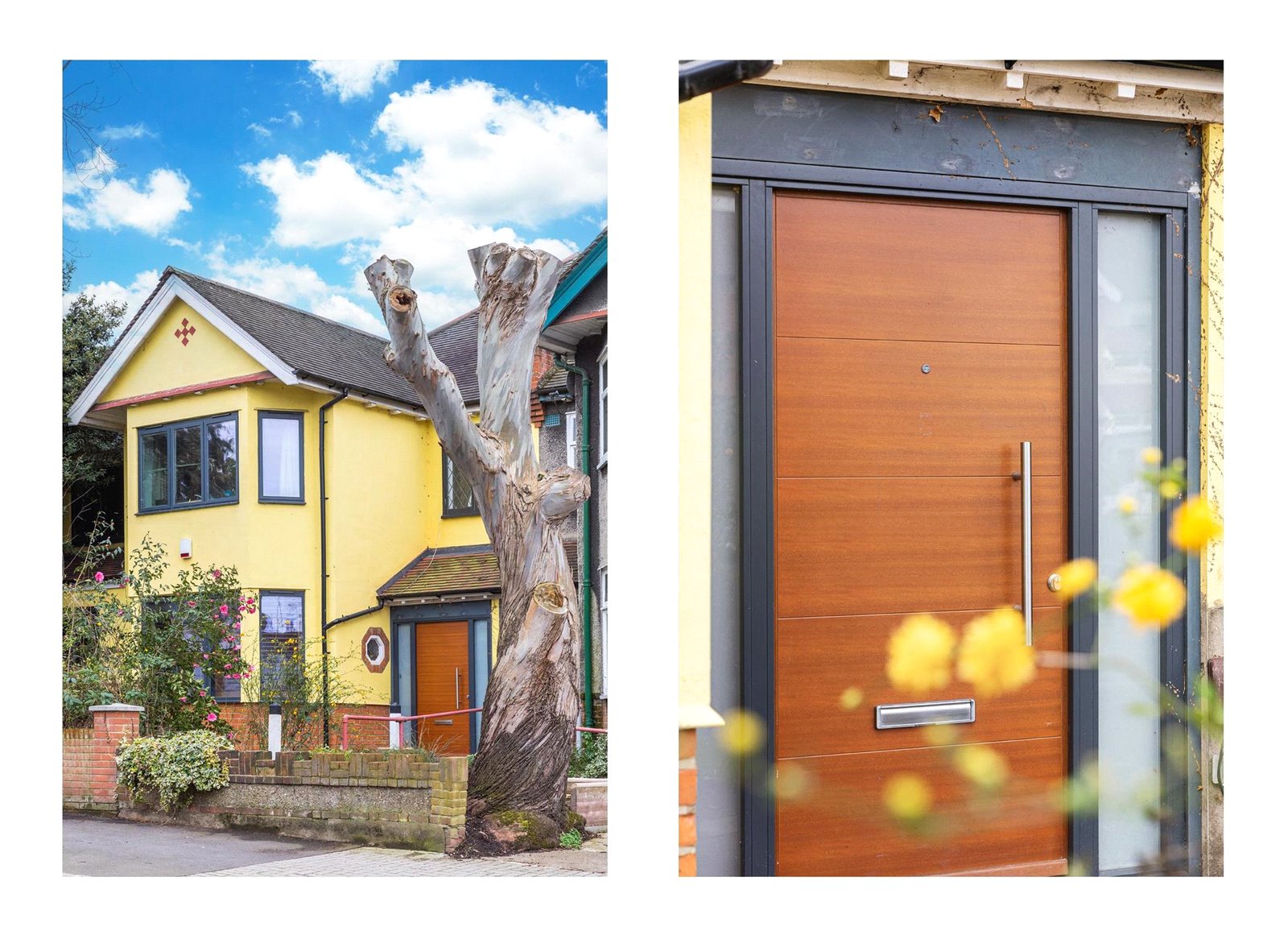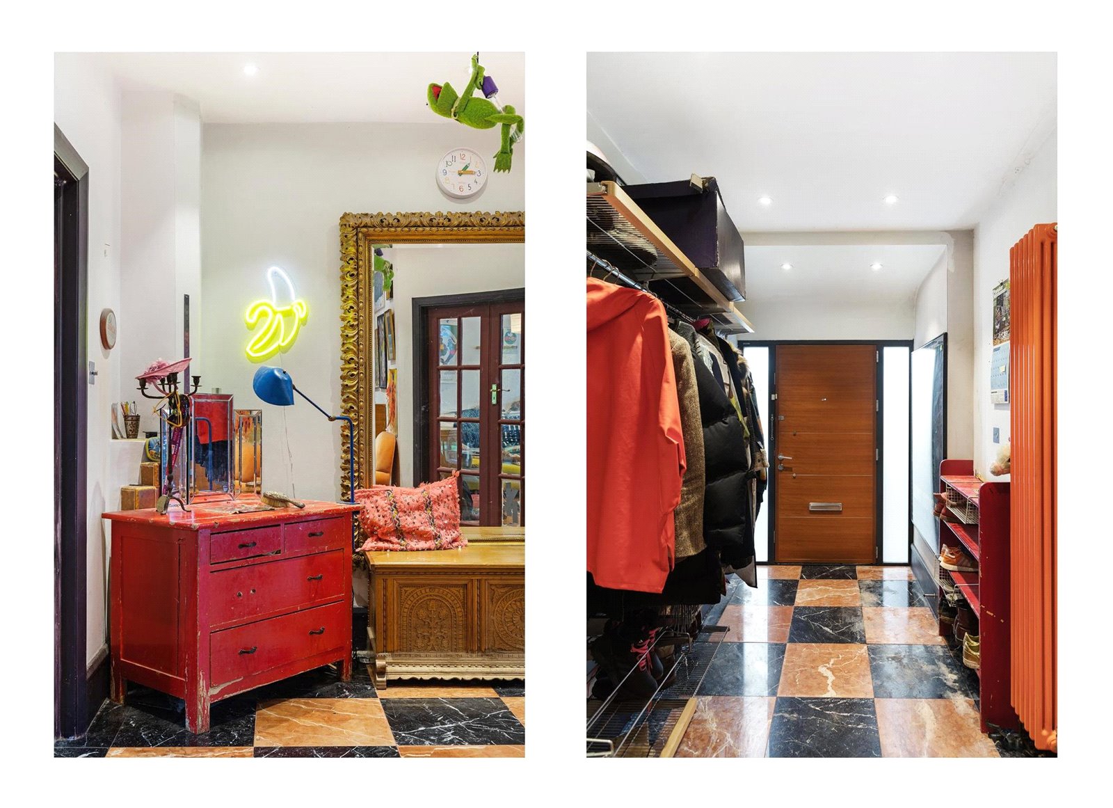 The sunny yellow facade of the property creates an immediate visual impact. The semi-open stone paved driveway, with space for two cars, leads to a unique timber front door by Kloeber UK. Inside, an expansive hallway features neutral tones, marble chess board tiles, and a refurbished orange radiator.