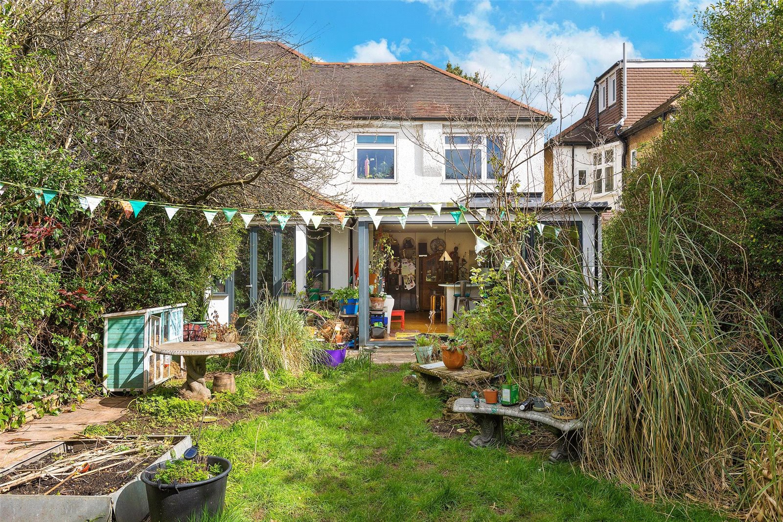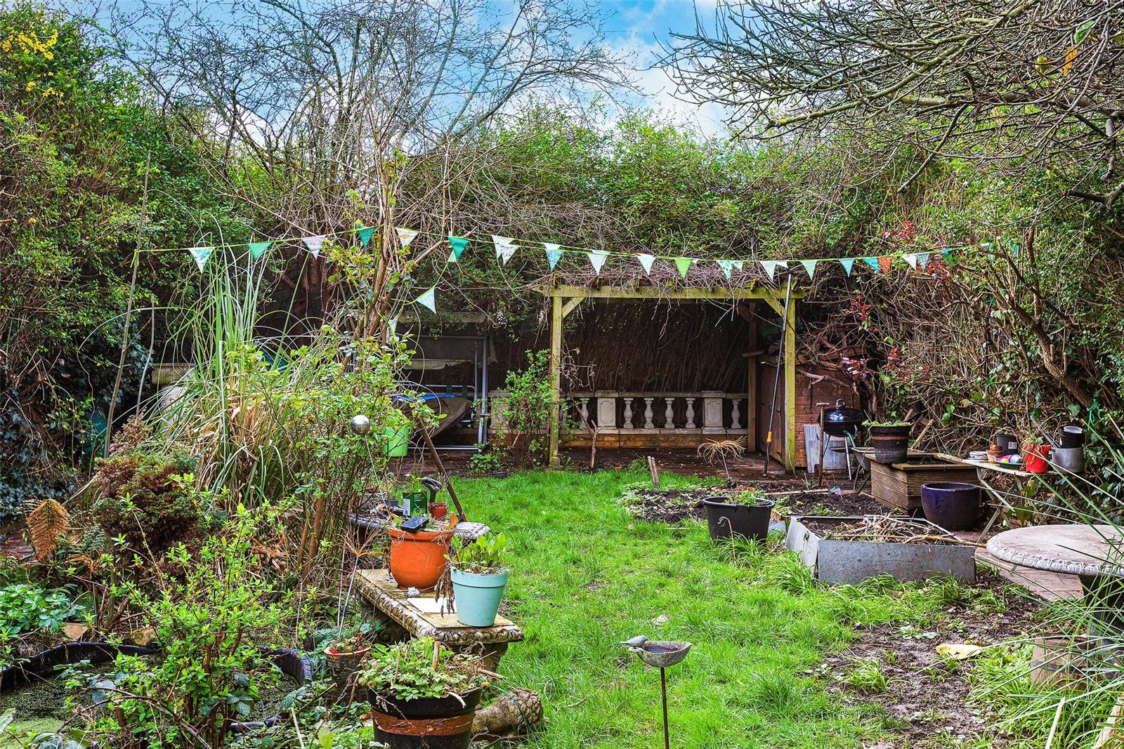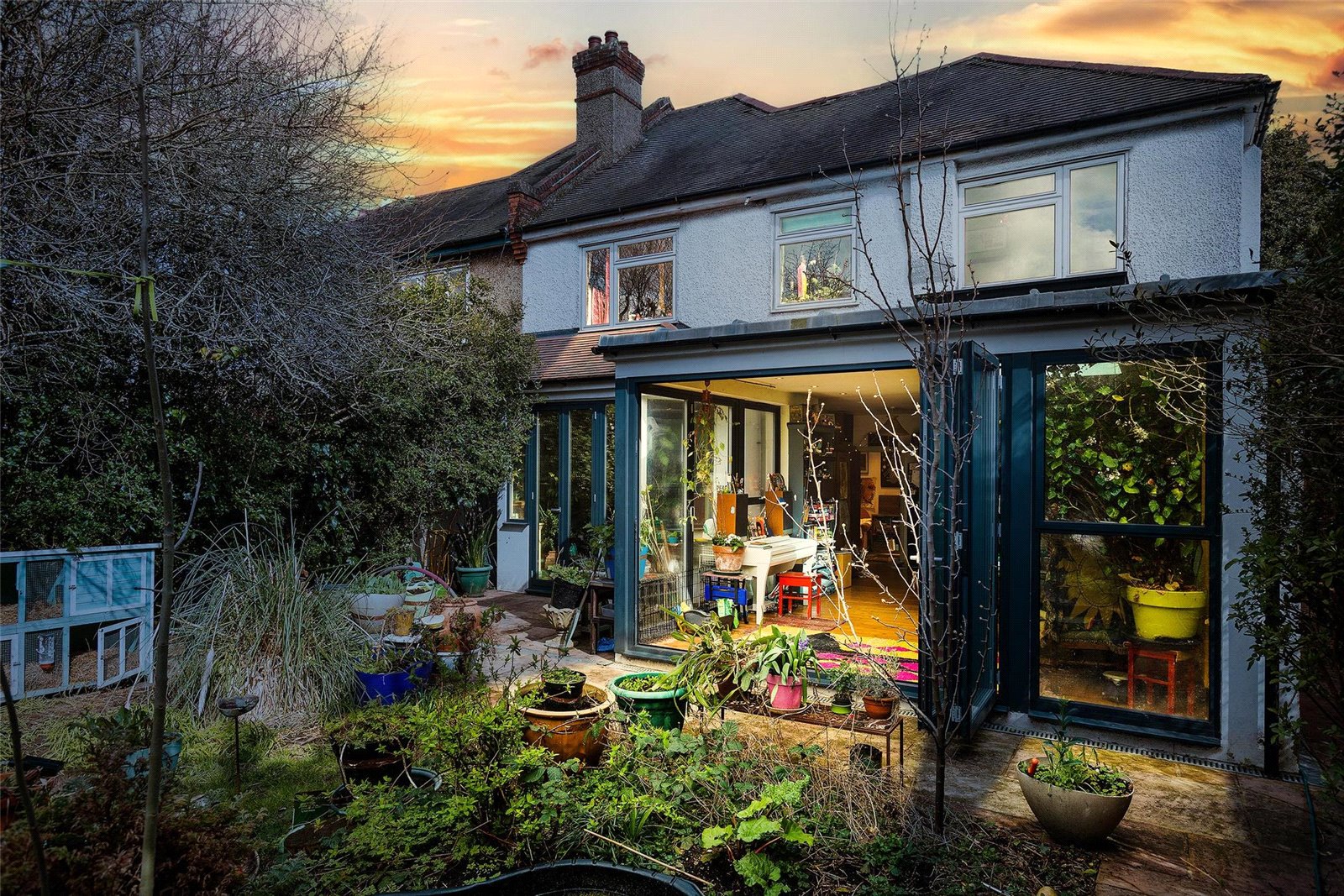 The secluded south-facing garden is an eco-friendly oasis with mature fruit trees, a lawn, vegetable patches, and a pond with koi fish.