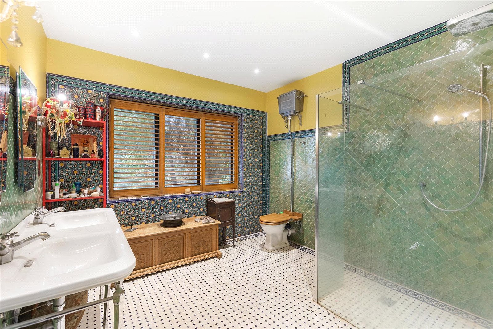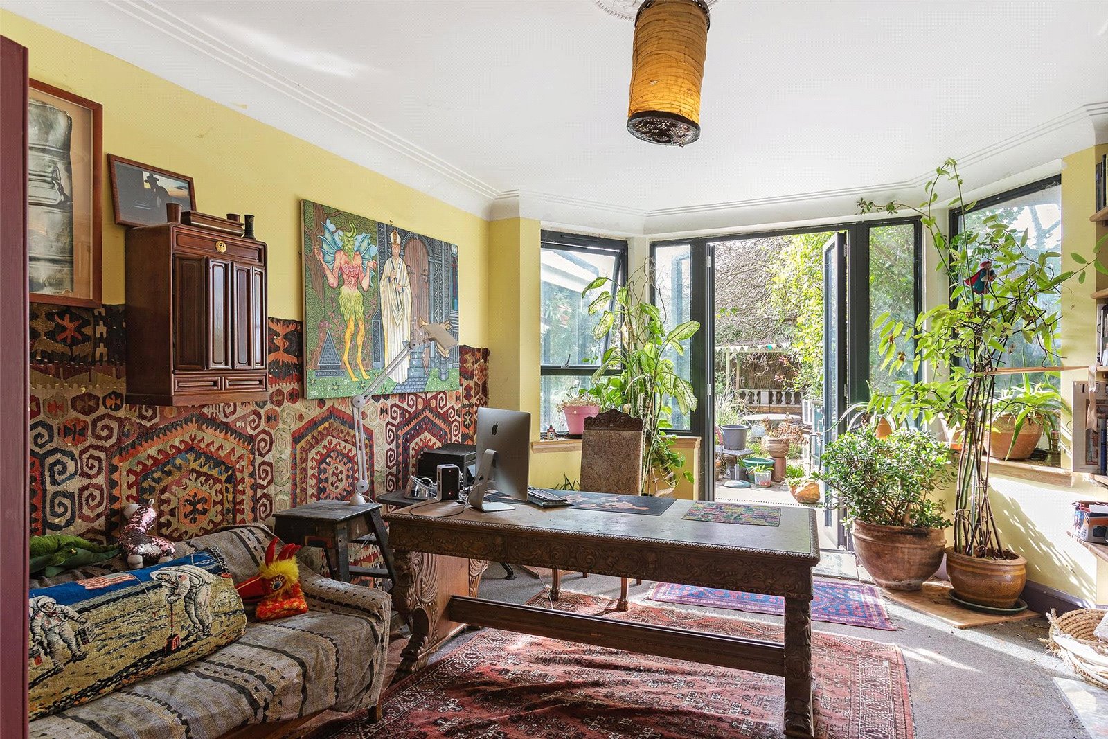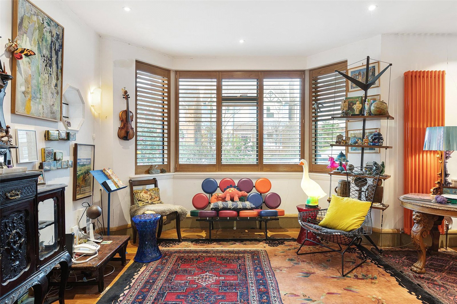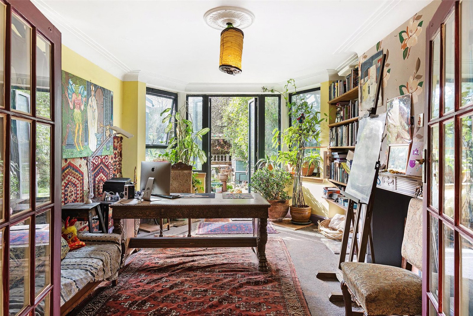 To the left, the large reception room boasts high ceilings, antique Yara timber flooring, and large bay windows that flood the space with natural light. The study room at the rear, with Art-Deco decor and a fireplace, opens to the garden through floor-to-ceiling triple glass doors by Kloeber UK.