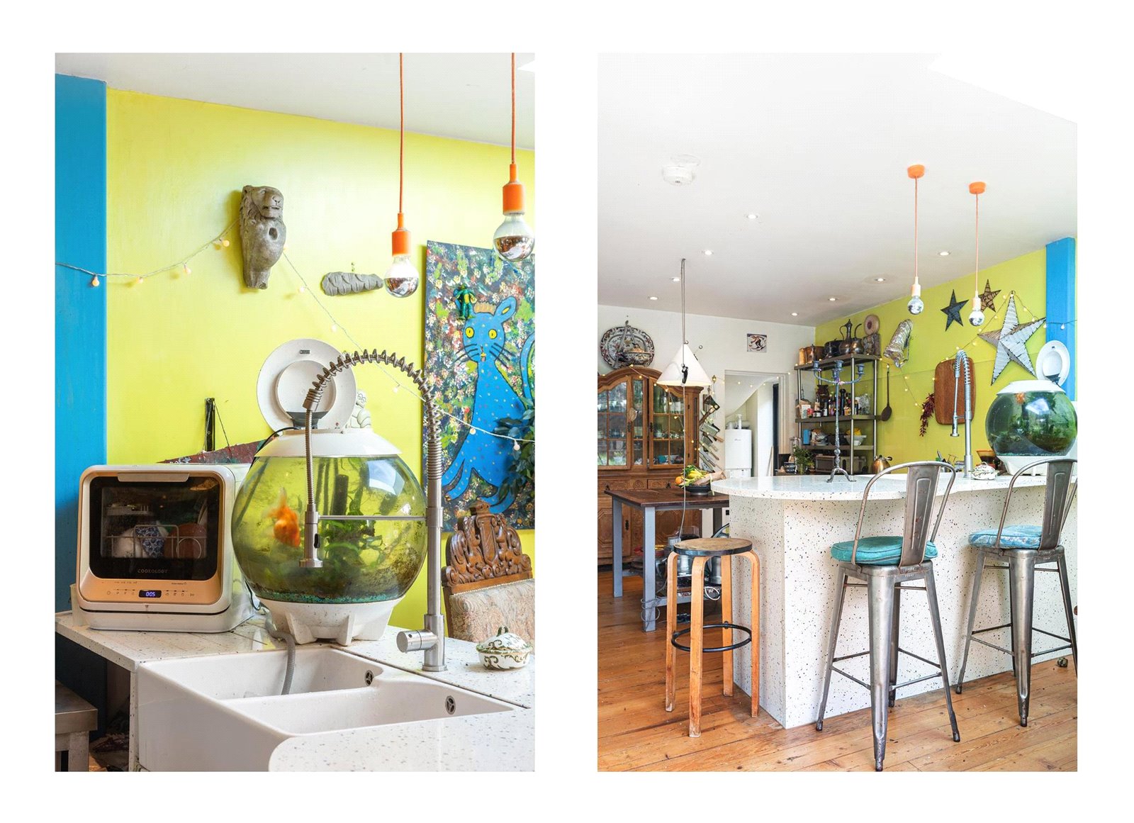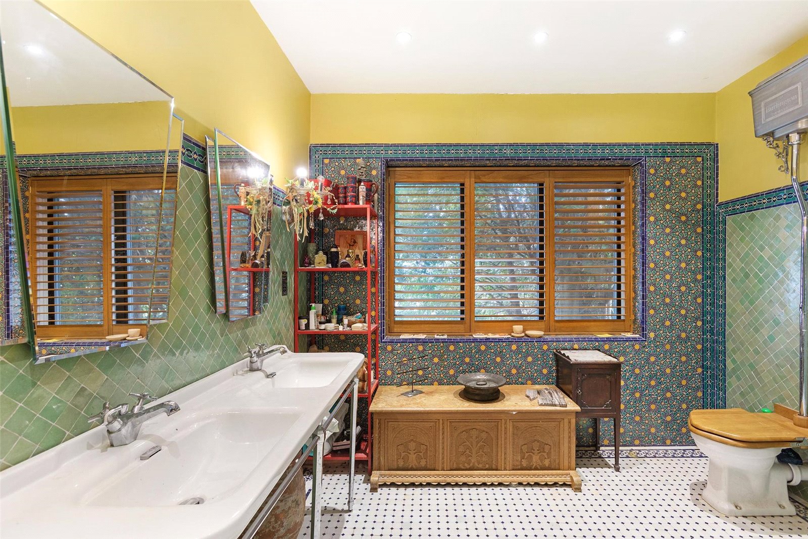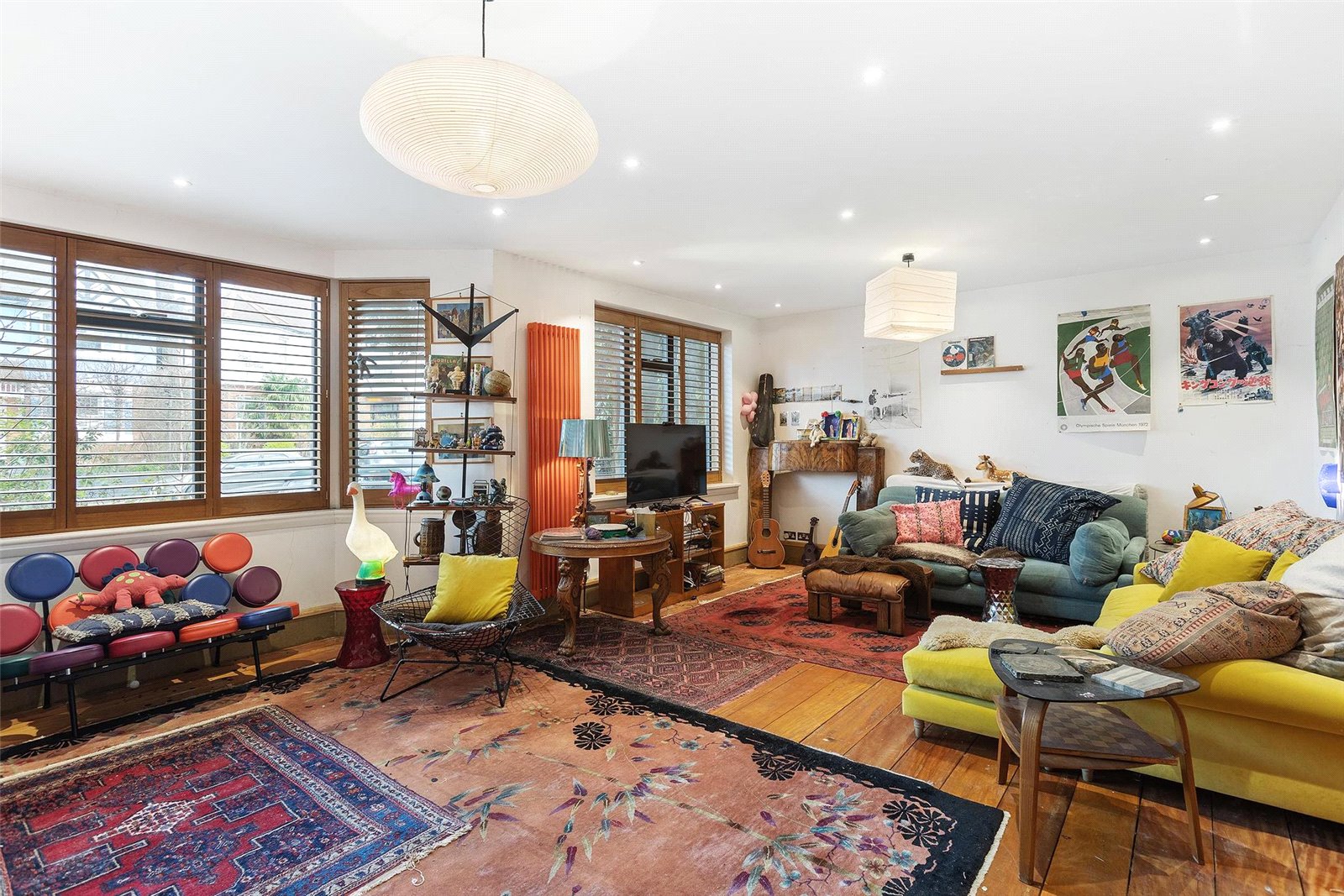 This London home is a unique masterpiece, blending an eclectic mix of architectural styles from Arts and Craft to Bauhaus, abstract expressionism, and 70's pop kitsch. Inside, the contemporary, open-plan living space exudes a comfortable country-house feel, accentuated by the rustic charm of reclaimed unvarnished timber flooring. The result is a warm and inviting space, perfect for entertaining guests or simply relaxing in style.