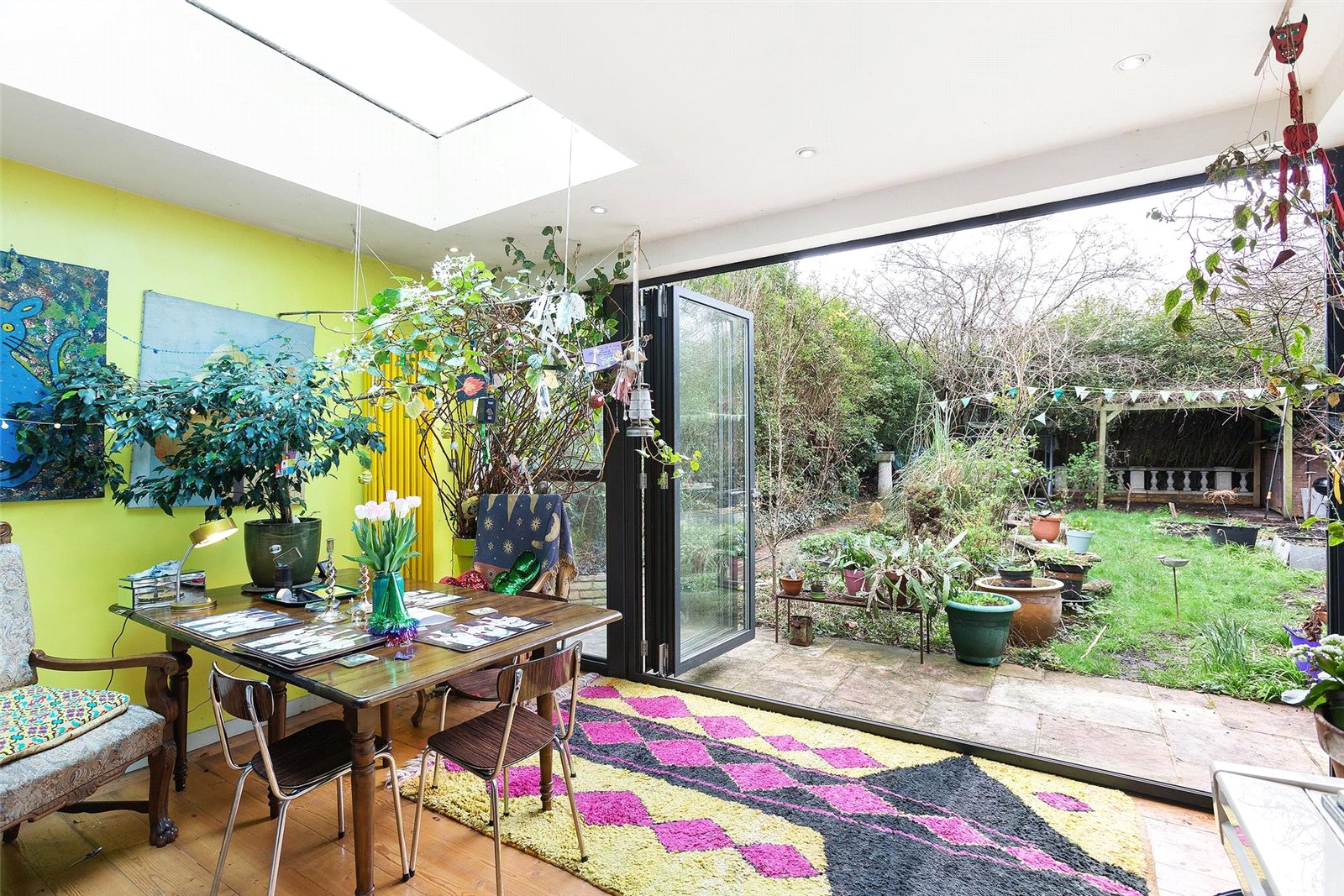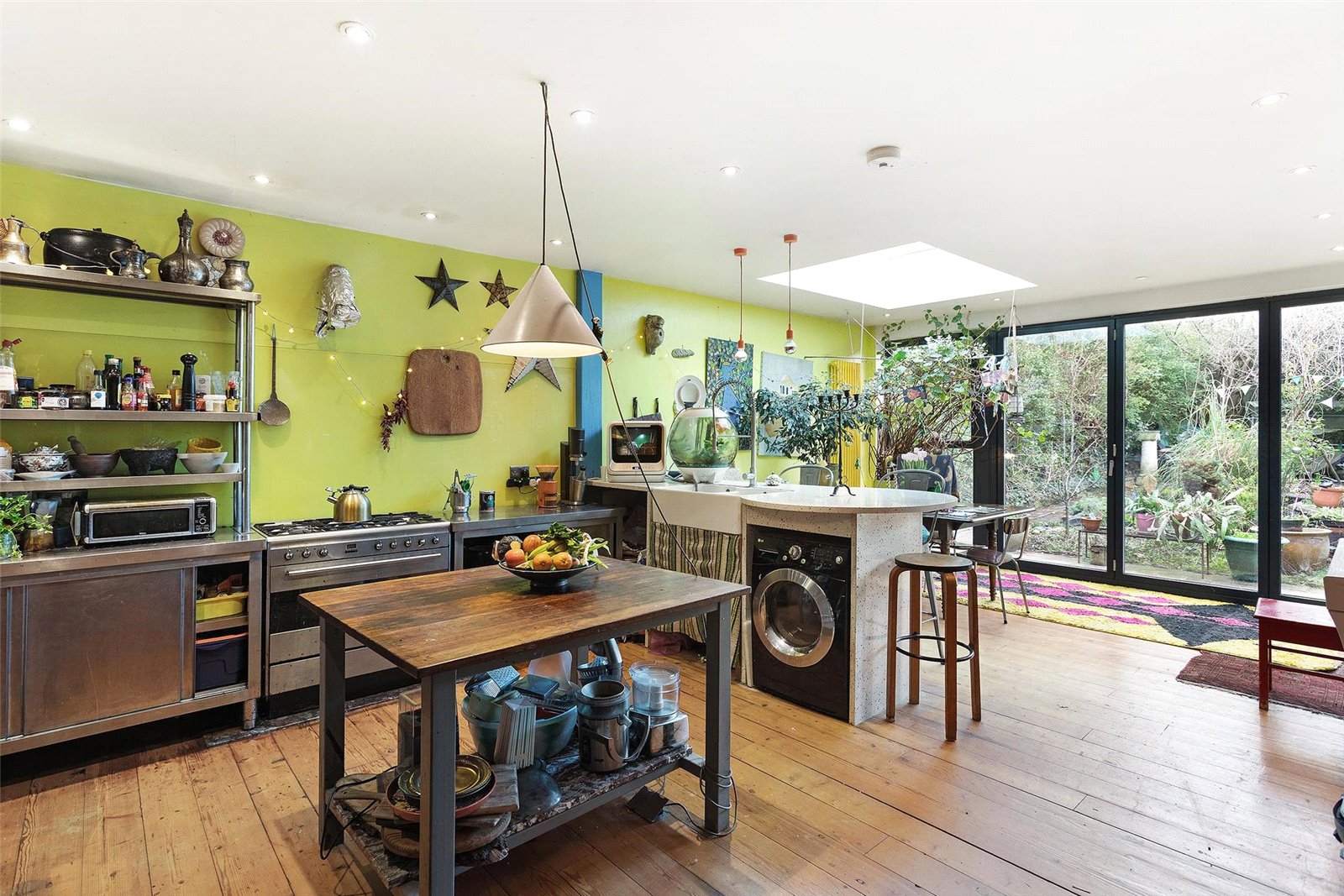 The adjacent kitchen, overlooking the garden, features industrial metal units, a Smeg gas cooker, a Samsung fridge, and a 70s style quartz island. Handcrafted Columbian Pine parquet flooring adds natural beauty. The ground floor also includes a guest WC and a utility room with outdoor access.