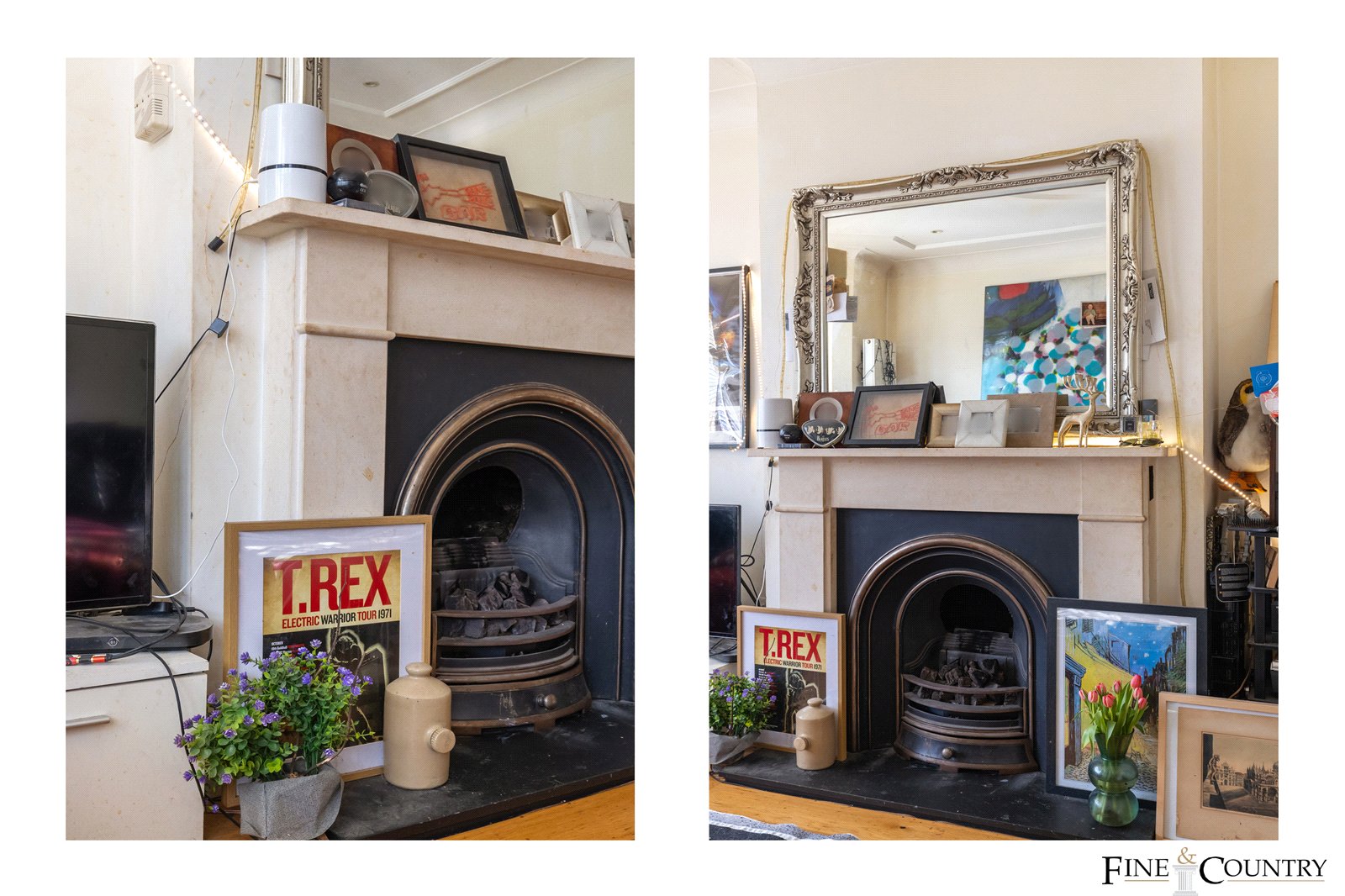 Entering the home, the reception room immediately commands attention with its historical centrepiece: an ornate Victorian style cast iron fireplace. The polished black hearth with a curved arch design is set against a light marble mantel, reflecting a bygone era's craftsmanship. This striking feature is surrounded by light, polished wooden floors that extend throughout the space, creating a warm, inviting atmosphere.