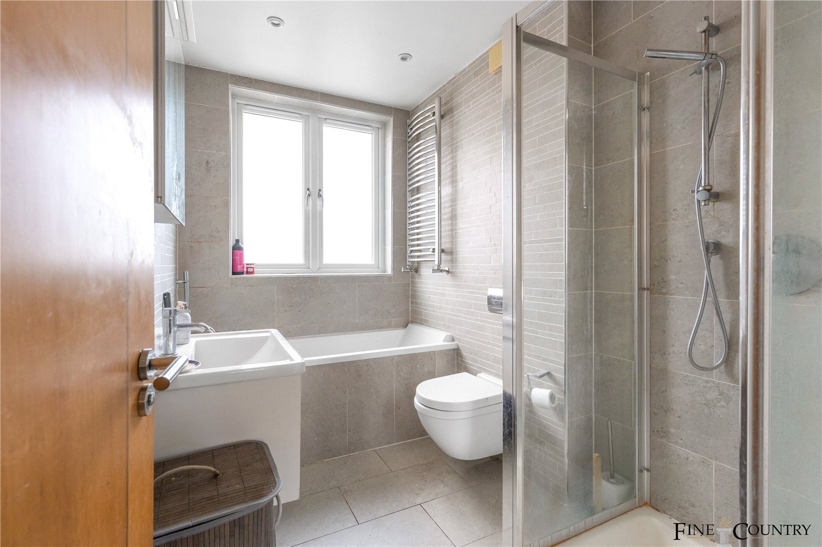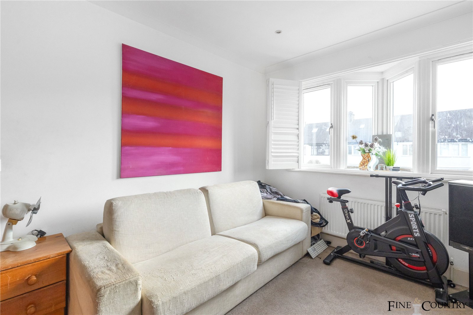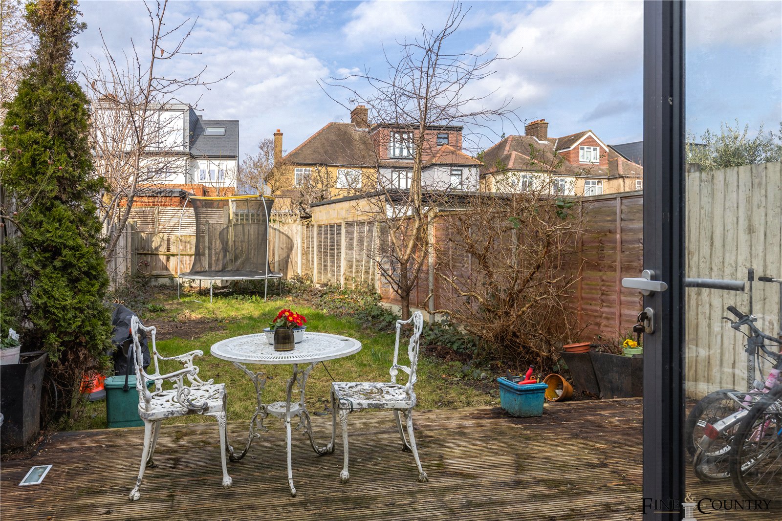 The rear garden is a true extension of the home, with sizeable space enclosed by high fences for privacy. It features a well-maintained lawn and a decking area, perfect for al fresco dining and summer barbecues. Mature planting adds a touch of nature and tranquillity to this urban oasis.