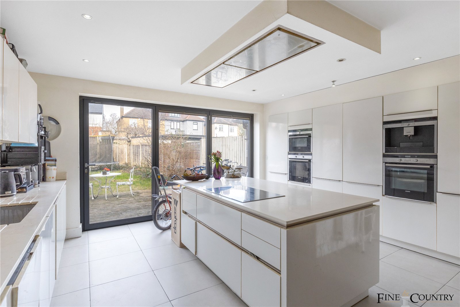 Adjacent to this is the heart of the homean expansive, open-plan kitchen and dining area. The kitchen is outfitted with a modern white gloss finish and a central island that not only serves as a focal point for social gatherings but also integrates functionality with style. Bi-folding doors open out seamlessly to the outdoor space, marrying the interior with the garden, perfect for entertaining. The utility room adjacent to the kitchen provides additional functional space, essential for a busy household, while a neatly tucked away guest WC adds an extra layer of convenience.