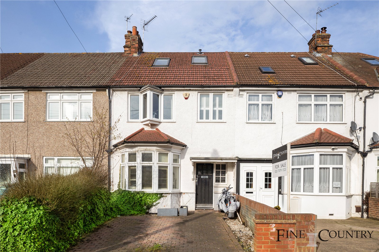 The façade of this home presents a quaint yet compelling architectural style typical of early 20th-century London terraced houses. The roof, covered in variegated clay tiles, features multiple skylights that hint at the bright, airy spaces within. The upper stories are punctuated by symmetrical windows, including a distinctive bay window on the ground floor that adds depth and character to the structure. The white render finish, though simple, highlights the propertys clean lines and classic design. A neatly paved pathway leads to the robust wooden front door flanked by a sidelight with intricate glazing, invites one into the welcoming interiors of this charming residence.