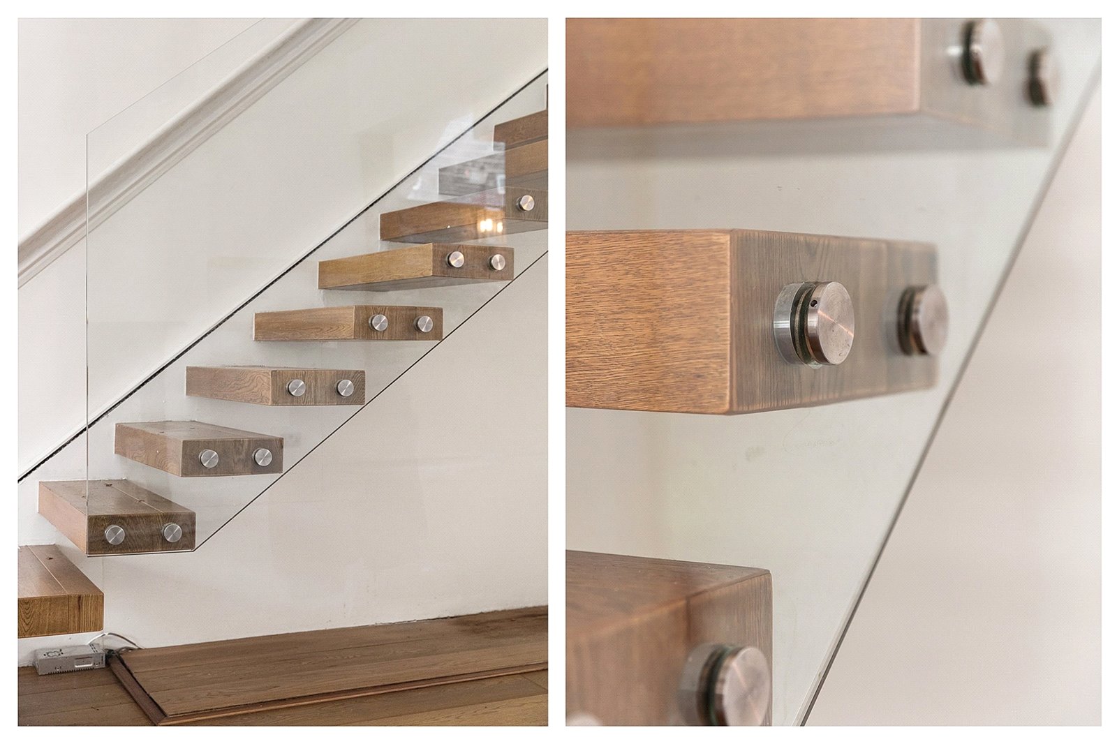 • Skylights, glass floor panels, exposed brickwork, and floating stairs