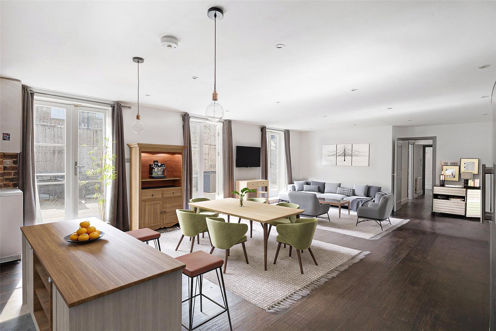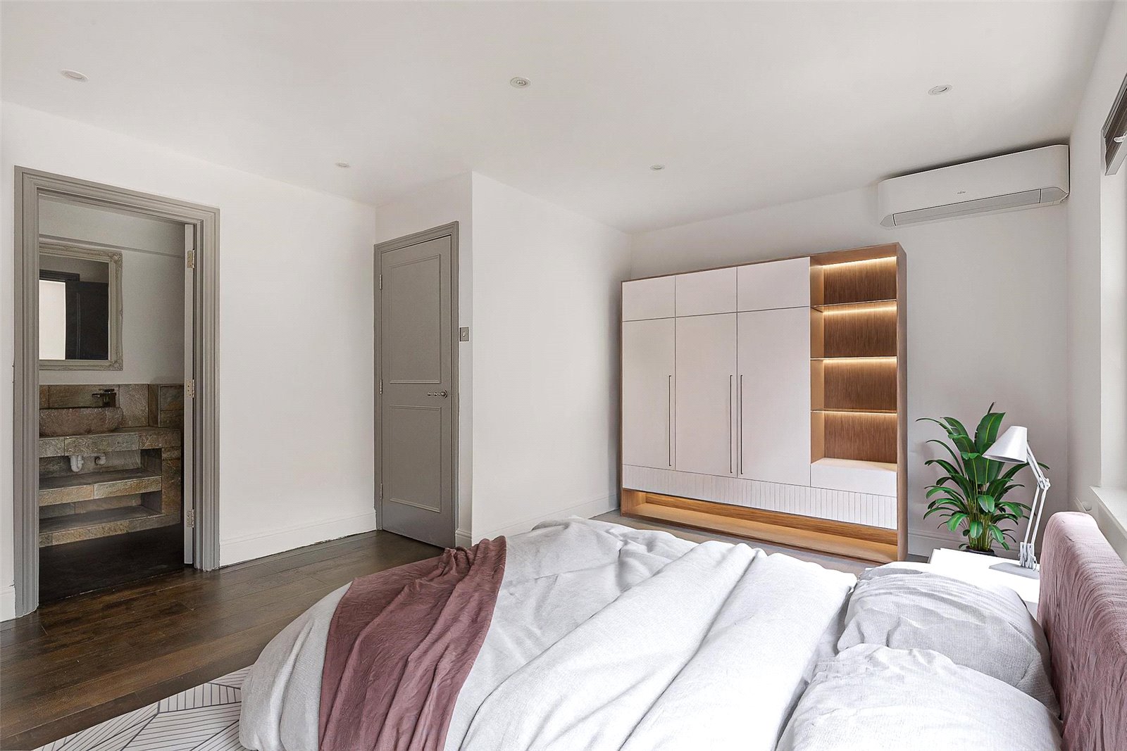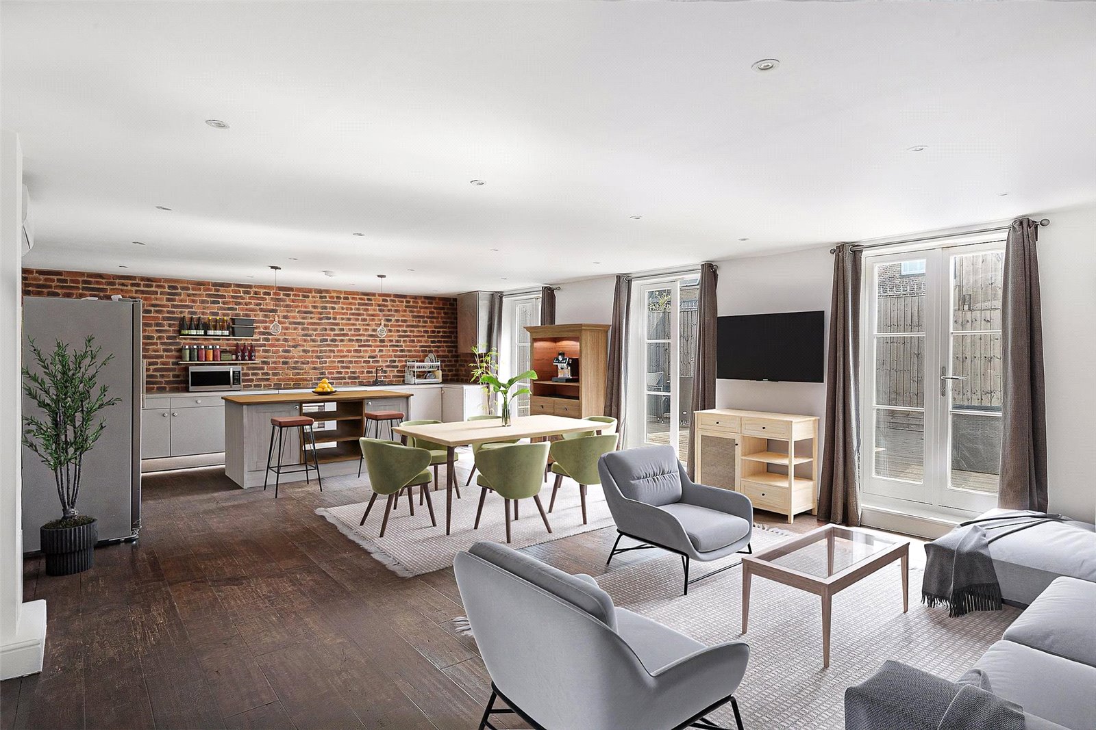 Ascending to the first floor, which spans over 900 square feet, you will discover two double bedrooms and two impeccably designed bathrooms. These bathrooms boast washbasins crafted from natural volcanic rock sourced from Indonesia, their elegant integration with the countertops creating a seamless and visually stunning effect thanks to the stone's brown colour and distinctive texture. One of the bathrooms graces the master bedroom, serving as a private oasis of luxury. The furniture in these intimate spaces is meticulously designed to offer both functionality and a sense of revitalizing energy. Continuing on this floor, the open plan living space unfolds, encompassing the kitchen and dining area. Bathed in abundant natural light streaming through expansive window walls, this area exudes a sense of open, airy elegance. The kitchen, with its sleek and contemporary design, harmoniously blends practicality and aesthetics. It boasts clean lines, integrated appliances, and a captivating, exposed brick wall that has been transformed into a striking architectural feature. This culinary domain seamlessly merges modern design with the traditional mews heritage of the home. Adding to the comfort and convenience, air conditioning units are strategically placed throughout the first floor, ensuring a pleasant environment even on the warmest summer days.