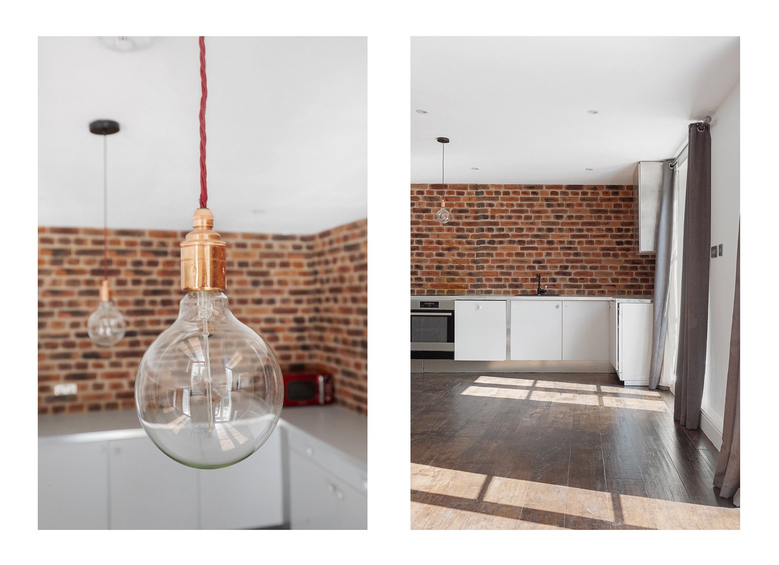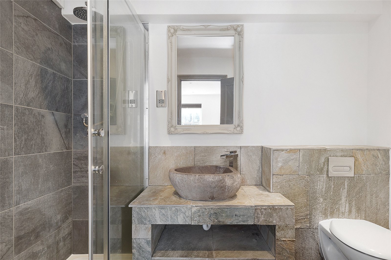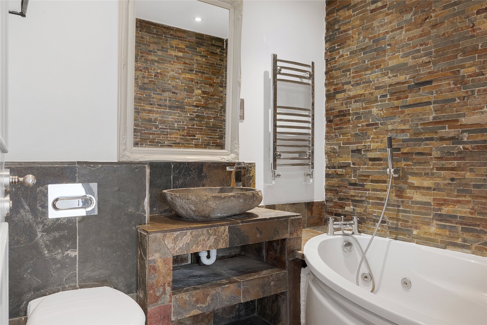 Ascending to the first floor, which spans over 900 square feet, you will discover two double bedrooms and two impeccably designed bathrooms. These bathrooms boast washbasins crafted from natural volcanic rock sourced from Indonesia, their elegant integration with the countertops creating a seamless and visually stunning effect thanks to the stone's brown colour and distinctive texture. One of the bathrooms graces the master bedroom, serving as a private oasis of luxury. The furniture in these intimate spaces is meticulously designed to offer both functionality and a sense of revitalizing energy. Continuing on this floor, the open plan living space unfolds, encompassing the kitchen and dining area. Bathed in abundant natural light streaming through expansive window walls, this area exudes a sense of open, airy elegance. The kitchen, with its sleek and contemporary design, harmoniously blends practicality and aesthetics. It boasts clean lines, integrated appliances, and a captivating, exposed brick wall that has been transformed into a striking architectural feature. This culinary domain seamlessly merges modern design with the traditional mews heritage of the home. Adding to the comfort and convenience, air conditioning units are strategically placed throughout the first floor, ensuring a pleasant environment even on the warmest summer days.