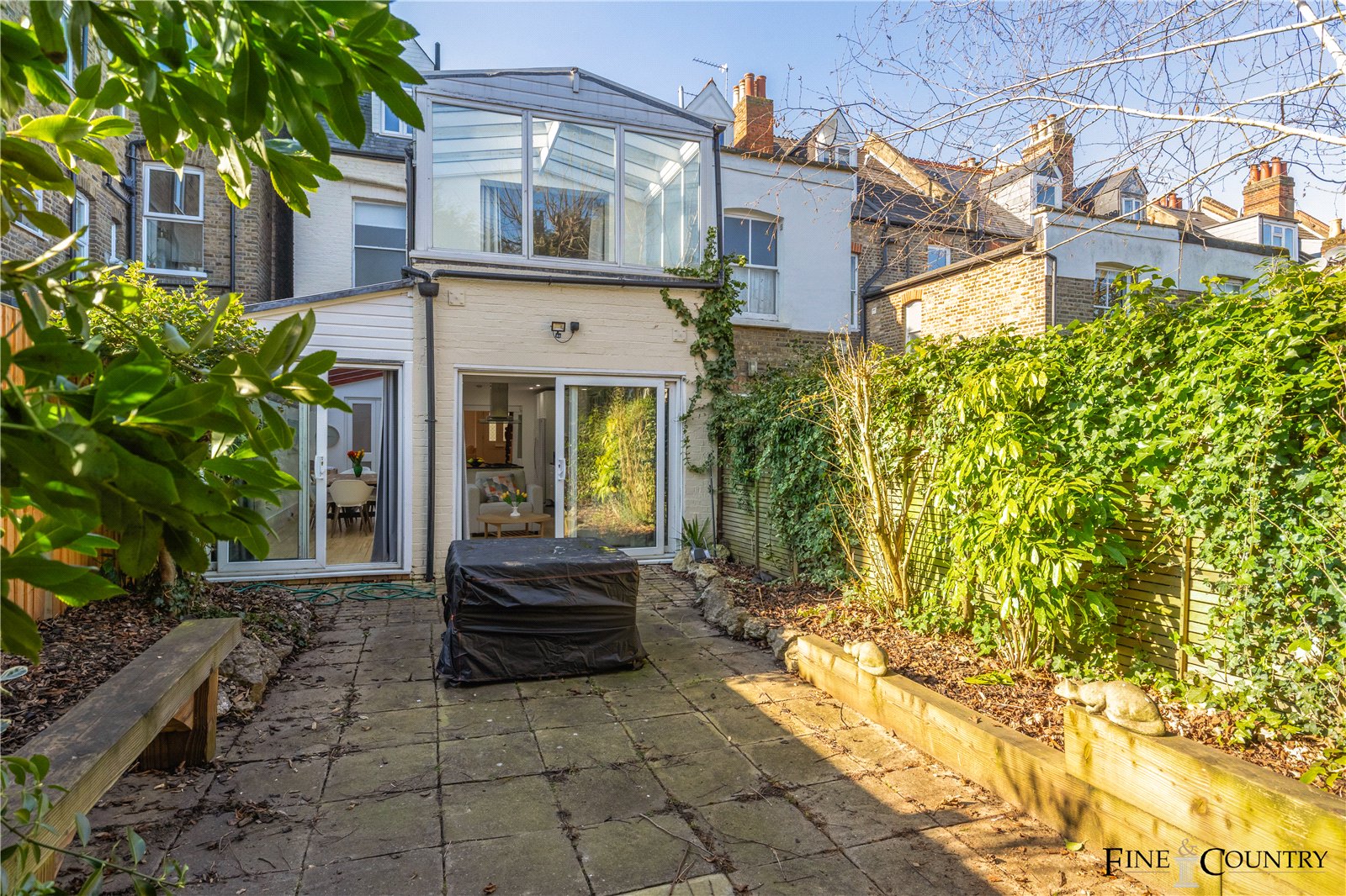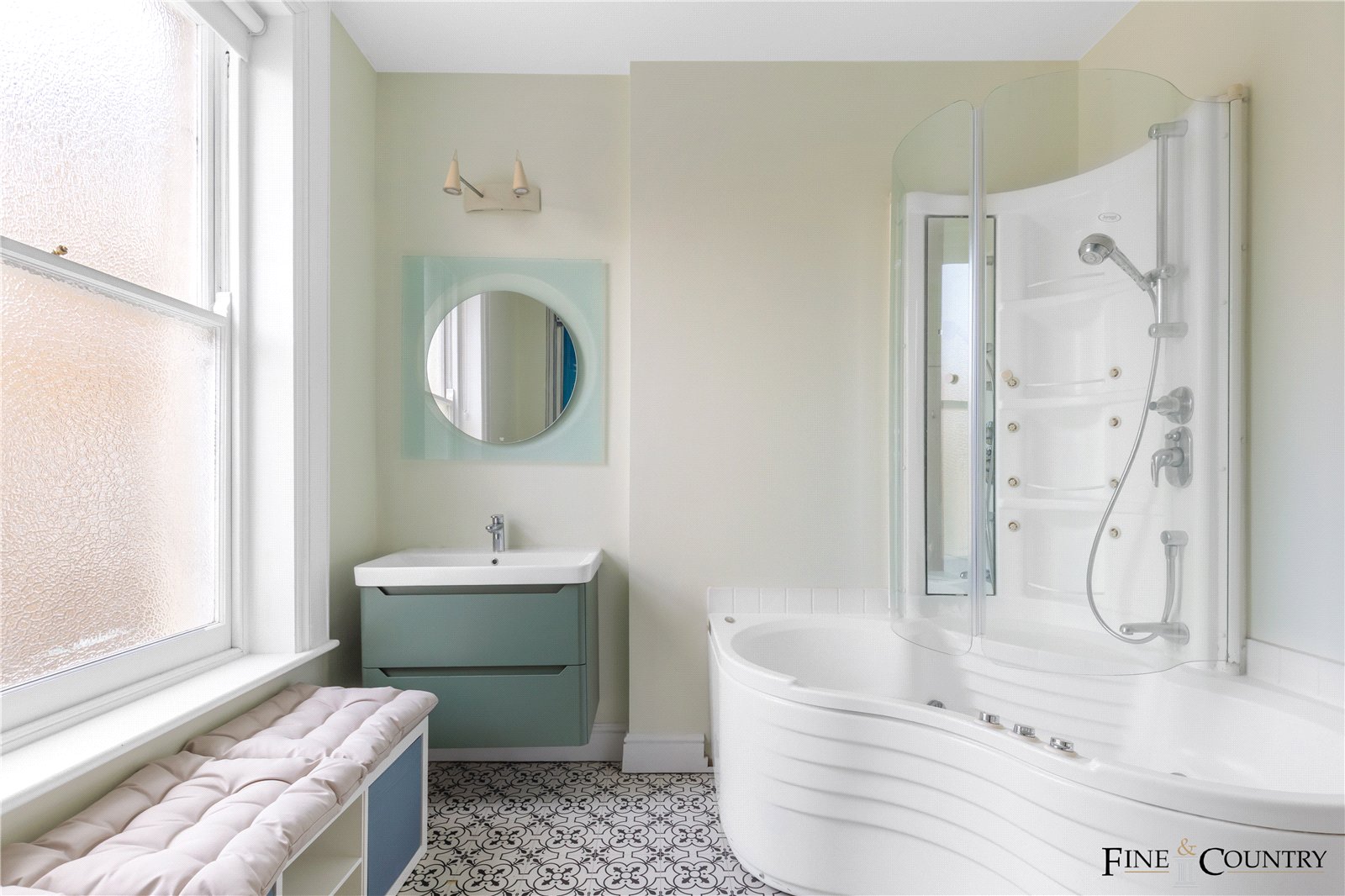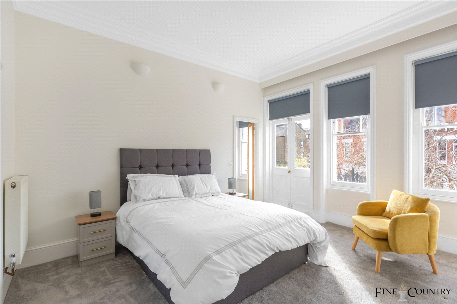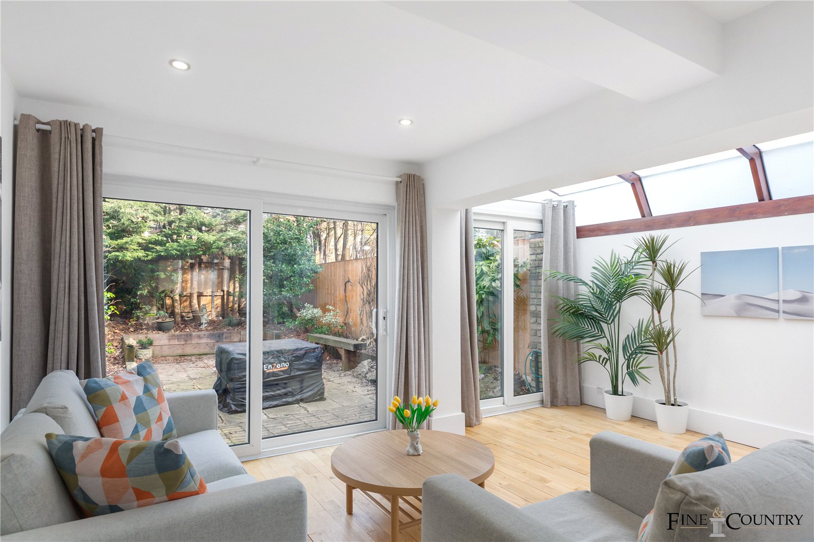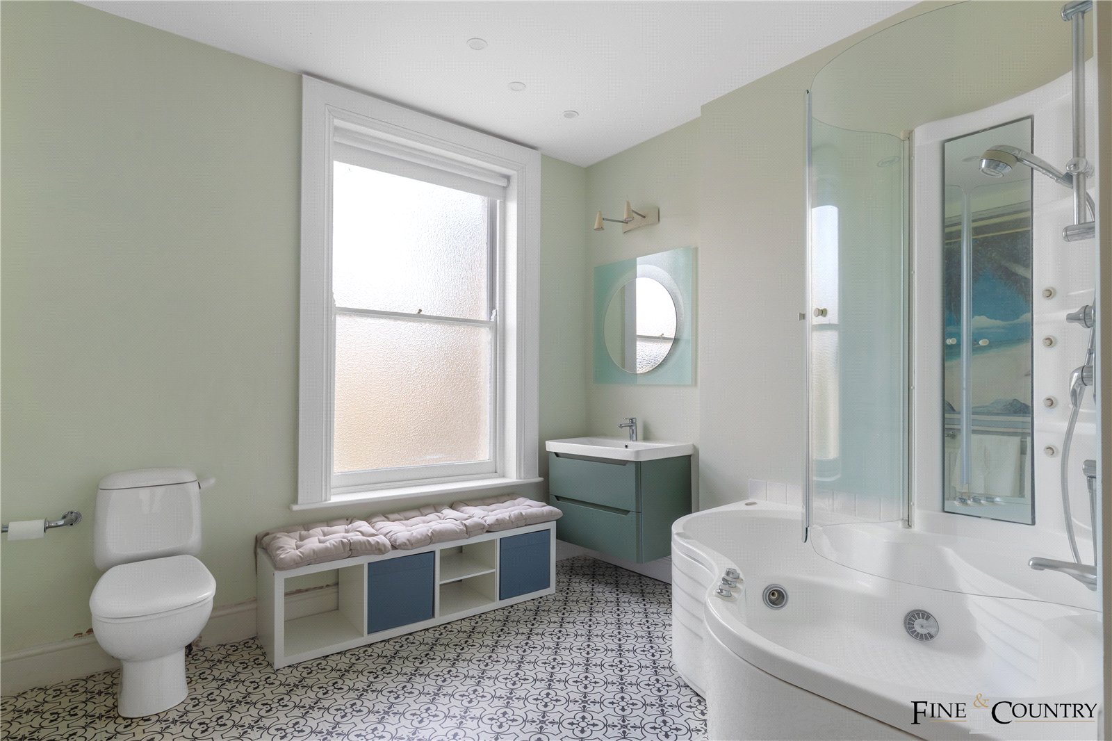 The first floor is a testament to modern luxury, hosting the principal bedroom complete with a sophisticated en-suite, a bespoke dressing room, and a quaint balcony adorned with decorative Victorian-era railings perfect for savouring your morning coffee. The accompanying large double bedroom, also with an en-suite, benefits from an extended window alcove, creating a cosy nook for relaxation and offering captivating garden views, enhancing the home's external charm.