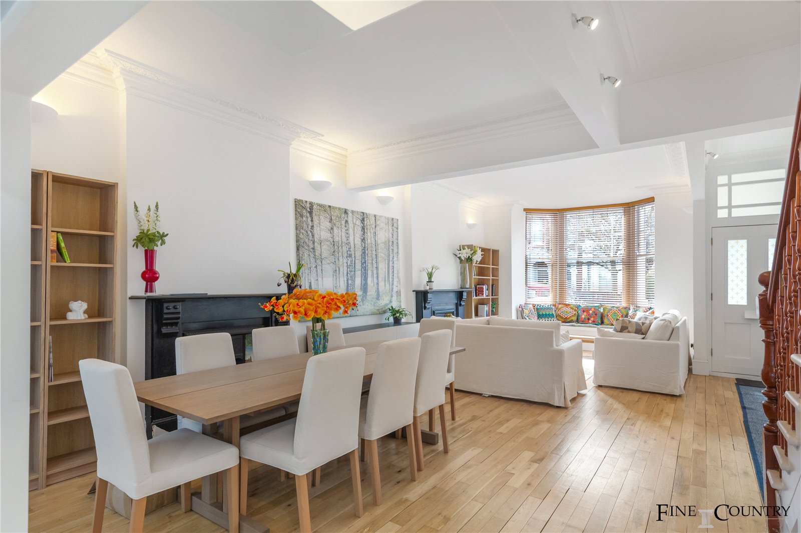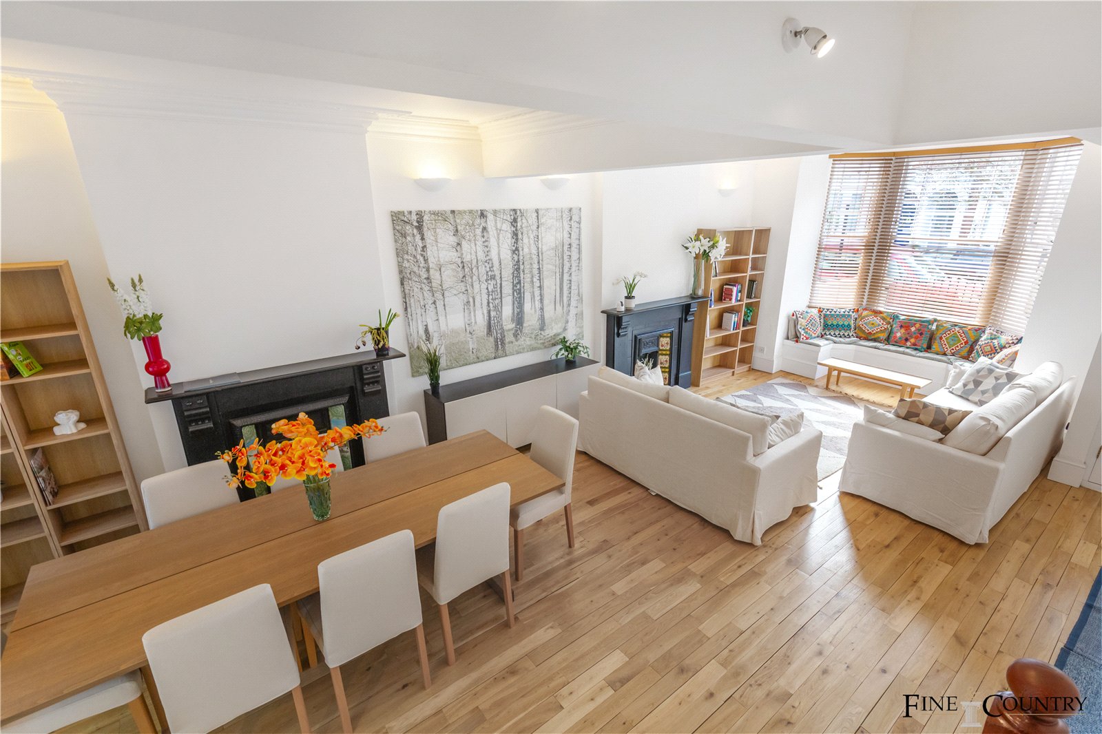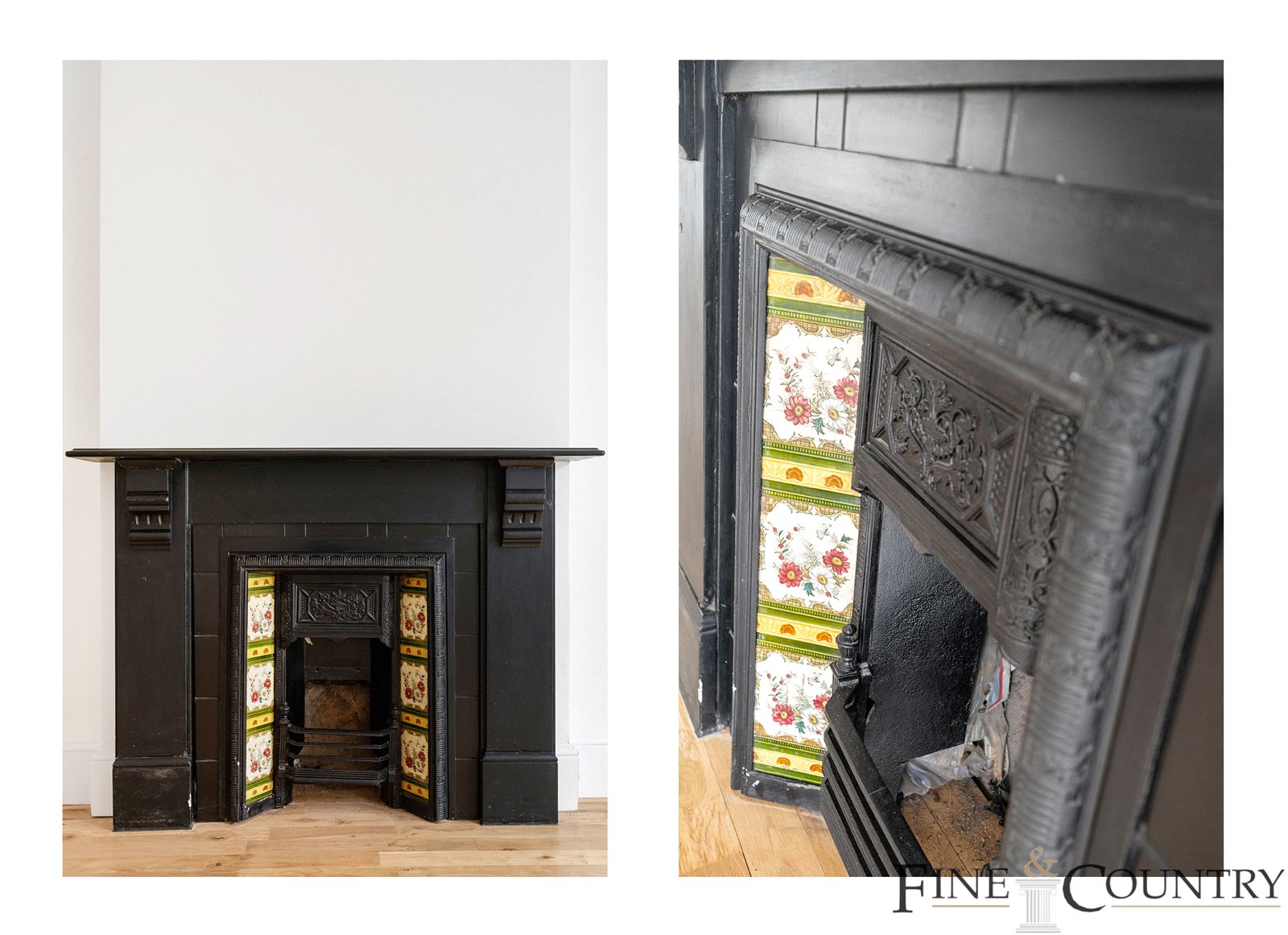 As you approach this exquisite residence, a neatly paved front garden guides you to a charming stained-glass front door, opening to reveal a breath-taking open-plan reception room. This stunning space is defined by high ceilings, elegant wood flooring, and an abundance of natural light cascading through the majestic bay windows. The room is further graced with a pair of cast iron fireplaces adorned with floral patterns, echoing the Victorian era's distinctive charm.
