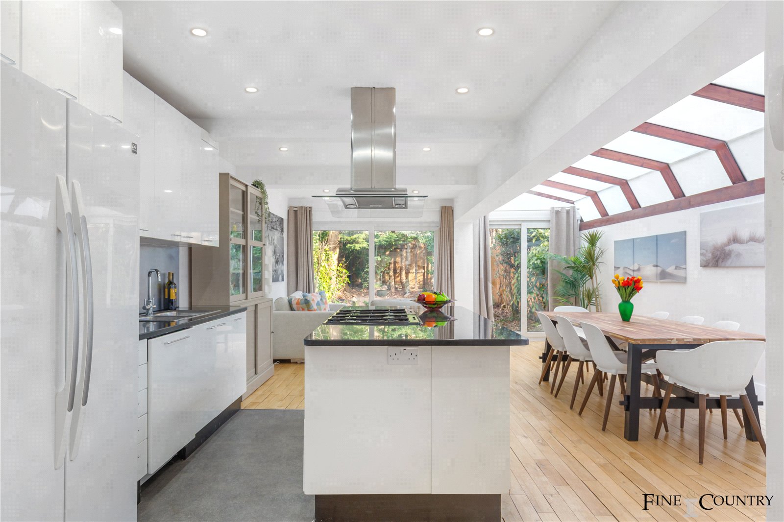 The kitchen area extends gracefully into a spacious kitchen-diner-reception area, creating an open, airy atmosphere that is both welcoming and luxurious. The inclusion of a glass side return is a stroke of architectural genius, allowing natural light to flood the space, enhancing the linear design elements and contemporary feel. This feature not only maximizes daylight but also provides a seamless integration with the outdoors, leading directly out to the garden. The overall effect is one of harmonious balance, where modern design aesthetics and functional living spaces coalesce, creating a sophisticated and inviting environment perfect for both relaxing and entertaining.