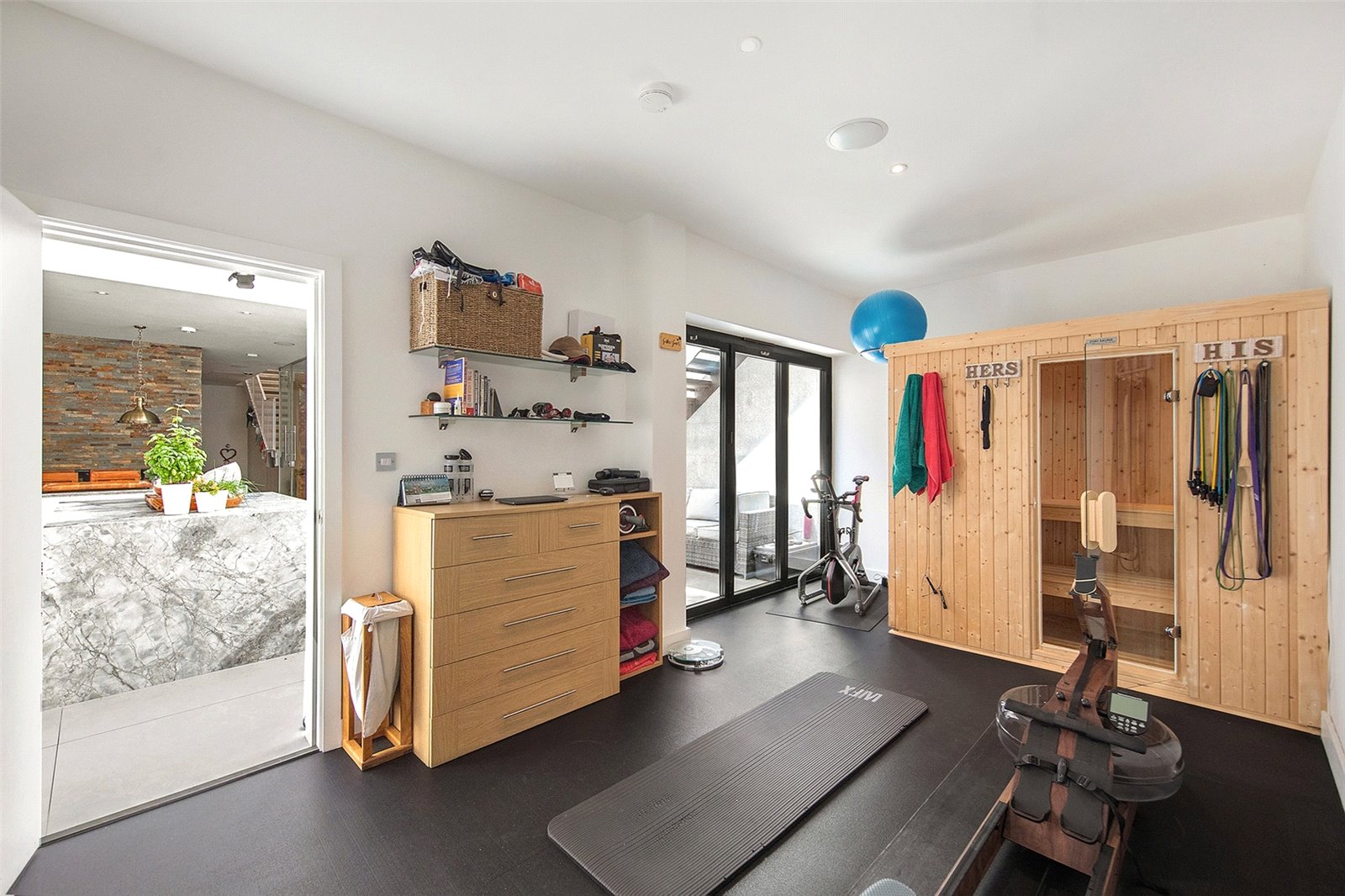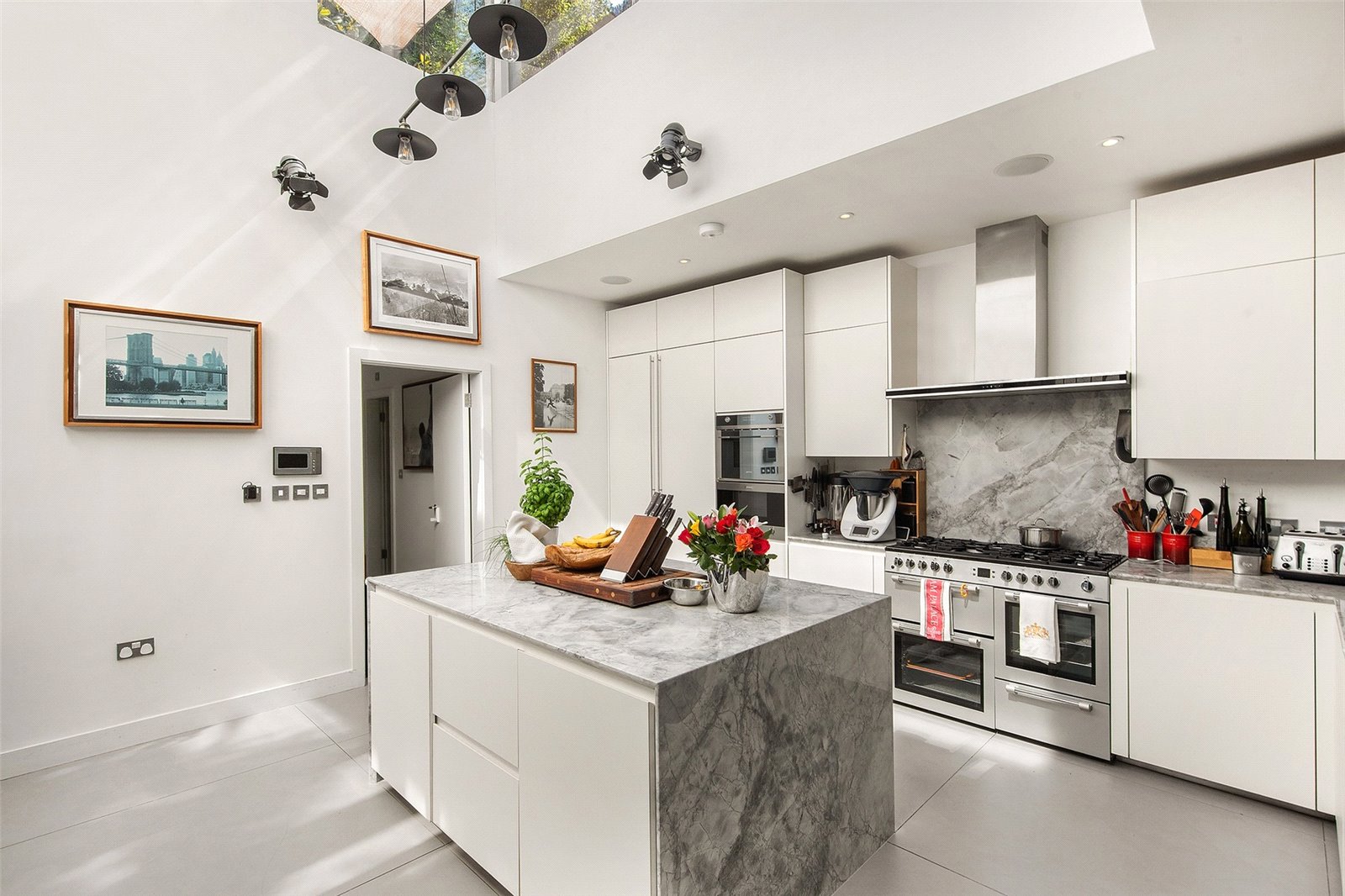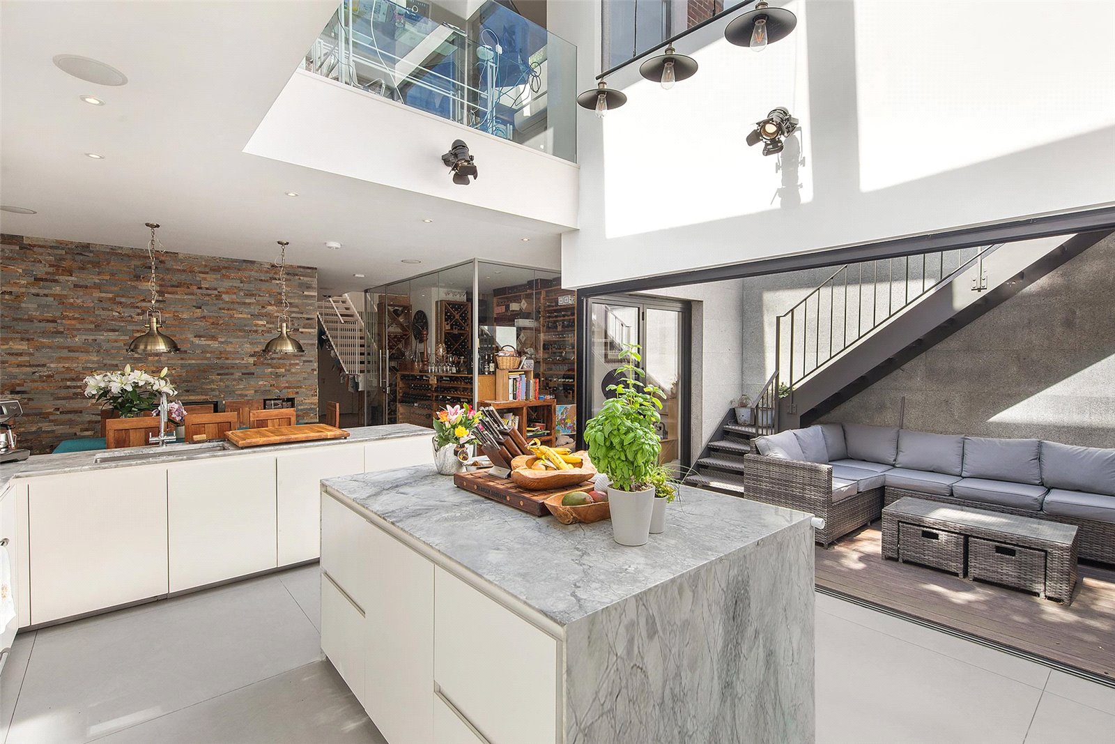 As you descend the beautiful staircase, you are welcomed into the lower ground floor which spans over 1500 square feet in size. To the front of the lower ground floor, there is a sizeable bedroom complete with an en-suite bathroom and a light well providing natural light and ventilation. The second reception room spanning over 20 feet in length is separated by a feature wall which leads into the truly breath-taking kitchen, architecturally designed to maximise the ethereal light filtering through the glass ceiling overhead. The fully integrated modern kitchen with a central island marks the heartbeat of the home. To convey the ultimate design statement a unique collection of wines is displayed within the frameless glass wine cellar. To the rear of the floor one can enjoy the gym studio, equipped with its own wet room and a sauna to end a workout in a relaxing way. Off the kitchen and through the bi-folding doors, you will find a patio area ideal for dining and entertaining with stairs leading back up to the garden.
