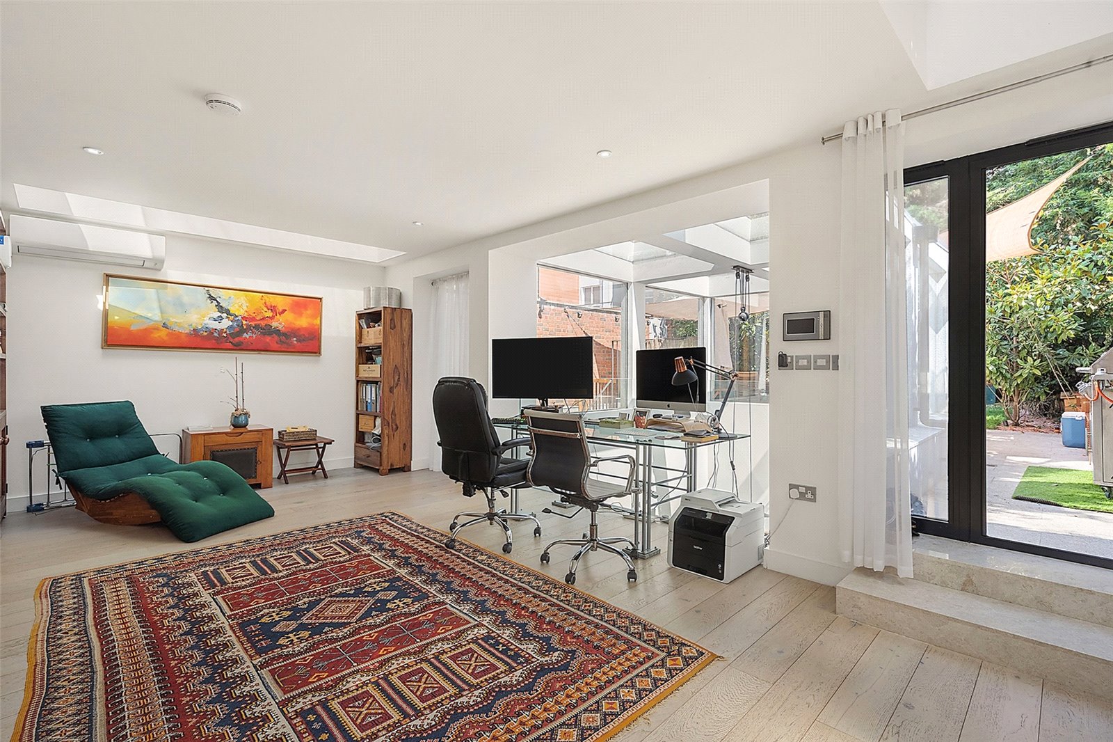 Set off the beautiful tree-lined Parsifal Road in a secluded pocket, the large wide front door welcomes you into the ground floor of this stunning home. The first bedroom, complete with an en-suite bathroom is located to the right of the entrance hall as is the guest WC, befitting of any modern home. As you advance into the versatile reception room spanning 30ft in length you benefit from a variety of living spaces within a single volume. The front aspect serves as a formal lounge area whilst at the rear there is an office nook as well as a designated cosy reading corner. The ground floor also provides views and access to the stunning south facing garden as well as a uniquely designed aerial view of the kitchen.