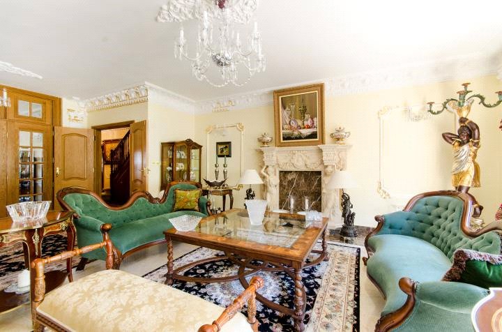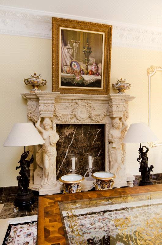 This expansive reception room at the rear is complete with a bespoke gold marble fireplace whose grandeur can only be appreciated in person.