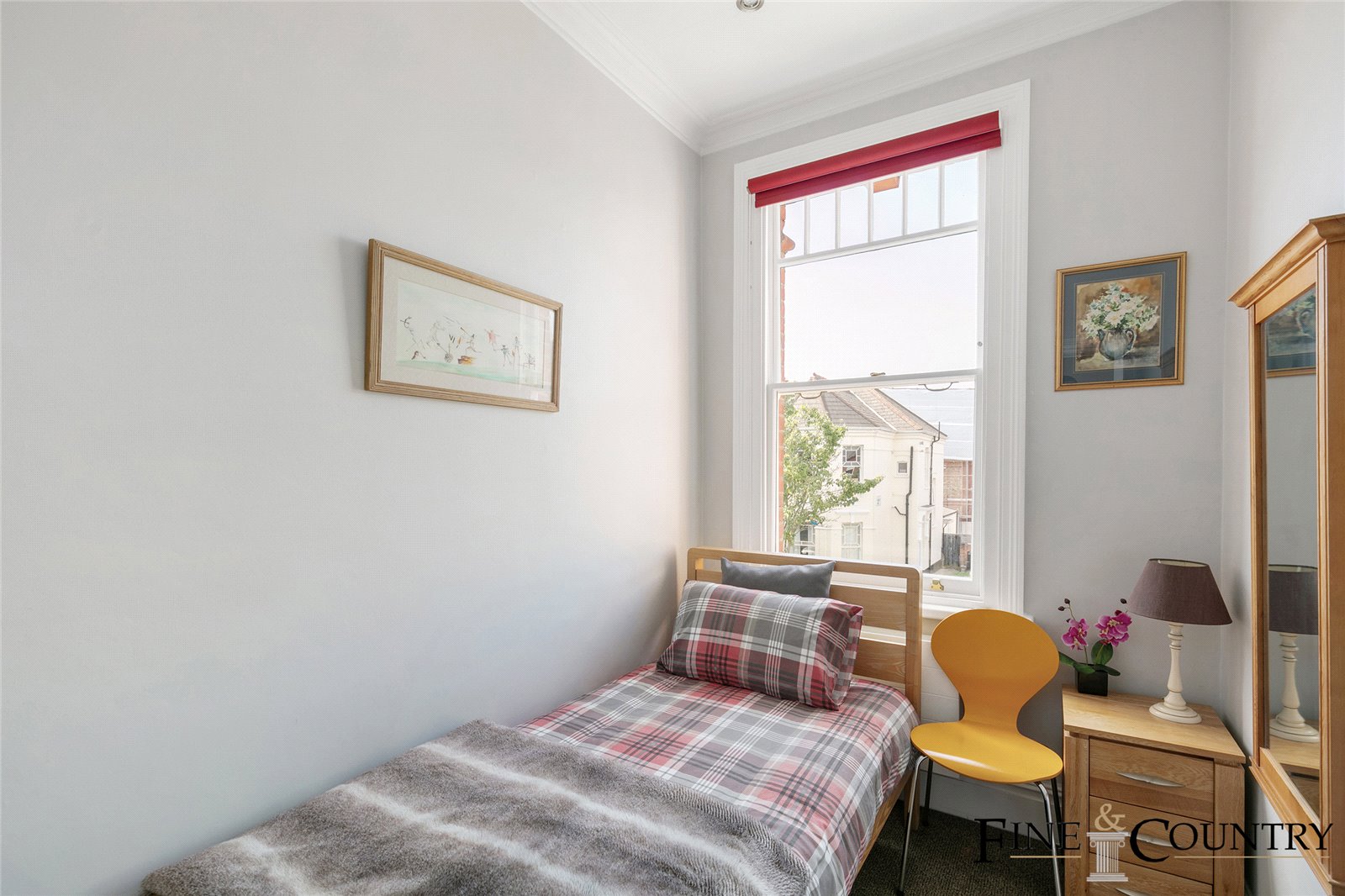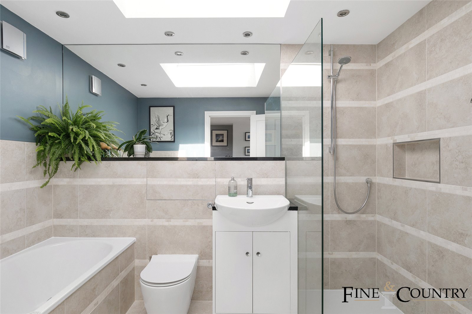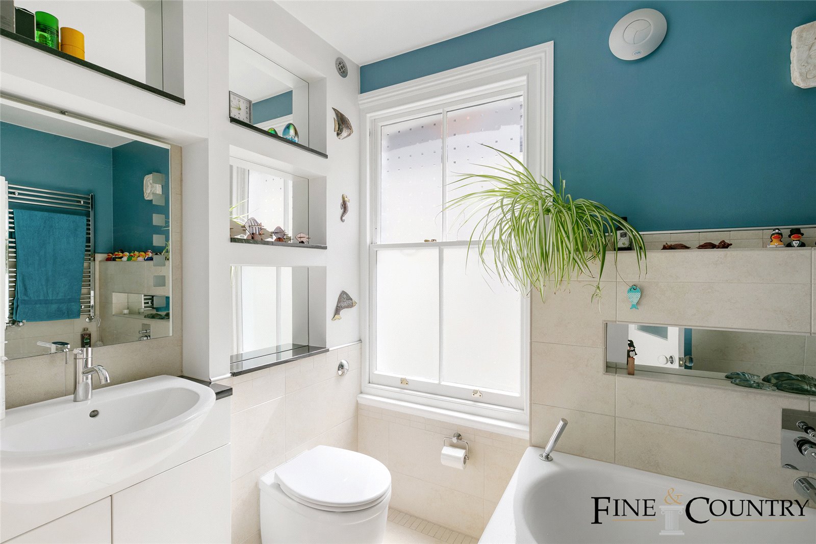 Large, retrofitted double-glazed sash windows ensure ample natural light throughout the day, contributing to the bright and airy feel of each room. The main front bedroom includes a large built-in wardrobe and bespoke blinds for privacy, while the rear bedroom features a voluminous freestanding wardrobe. The single bedroom and the study are equipped with practical blinds. The family bathroom on this level is designed with a blend of practicality and style, featuring ceramic stone-effect tiled flooring, a full-length enamelled steel bath, a ceramic sink set into a black granite countertop, and a back-to-wall toilet. It also includes a heated towel rail that can function independently through an electric element, and the room is comfortably warmed with electric underfloor heating. This space is ventilated by an electric fan and includes open shelving for additional storage.