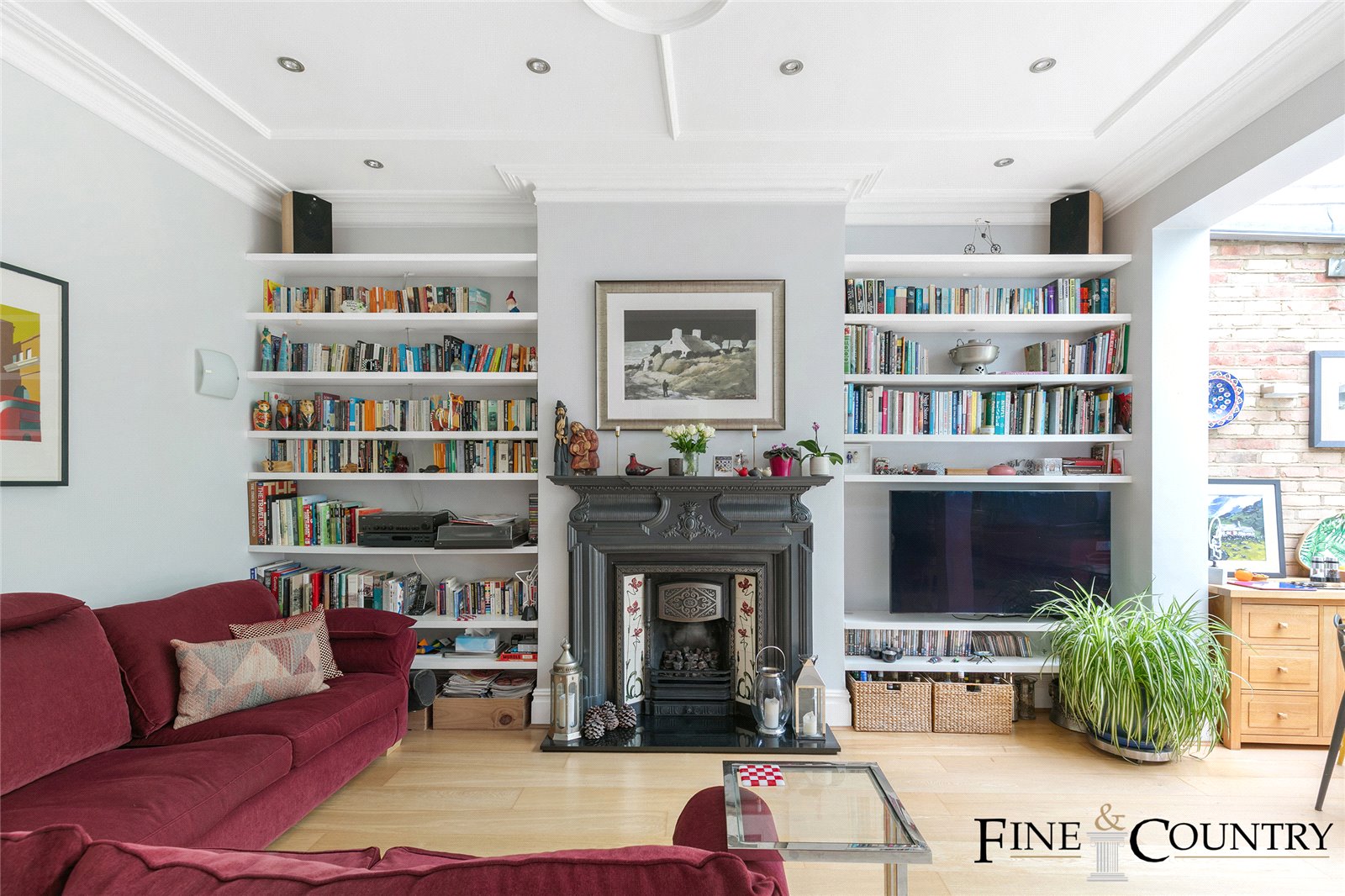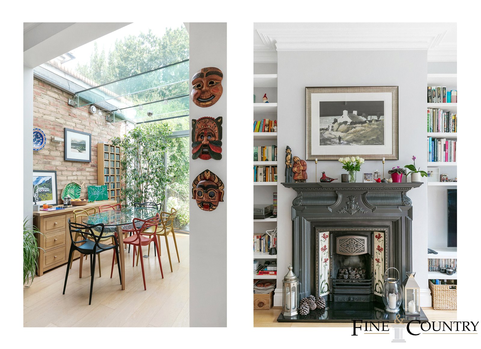 The dining space, distinguished by its structural glass ceiling, merges seamlessly with the kitchen, featuring the same laminate wooden flooring with underfloor heating, enhancing the openness and light of the area. This leads into the main living space where an original cast iron fireplace with a coal effect gas fire adds a touch of historical charm, perfectly complementing the modern comforts found throughout the home.