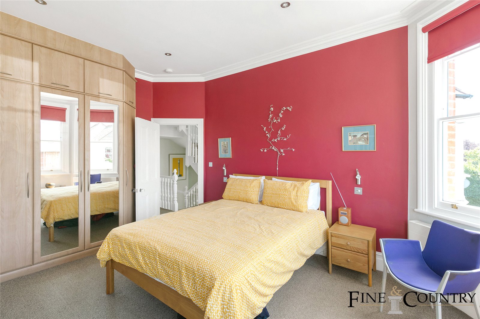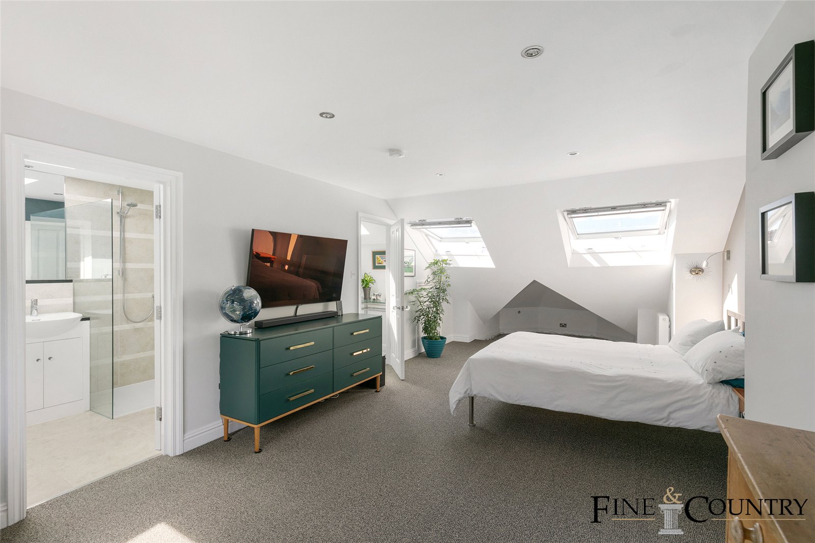 The second floor epitomises modern living, blending seamless functionality with architectural finesse. Accessible via a staircase designed to echo the original house style, this loft conversion features a main bedroom which exemplifies spacious tranquillity with its plush carpeting and tasteful decor. Its east-facing double-glazed doors open to early morning light, enhancing the serene ambiance. The room benefits from an innovative hip-to-gable conversion completed in 2019 by Modern Lofts, and it cleverly incorporates a significant storage space running the full length from front to back which can be accessible via the staircase or a ladder from the adjoining study.