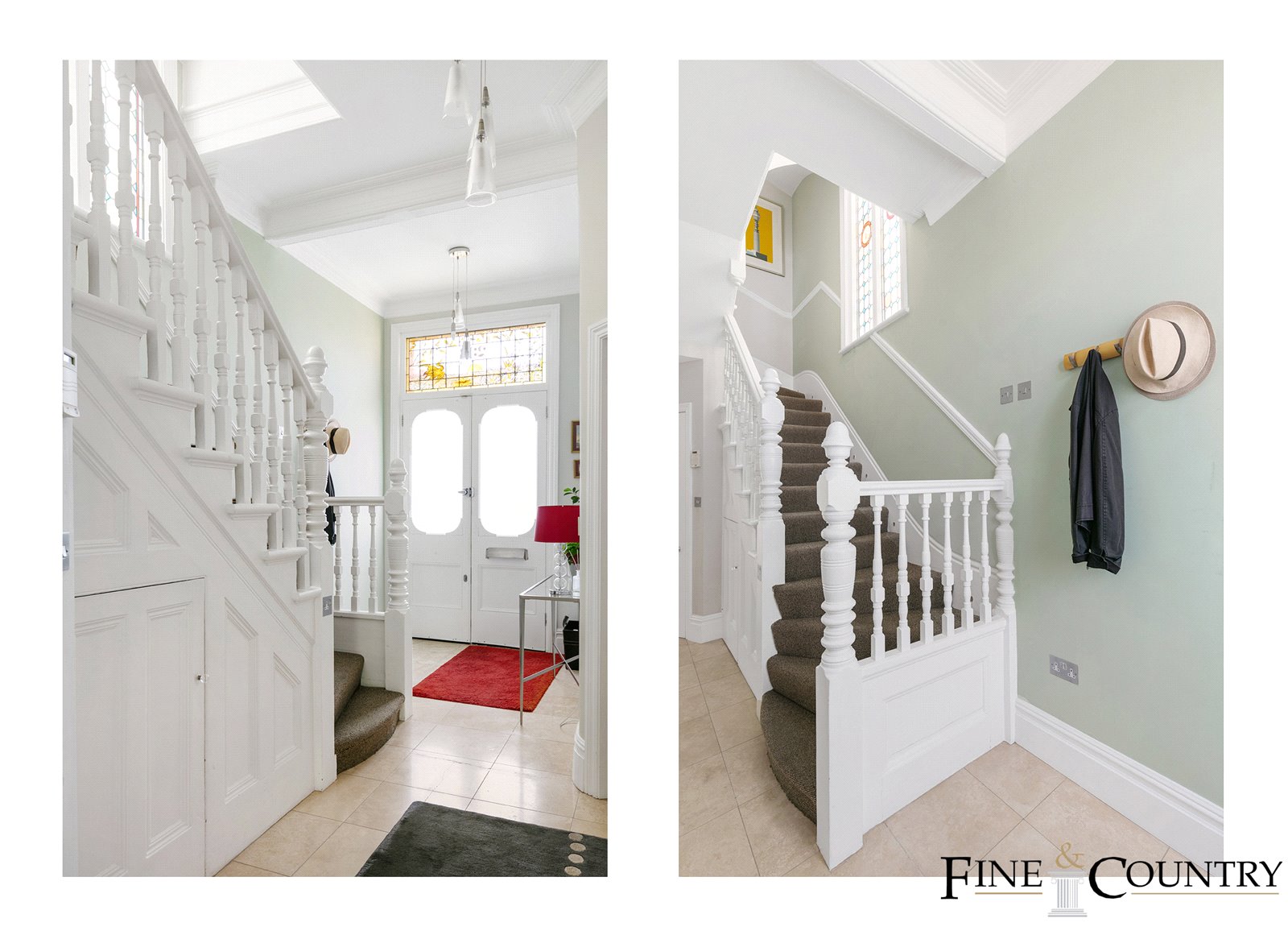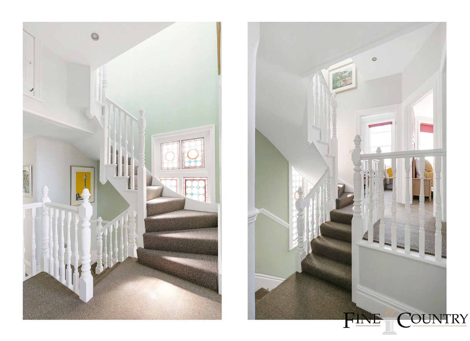 A dramatic architectural feature is found on the stairwell leading to this floora restored tall stained-glass window, now double-glazed, enhancing the historical charm of the property. The staircase, including the half landing leading to the front three bedrooms, is fully carpeted, echoing the home's overall theme of elegance and comfort.