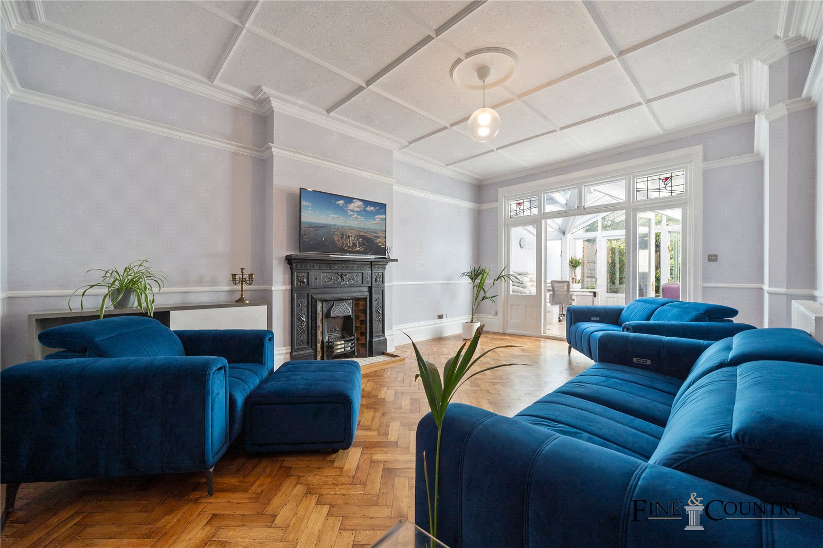 To the right of the entrance hall, a magnificent bay-fronted reception room combines elegance and scale. A cast-iron fireplace with bespoke shelving creates a refined focal point, while elaborate ceiling mouldings and a dado rail frame the space with period detail. Expansive sash windows in a wide bay allow light to cascade across the exposed timber flooring, making this an inviting room equally suited to formal entertaining or relaxed family gatherings. At the rear, a second reception room provides an equally impressive living space. Defined by elegant herringbone parquet flooring and a striking cast-iron fireplace, the room is bathed in light from French doors set beneath stained-glass transoms. These open seamlessly into a bright conservatory and onward to the 100 ft south-facing garden, creating a natural flow for entertaining and family living.