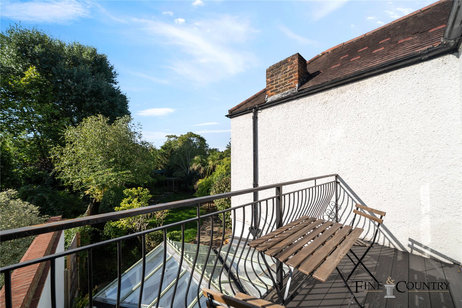 Upstairs, the first-floor hosts four well-proportioned bedrooms. The rear-facing principal bedroom is particularly impressive, capturing soft natural light, benefitting from garden views, and opening onto a private balcony a serene retreat. High ceilings, refined cornicing, and a grand period fireplace lend the room an unmistakable sense of Victorian sophistication, while its generous proportions provide ample room for seating or dressing areas.