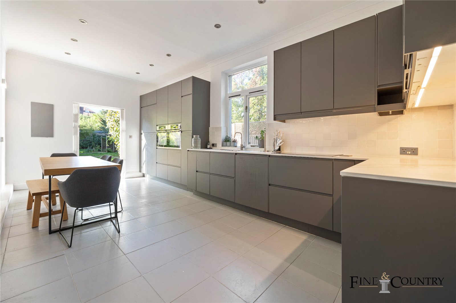 The kitchen has been modernised in sleek grey cabinetry with integrated appliances and crisp white worktops, providing a clean, contemporary counterpoint to the period features elsewhere. Large windows and a door onto the garden fill the space with natural light, while ample room for dining makes it the hub of the home. A guest WC and utility room complete the ground floor.