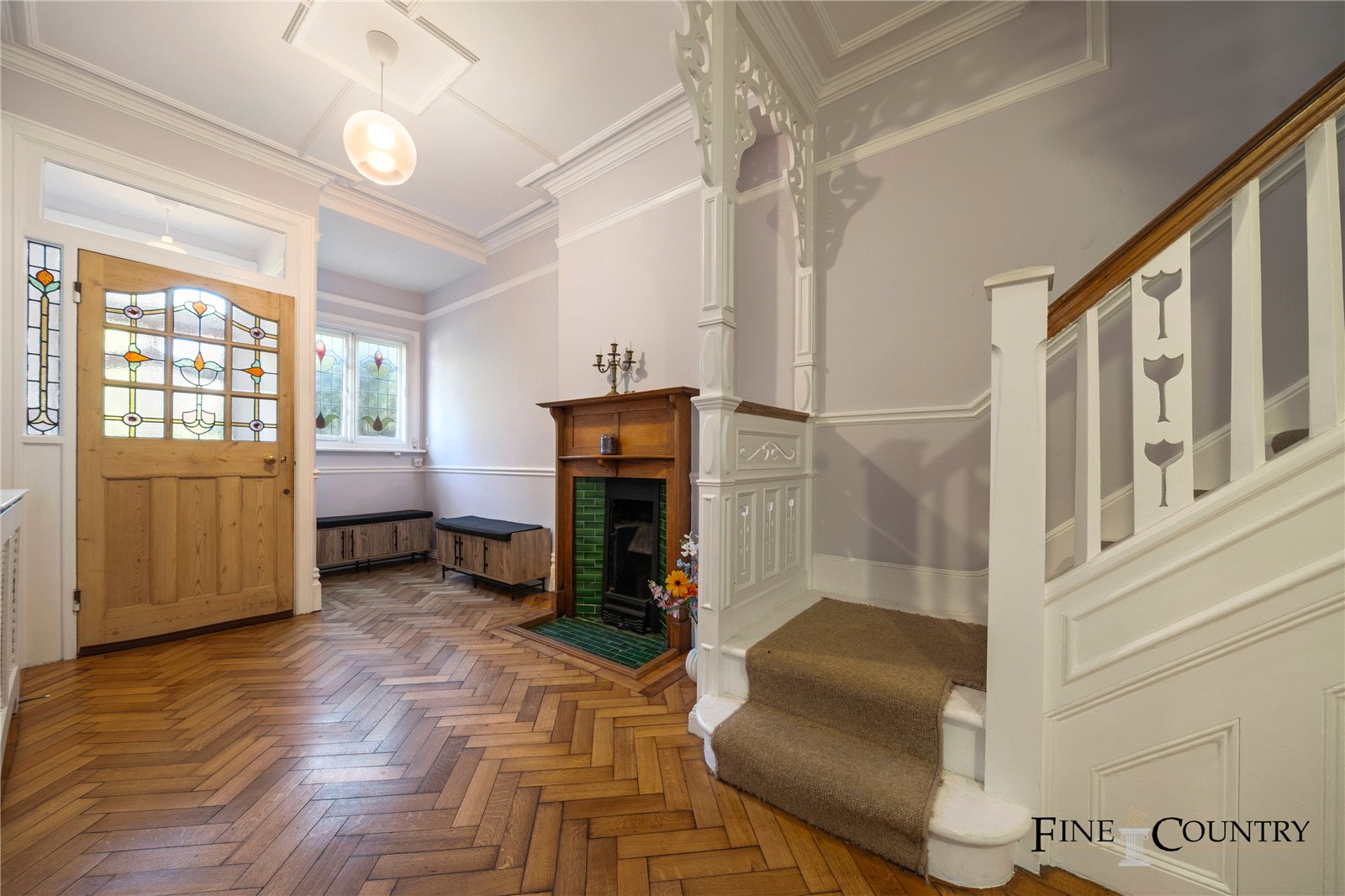 Set back from the road, the house opens through original panelled front doors into an exceptionally wide entrance hall. Period details abound, with decorative archwork and a green-tiled fireplace anchoring the space. A sweeping staircase with carved balustrade rises elegantly, setting the tone for the character within.