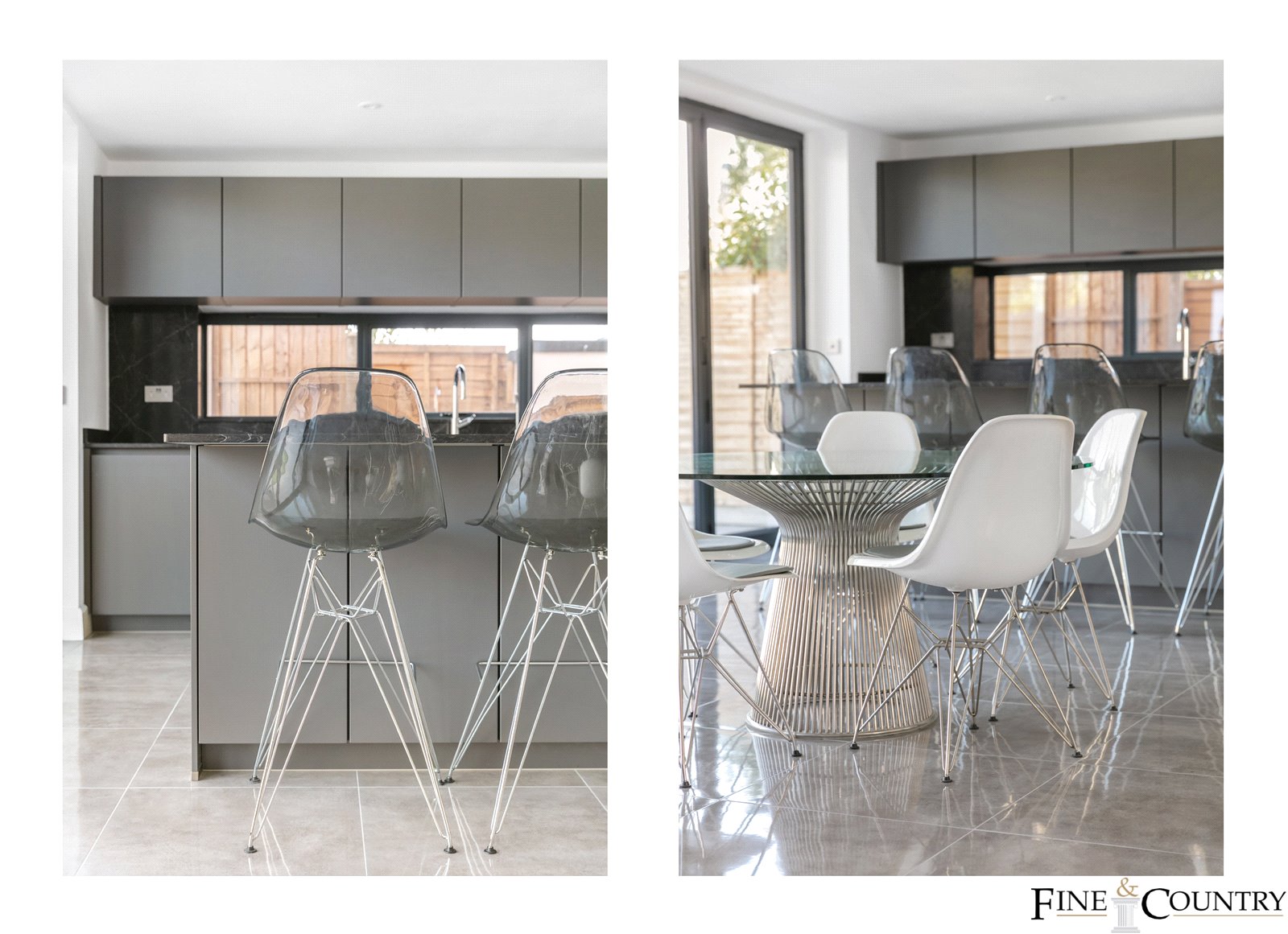 The kitchen itself stands as a true masterpiece, boasting a contemporary and avant-garde appeal. Architecturally linear in design, it combines clean lines with exceptional functionality. Meticulously crafted cabinetry, complemented by quartz countertops, maximizes workspace and storage, creating a sense of spaciousness and lending a modern, minimalist, and stylish allure. Integrated appliances further elevate the kitchen's utility, while the freestanding island and breakfast bar enhance the social aspect of this remarkable space. Additionally, a guest WC and utility room cater to the needs of modern family living, with the utility room providing convenient access to the garden.